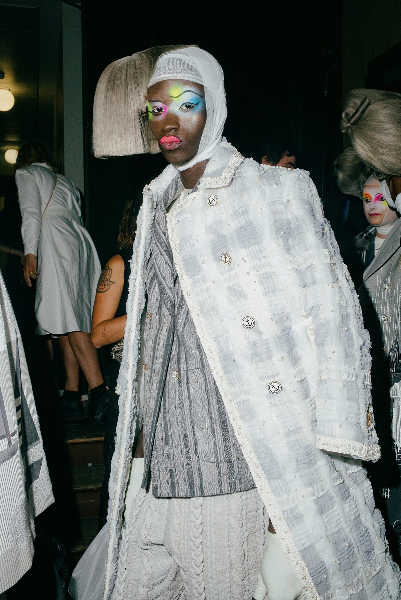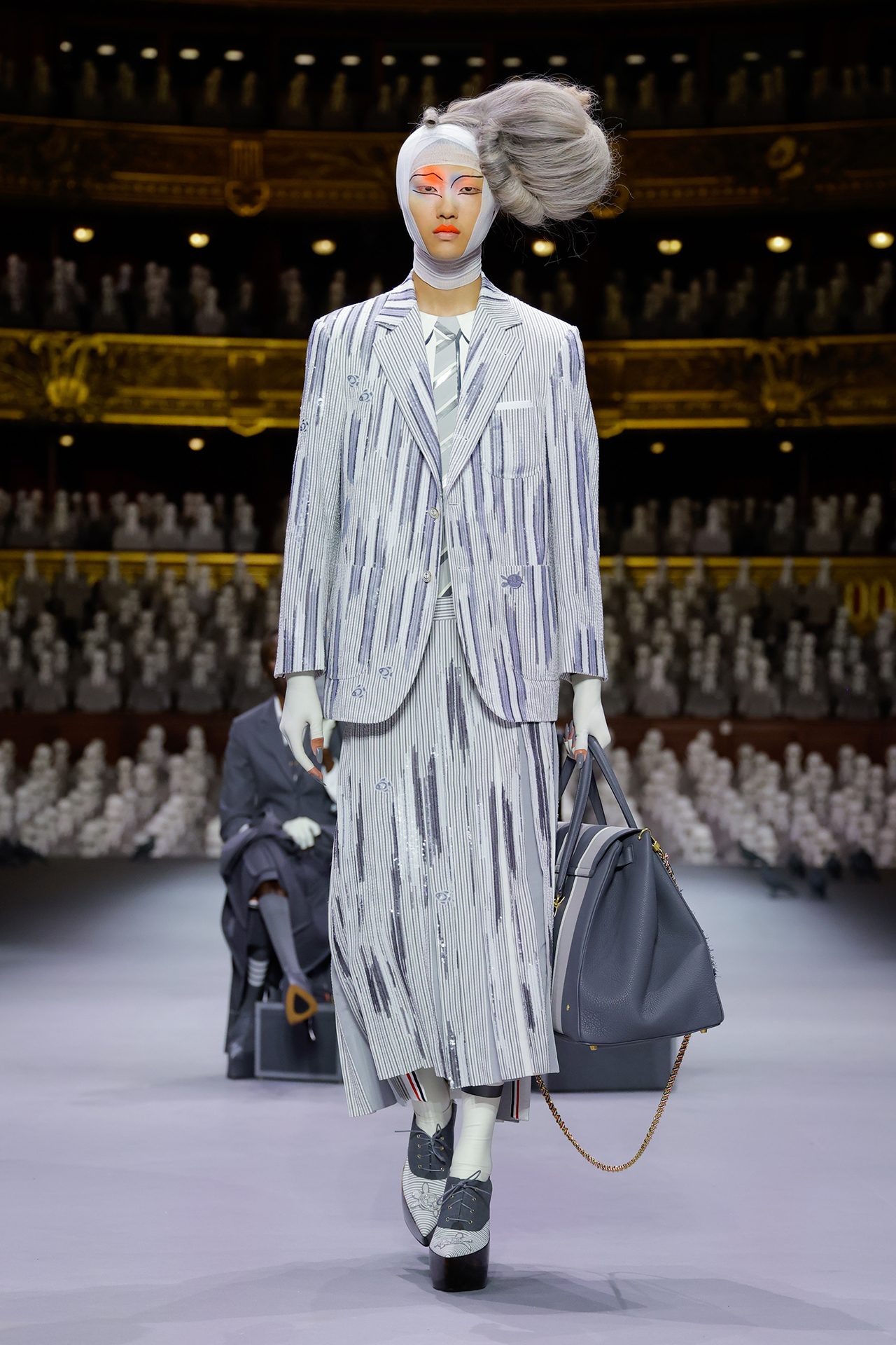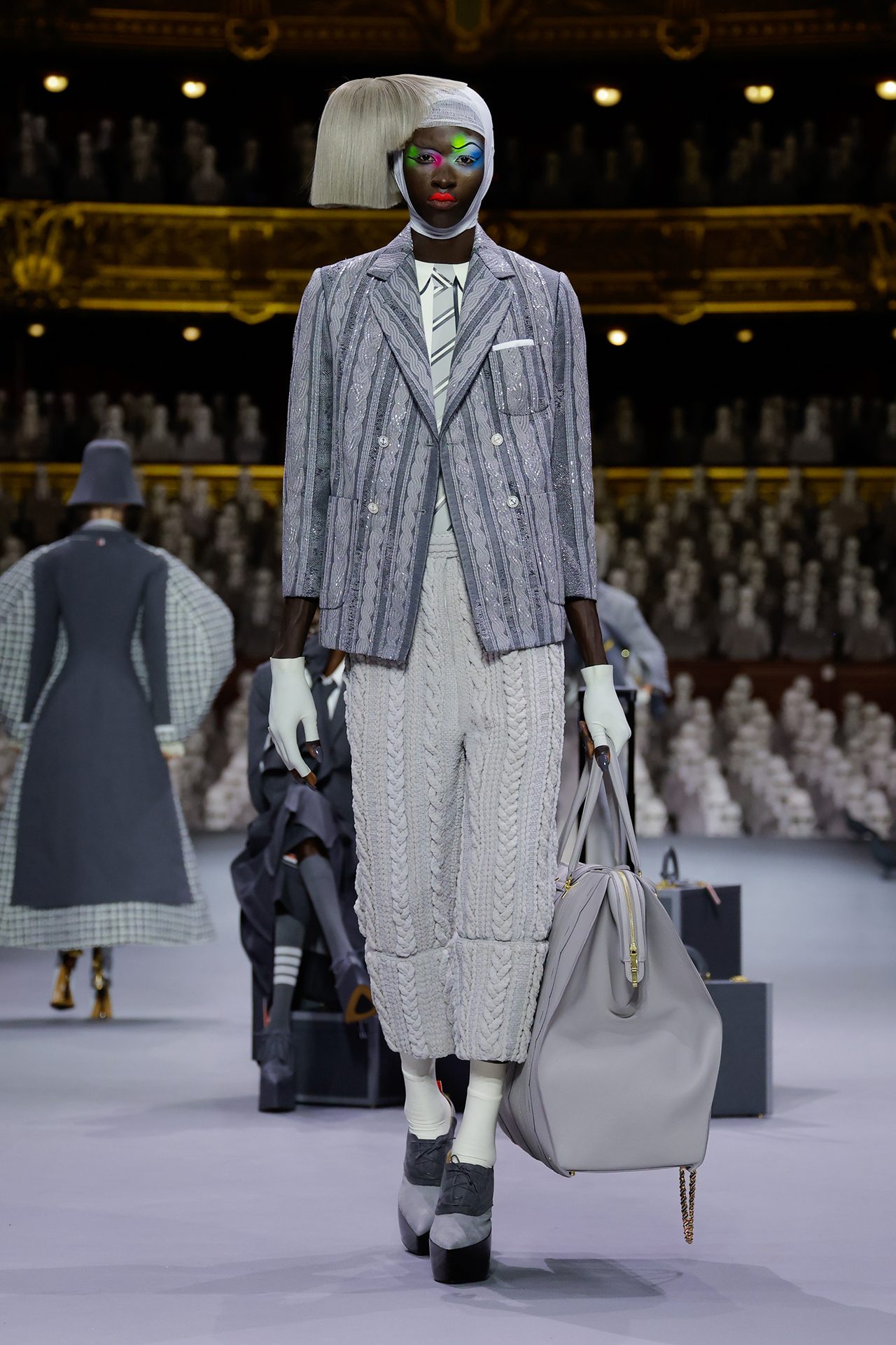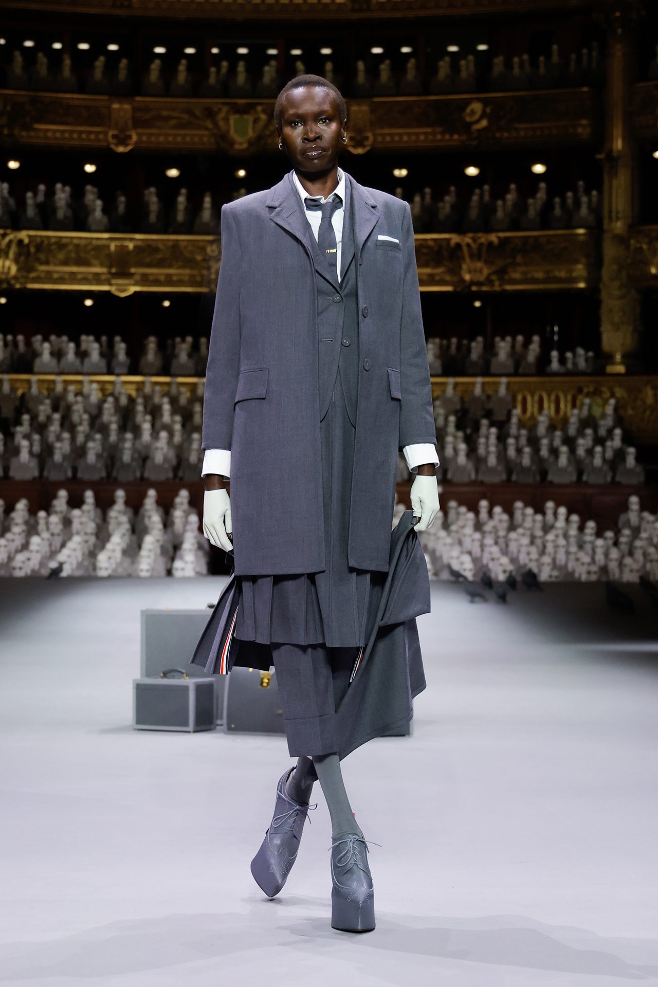 これまで THOM BROWNE のコレクションでは、「シンデレラ」や「星の王子さま」をモチーフにショーを開催しており、今回のテーマとなったのは、1人の旅行客。アップテンポの曲調の中に登場したのは、ロープドショルダーのジャケットとプリーツスカートを身に包んだ2人のポーター。そしてウールのグレースーツを着た乗客の Alek Wek が、グレーのベールに包まれた駅に迷い込み、ショーの幕開けを告げた。