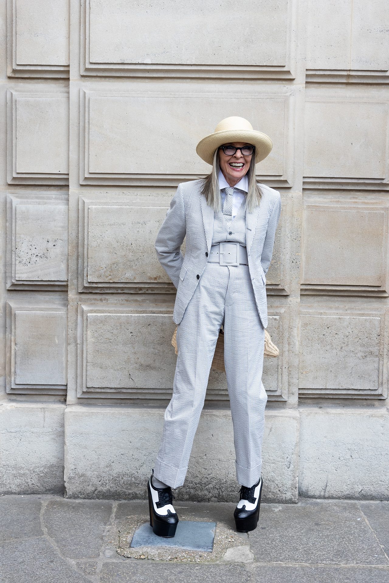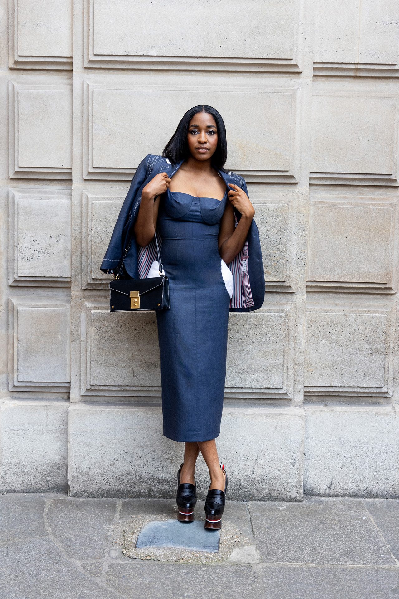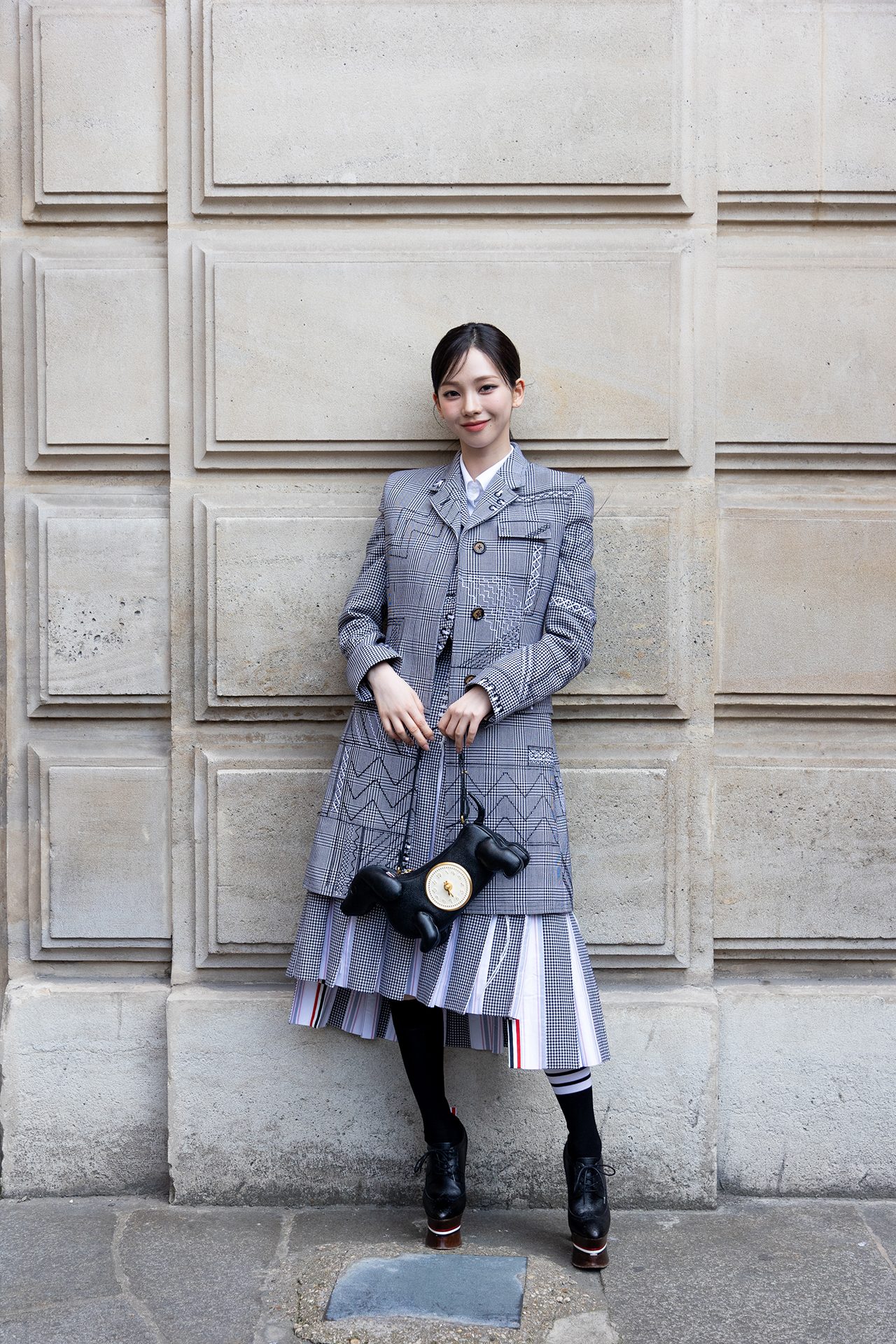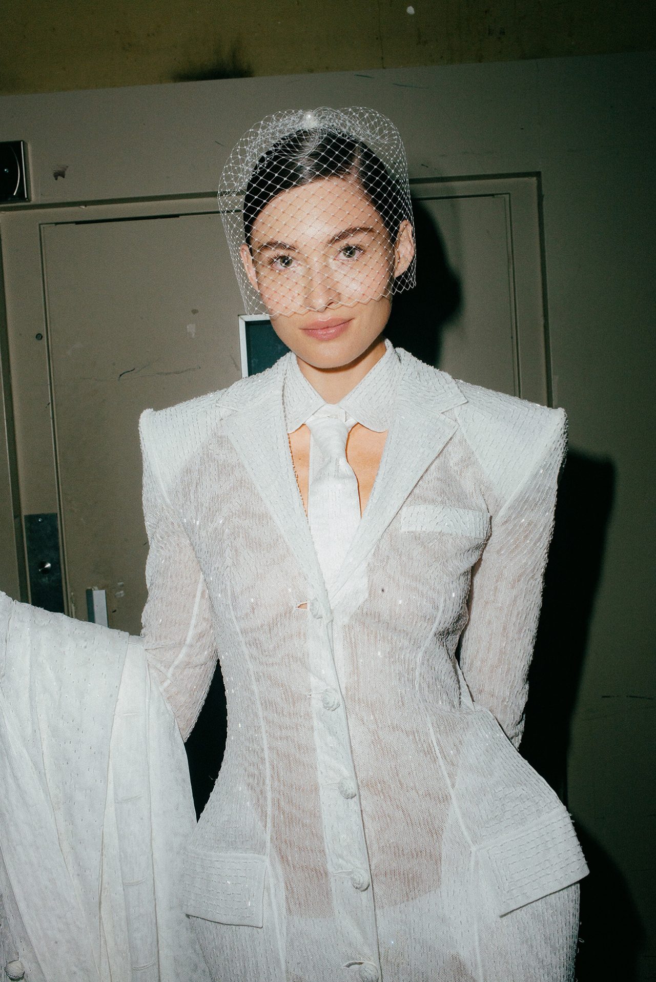 これまで THOM BROWNE のコレクションでは、「シンデレラ」や「星の王子さま」をモチーフにショーを開催しており、今回のテーマとなったのは、1人の旅行客。アップテンポの曲調の中に登場したのは、ロープドショルダーのジャケットとプリーツスカートを身に包んだ2人のポーター。そしてウールのグレースーツを着た乗客の Alek Wek が、グレーのベールに包まれた駅に迷い込み、ショーの幕開けを告げた。