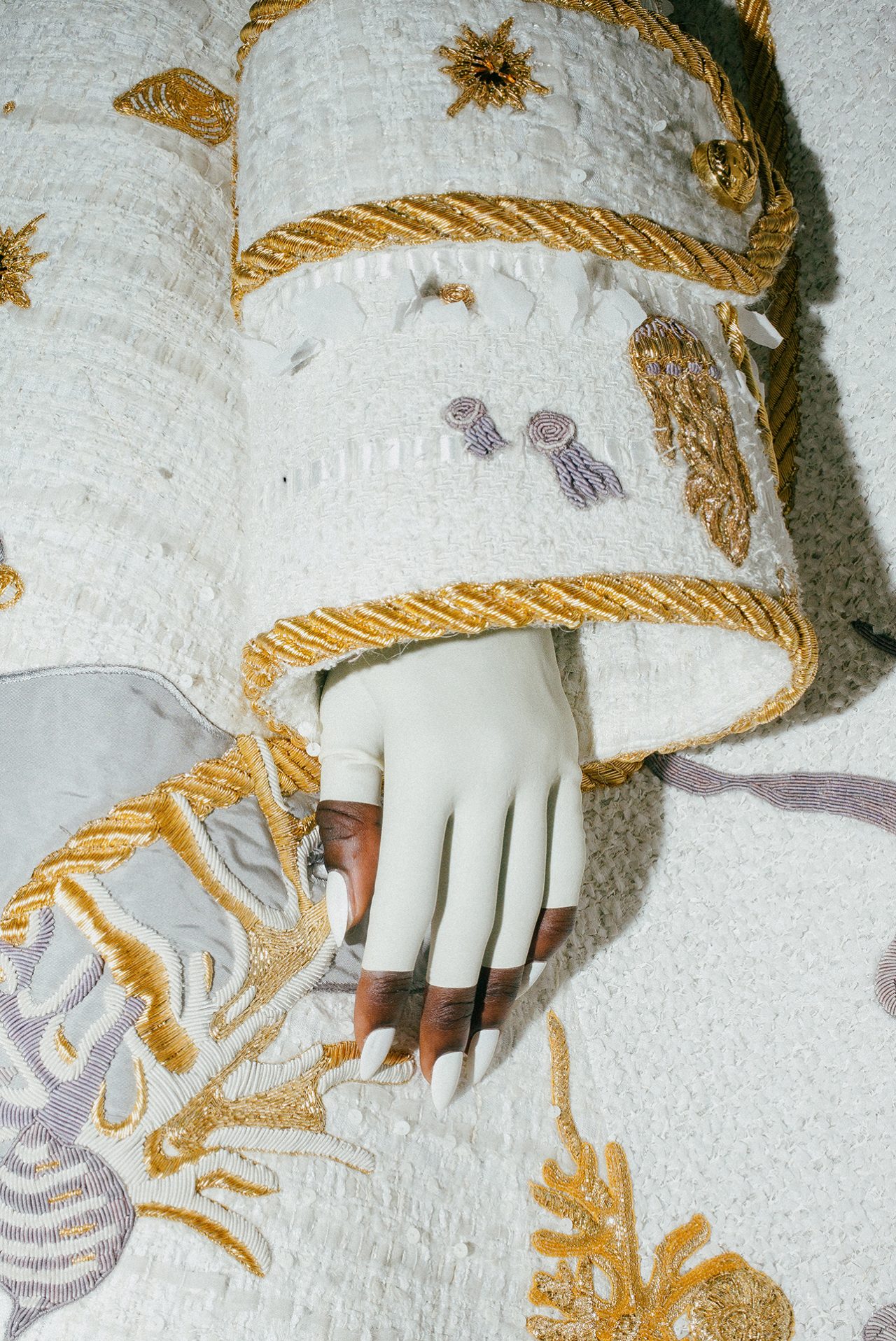 ほかにも乗客や車掌の姿をしたモデルが、甲殻類、灯台、ロープ、アンカーなどの海をイメージしたモチーフの付いたアイテムを身に纏い、ゴールド地金の鱗で覆われたマーメードや、手編みのビーズとスパンコールを重ねたリュネヴィル刺繍のヒトデの群れ、貝が配されたシルクサテン模様などのディテールがあしらわれていた。