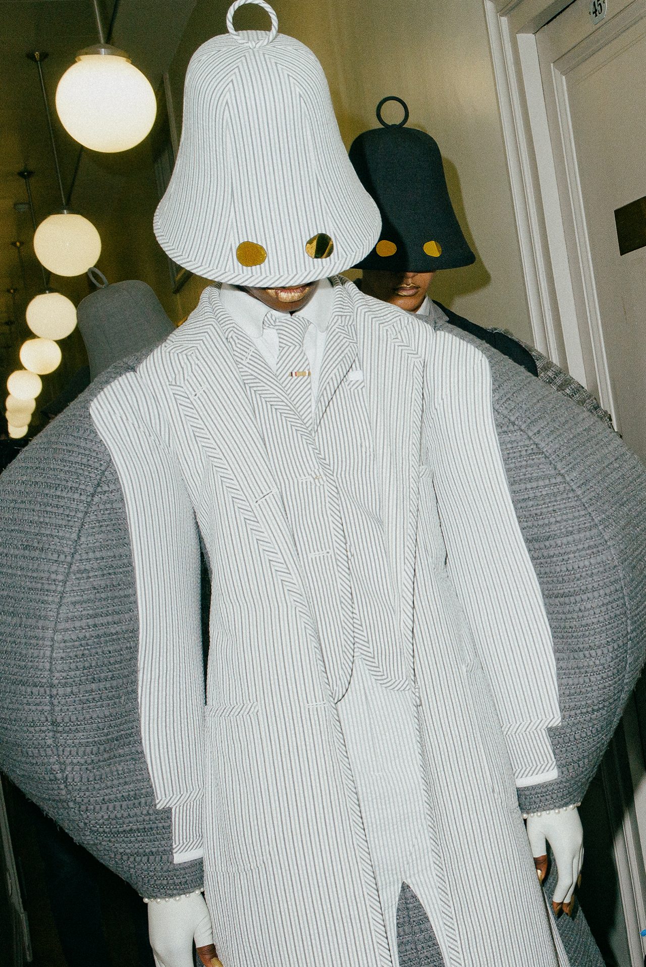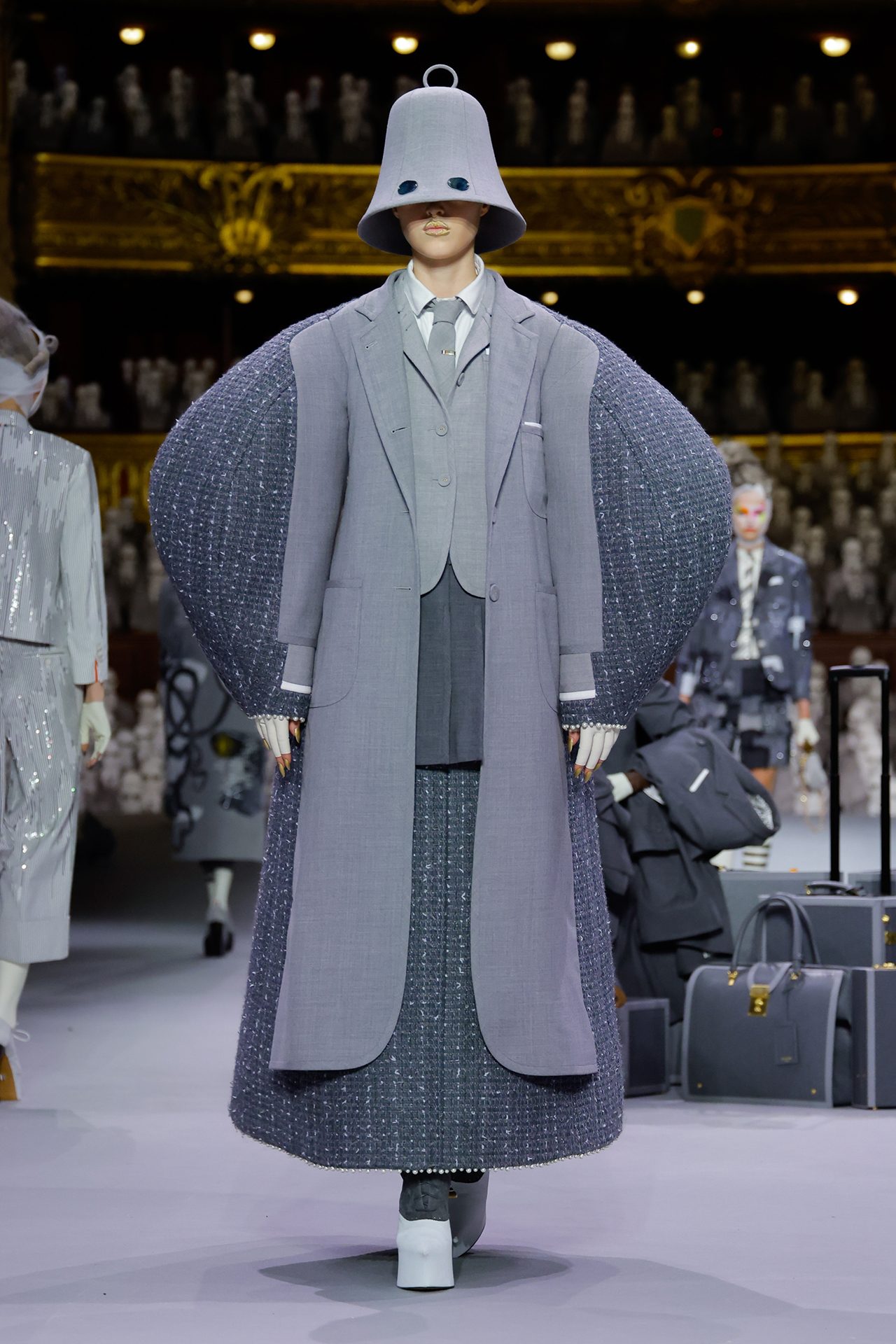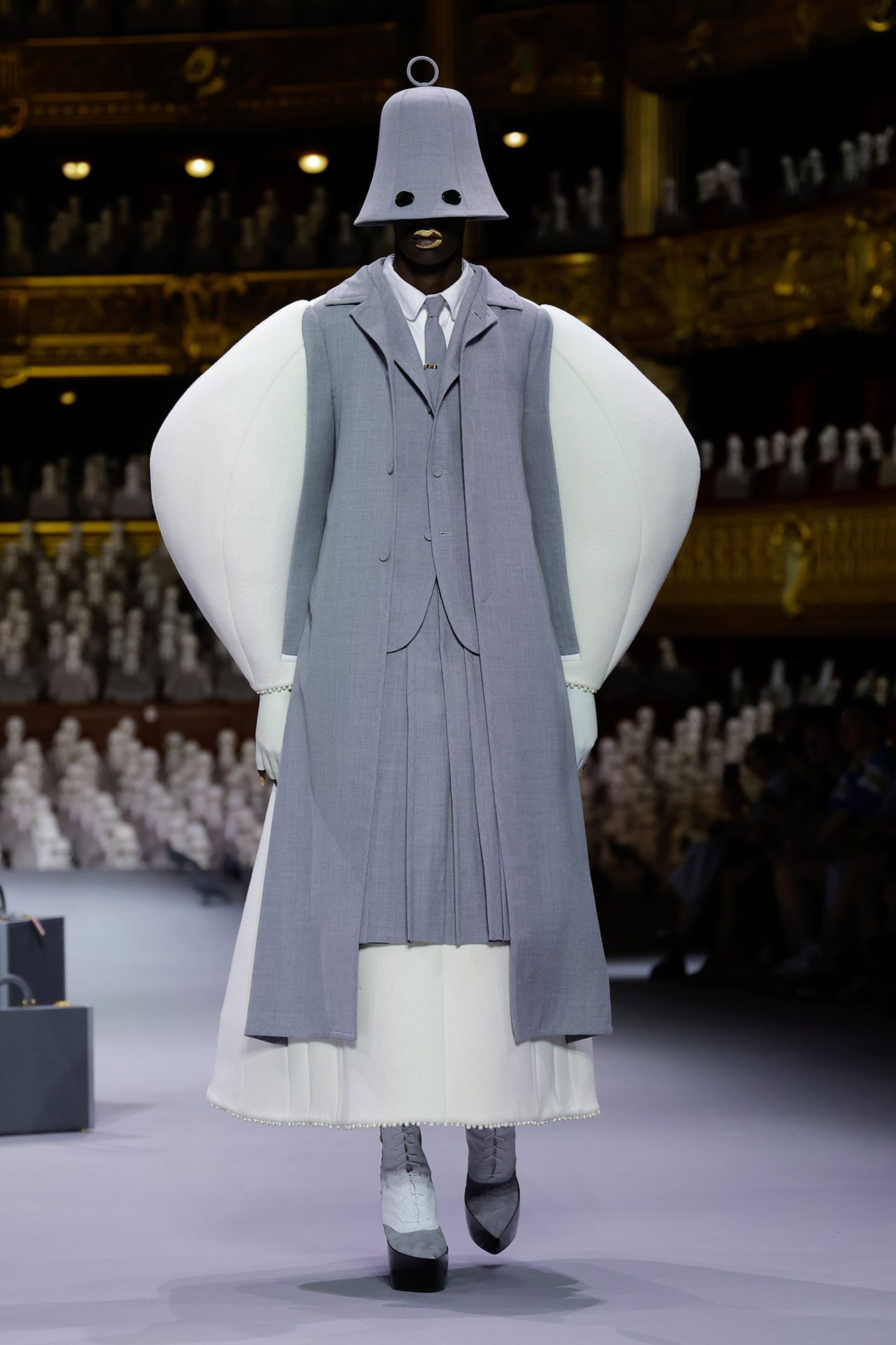 本コレクションで注目したいのが、グレーで統一され、鳩の被り物をしたルック。ブローグプラットフォームシューズを着用し、ハトの姿をしたモデルがつま先立ちで歩く、ユニークなスタイルで登場した。 また、一際目立ったのがウール仕立てのクロシェハットをかぶった鐘のような姿は、1歩ごと歩くにつれチャイムが劇場中に響き渡る。