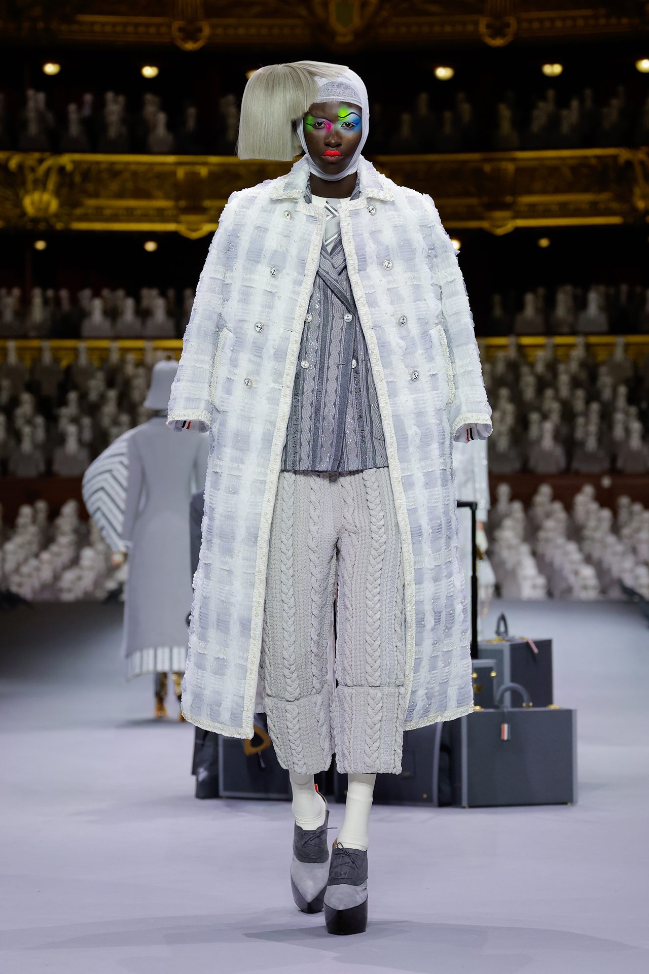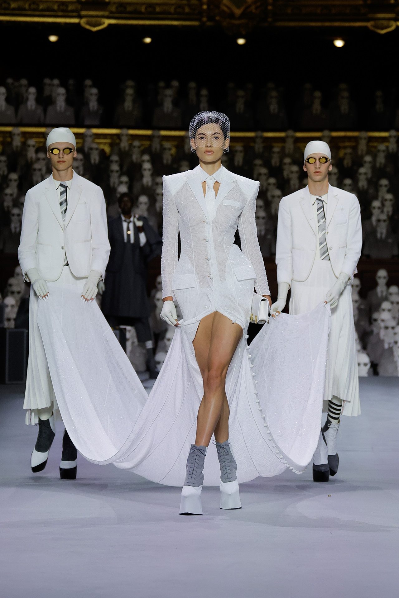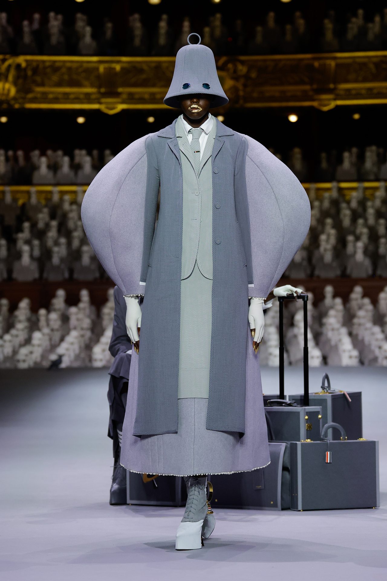 THOM BROWNE (トム ブラウン) の初となるオートクチュールコレクションがパリのオペラ座にてデビュー。本ブランドの制服を着た2000人の人形がパリ・オペラ座のオーディトリアムを埋め尽くした。コレクションでは1人の旅行客を演じるモデルの Alek Wek (アレック・ウェック) を中心に様々な乗客が現れ、クラシックなアメリカンスポーツウェアの要素をクチュールのレンズを通して表現。