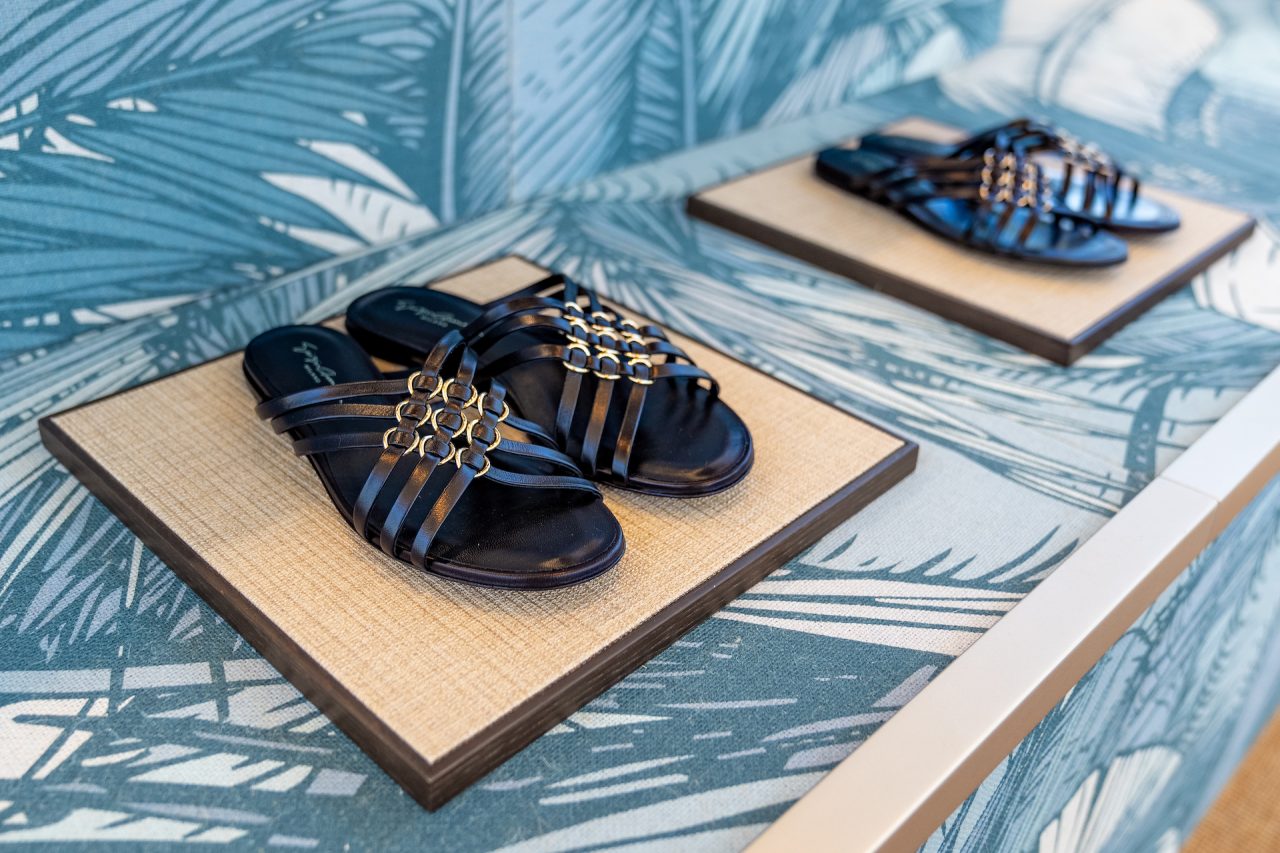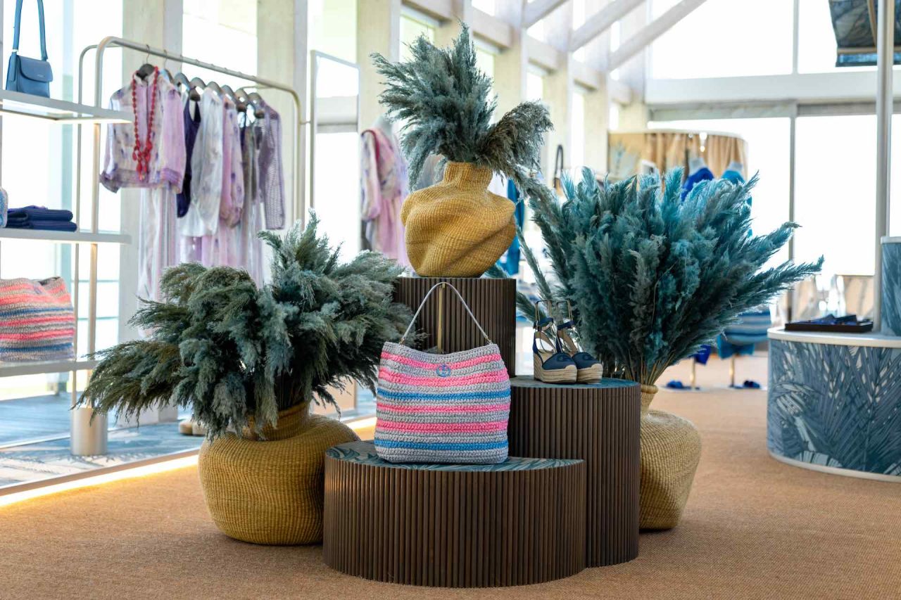 三方を海に囲まれ、夏の太陽光が降り注ぐリビエラ逗子マリーナにオープンした「MARE POP UP STORE RIVIERA ZUSHI MARINA」。明るく開放的な雰囲気に満ち溢れたポップアップで、ダスティブルーとライトブルーを基調に、ヤシの木とトロピカルな葉のパターンがロープカラーで表現した特別な空間となっている。