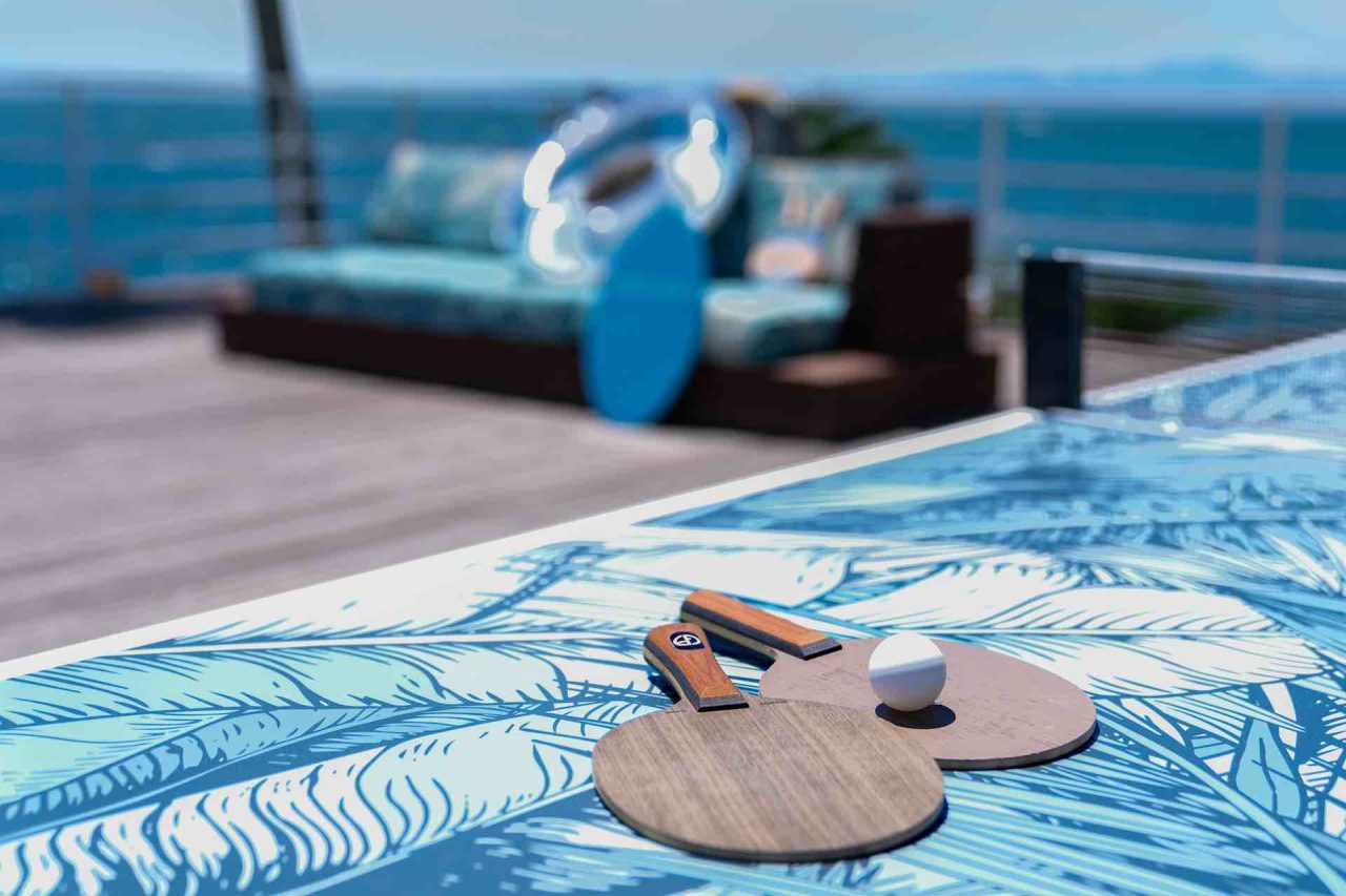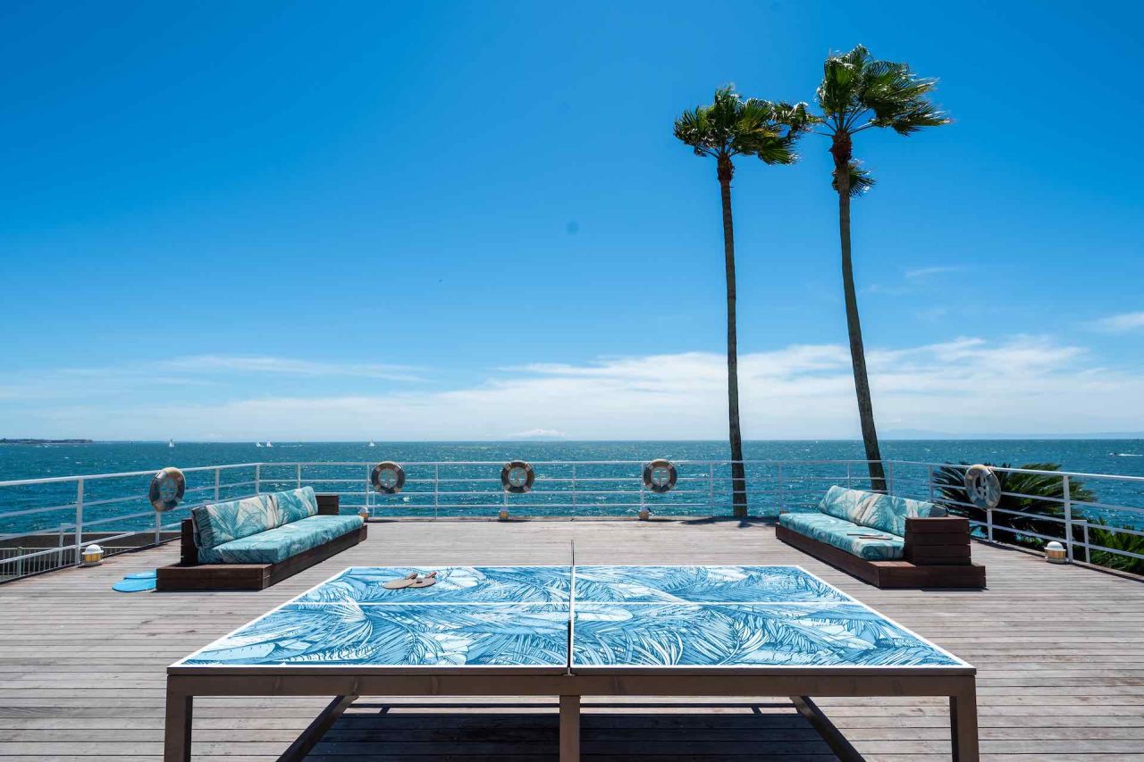 また、 織物のようなテクスチャーの家具やマネキンが、心地よく洗練されたマリンテイストを演出。店内では、エアホッケーを楽しんだり、設置されたデッキチェアで海に浮かぶ夕日を眺めながらゆっくり過ごしたりと、夏を存分に謳歌できる。