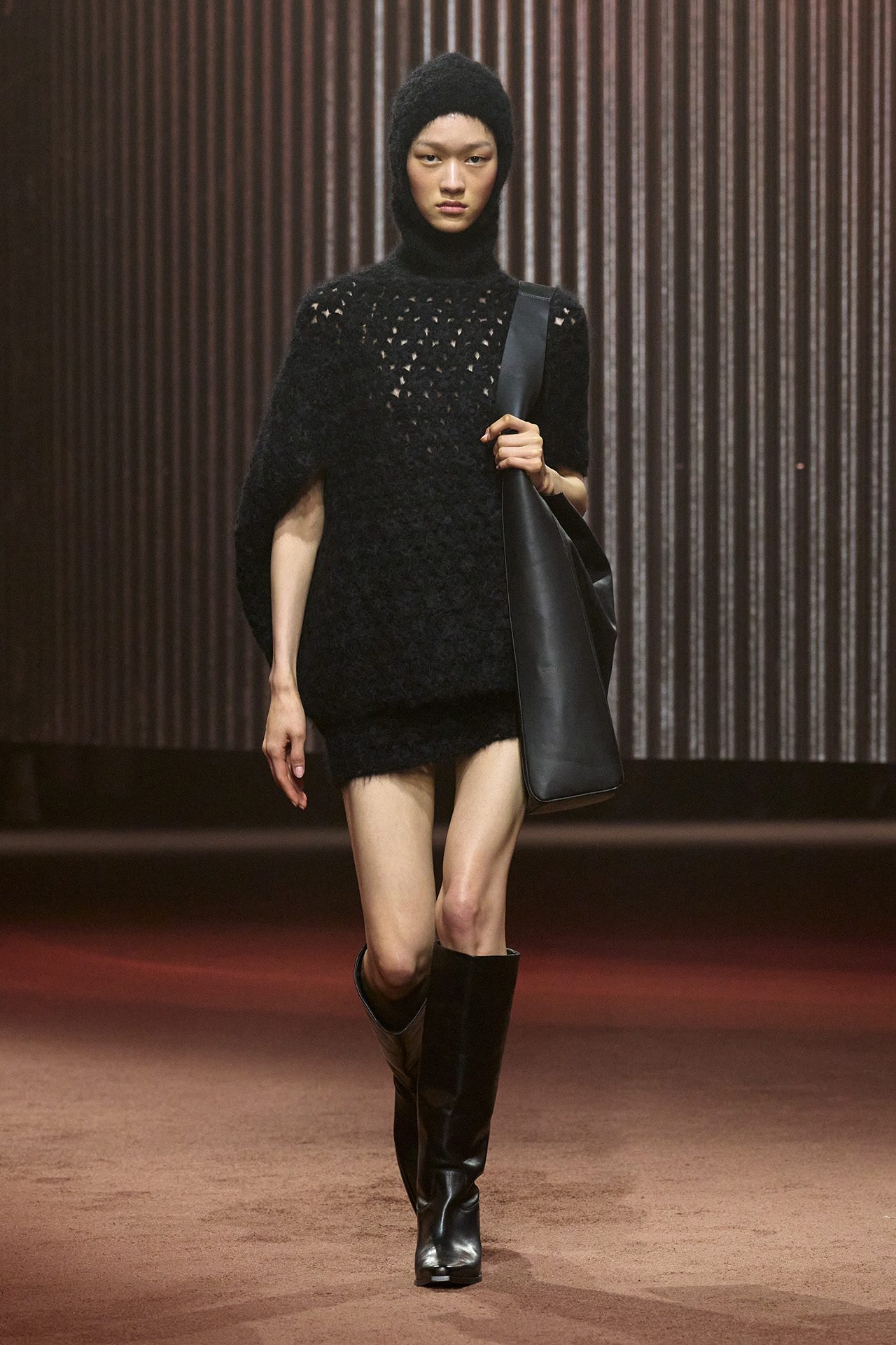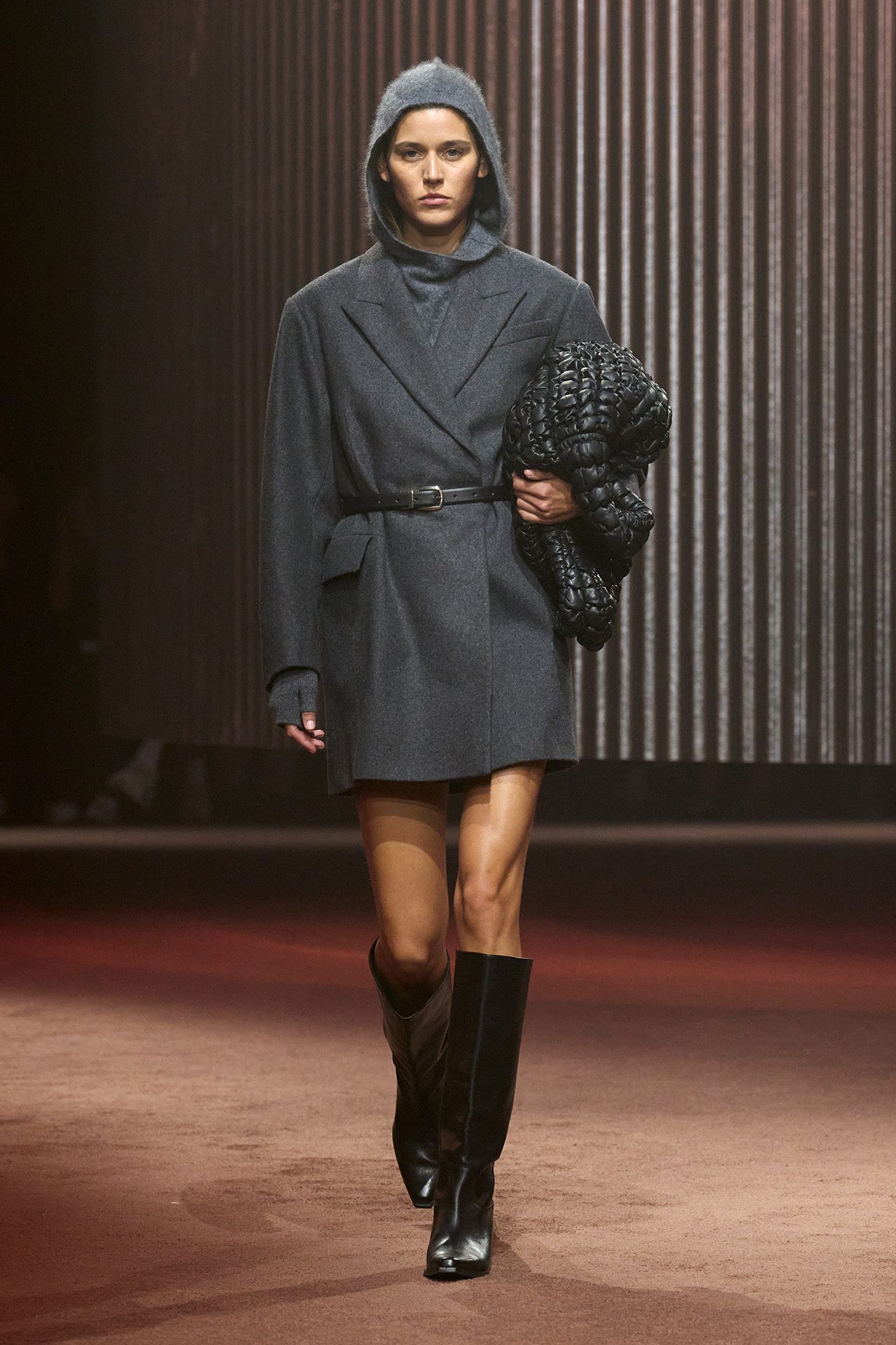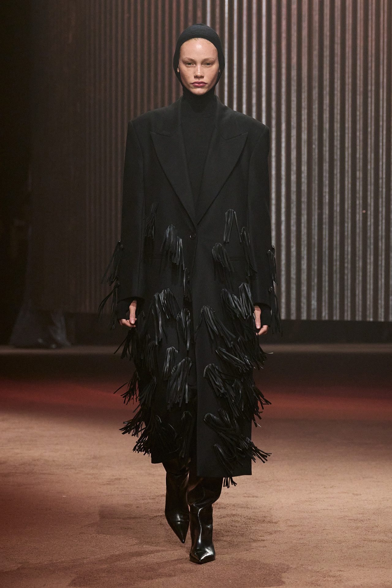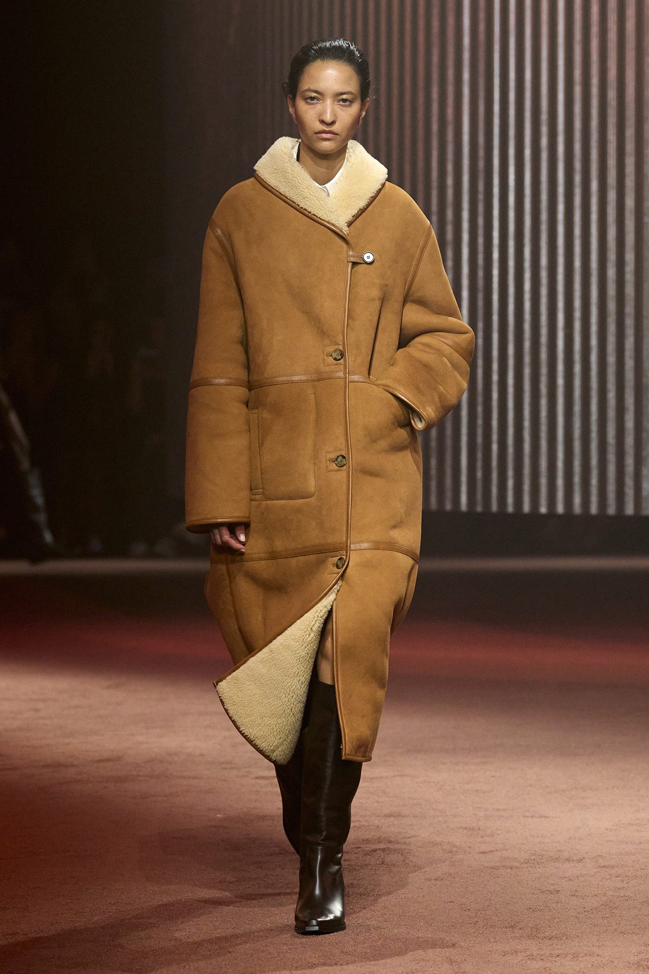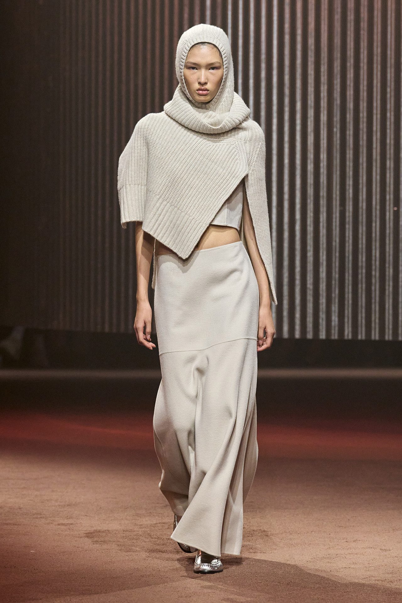 今シーズンもカラーパレットは自然がインスピレーション源。心地よいニュートラルなトーンが豊かなアースブラウンを際立たせ、マットな質感がメタリックな輝きと重なり合う。ゆったりとしたマキシ丈に大胆なショルダーで仕立てられたコート、フードやオーバーサイズのフリンジ付きスカーフを備え付けたニットウェアなど、実用性と美しさを兼ね備えたアイテムが披露された。
