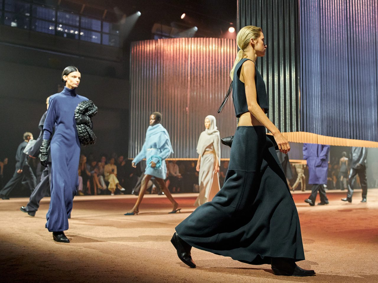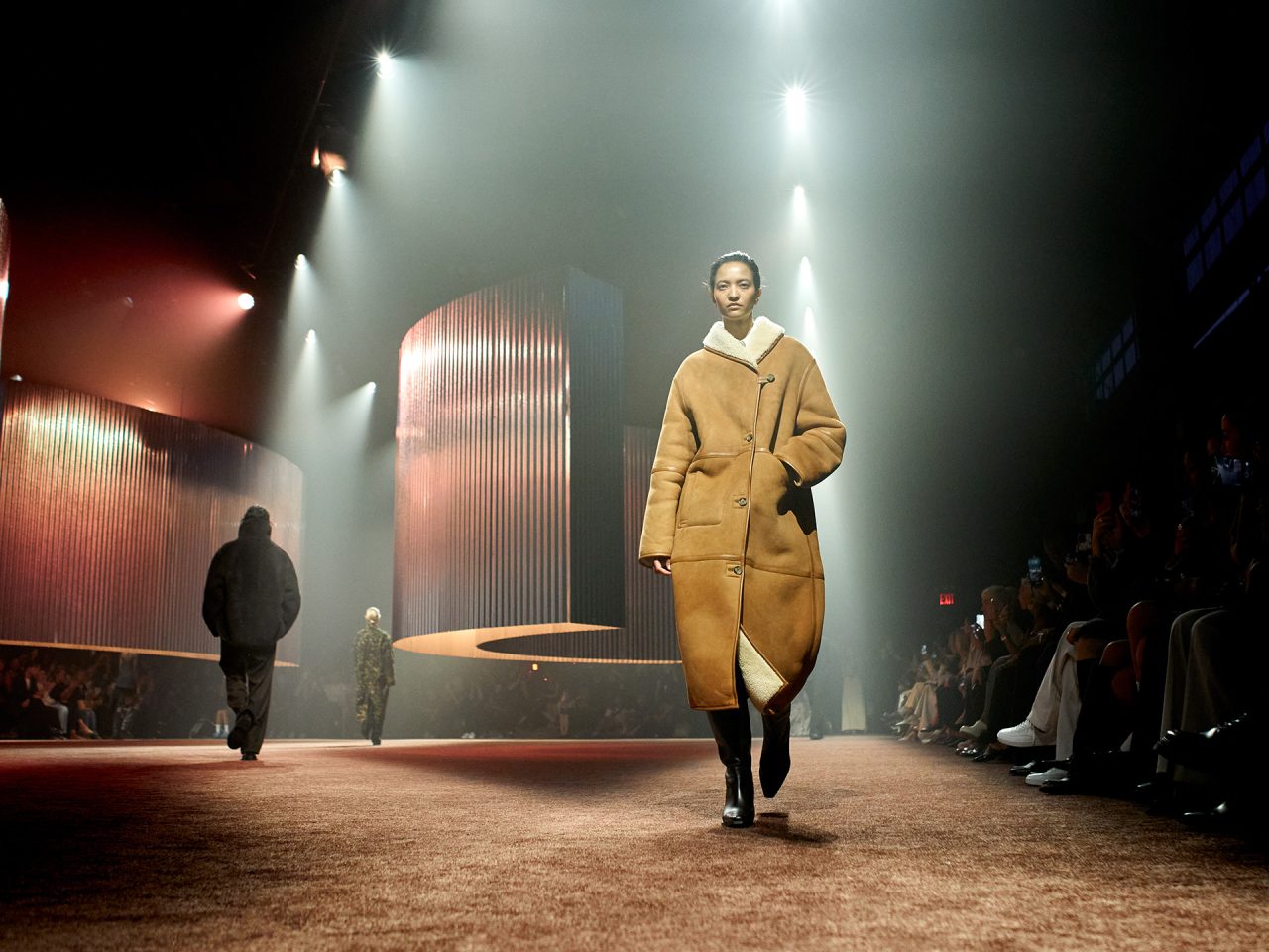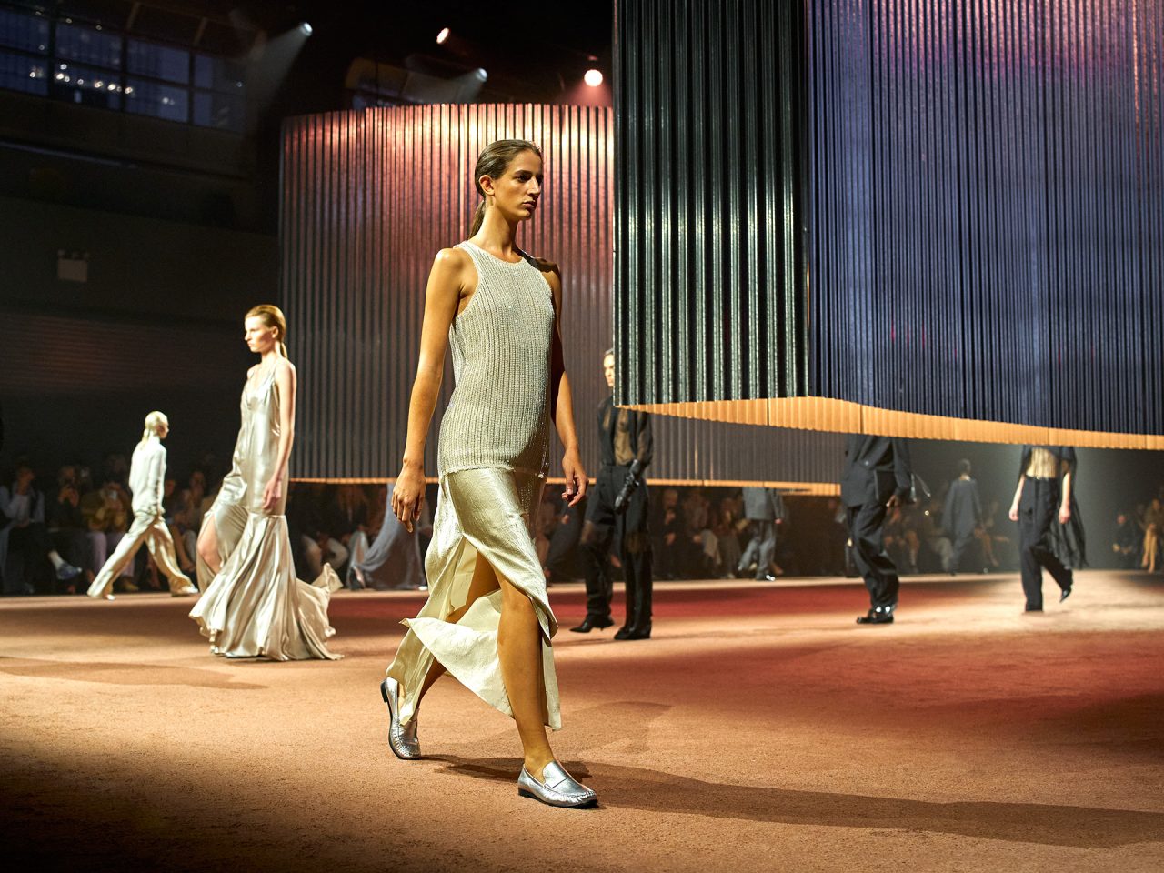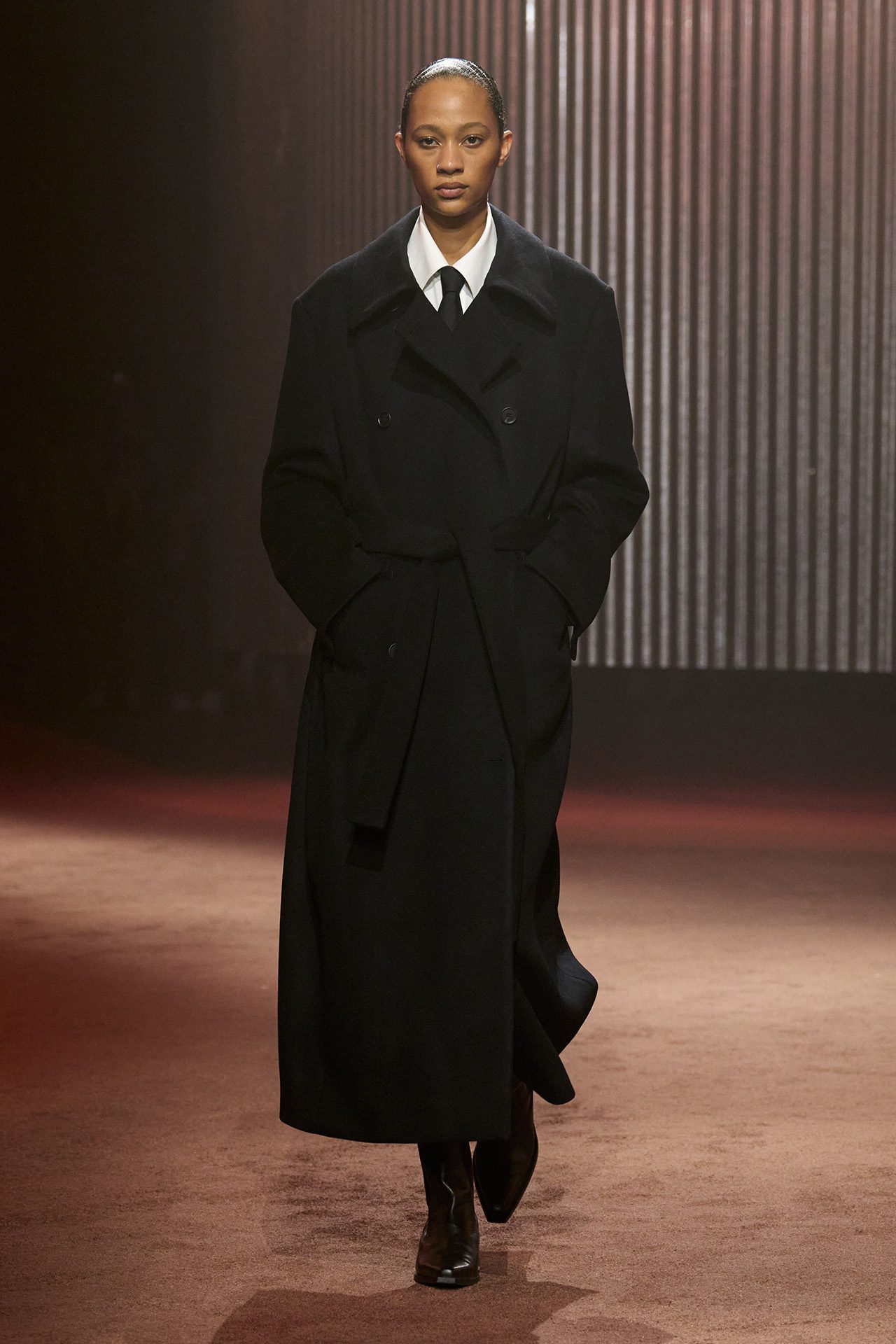 今シーズンもカラーパレットは自然がインスピレーション源。心地よいニュートラルなトーンが豊かなアースブラウンを際立たせ、マットな質感がメタリックな輝きと重なり合う。ゆったりとしたマキシ丈に大胆なショルダーで仕立てられたコート、フードやオーバーサイズのフリンジ付きスカーフを備え付けたニットウェアなど、実用性と美しさを兼ね備えたアイテムが披露された。