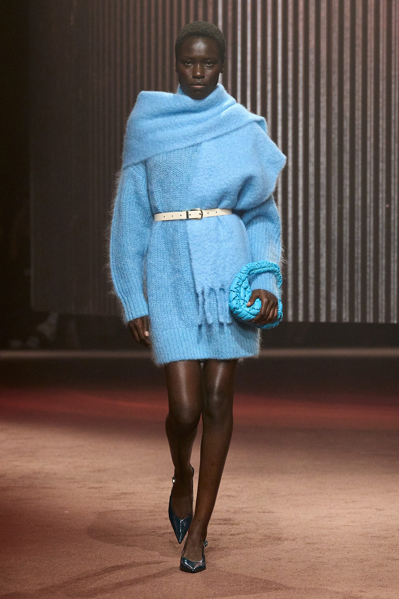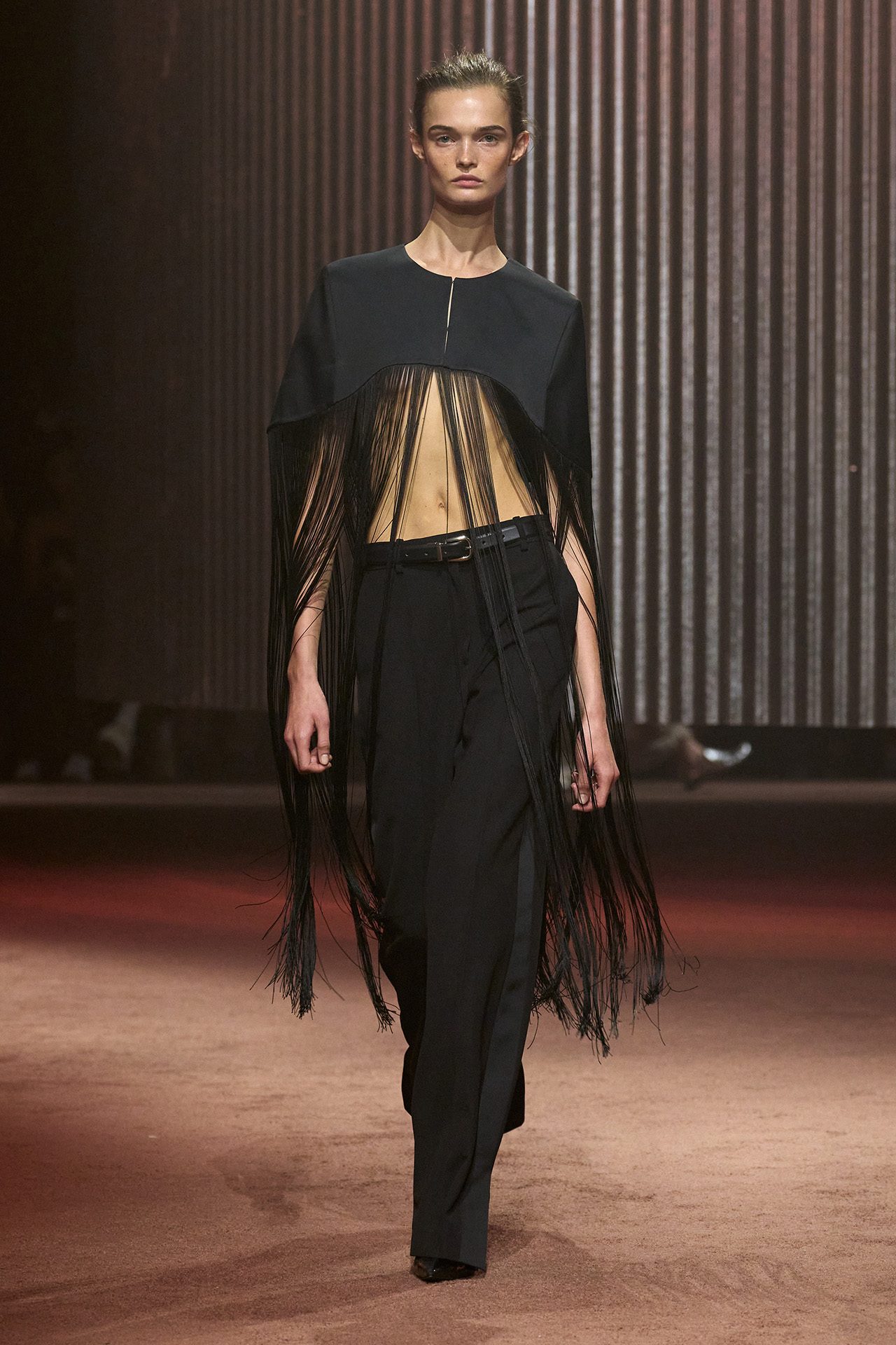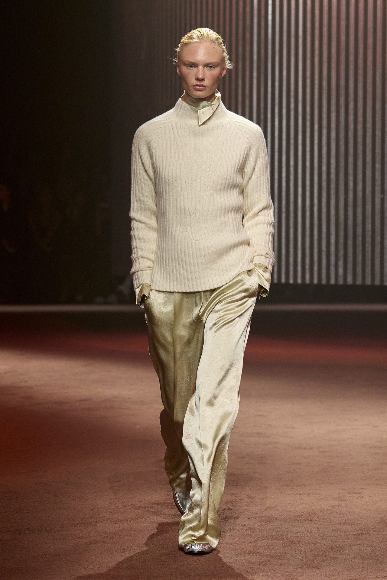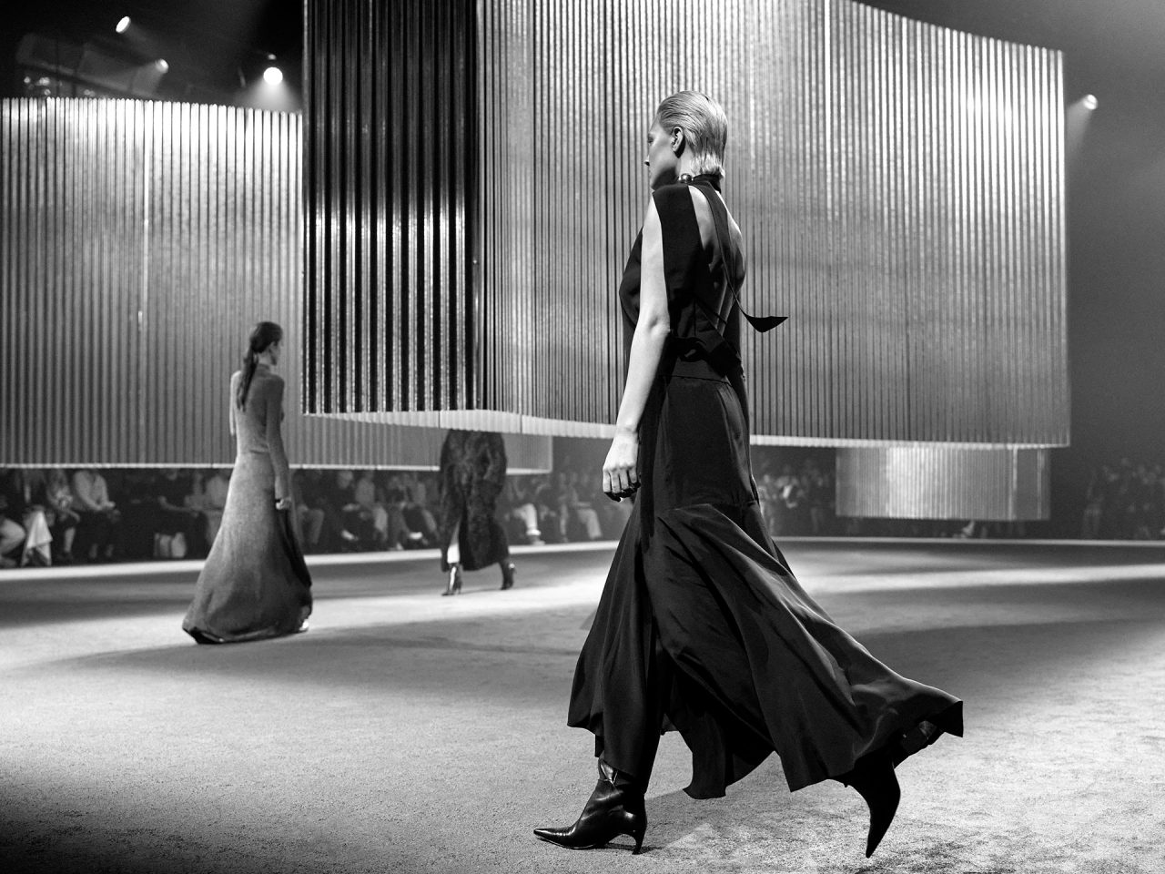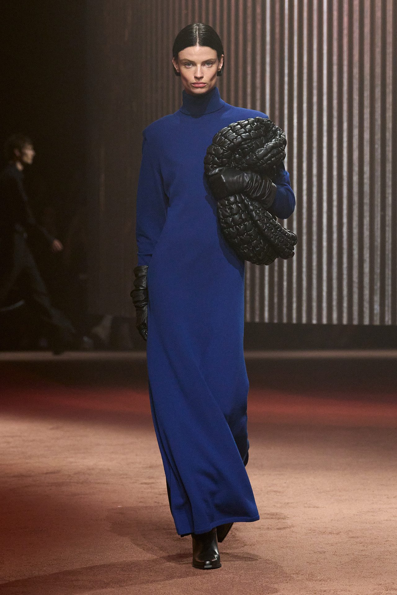 今シーズンもカラーパレットは自然がインスピレーション源。心地よいニュートラルなトーンが豊かなアースブラウンを際立たせ、マットな質感がメタリックな輝きと重なり合う。ゆったりとしたマキシ丈に大胆なショルダーで仕立てられたコート、フードやオーバーサイズのフリンジ付きスカーフを備え付けたニットウェアなど、実用性と美しさを兼ね備えたアイテムが披露された。