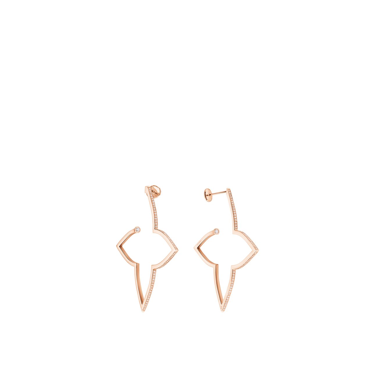 リングは2種類のサイズで展開。ミニリングは花びらにあしらわれたダイヤモンドがアクセントとなり、クラシカルで繊細な印象を演出する。一方、ラージリングは、フラワーのシルエットを想わせるデザインで、フラワーのシルエットを想わせるオープンなデザインに、一粒のダイヤモンドとパヴェ仕上げを組み合わせ、より大胆な存在感を放つ。ダイヤモンドの繊細なラインで強調されたオープンフラワーのデザインのフープは、ステートメントジュエリーとして身に着けた人の個性を強調。控えめで小ぶりなミニフープは、耳たぶにシックに寄り添いながら、ダイヤモンドのスタッズが上品なタッチをプラスする。