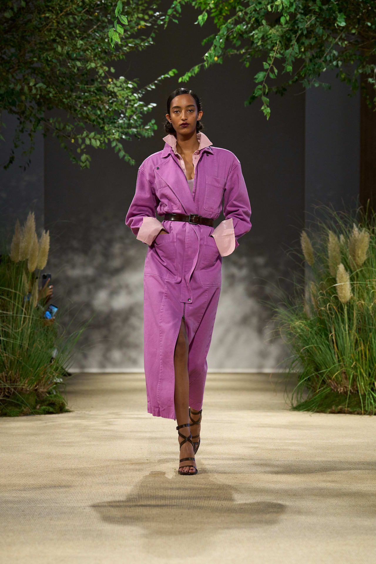 真夏のコテージの庭に咲き乱れるスイートピーの花のように、ファーストルックから続くのは、気分も華やぐ色鮮やかなルックたち。ワークウェアにも用いられる耐久性抜群のドリル素材も、豊かなカラーパレットに染め上げられた。