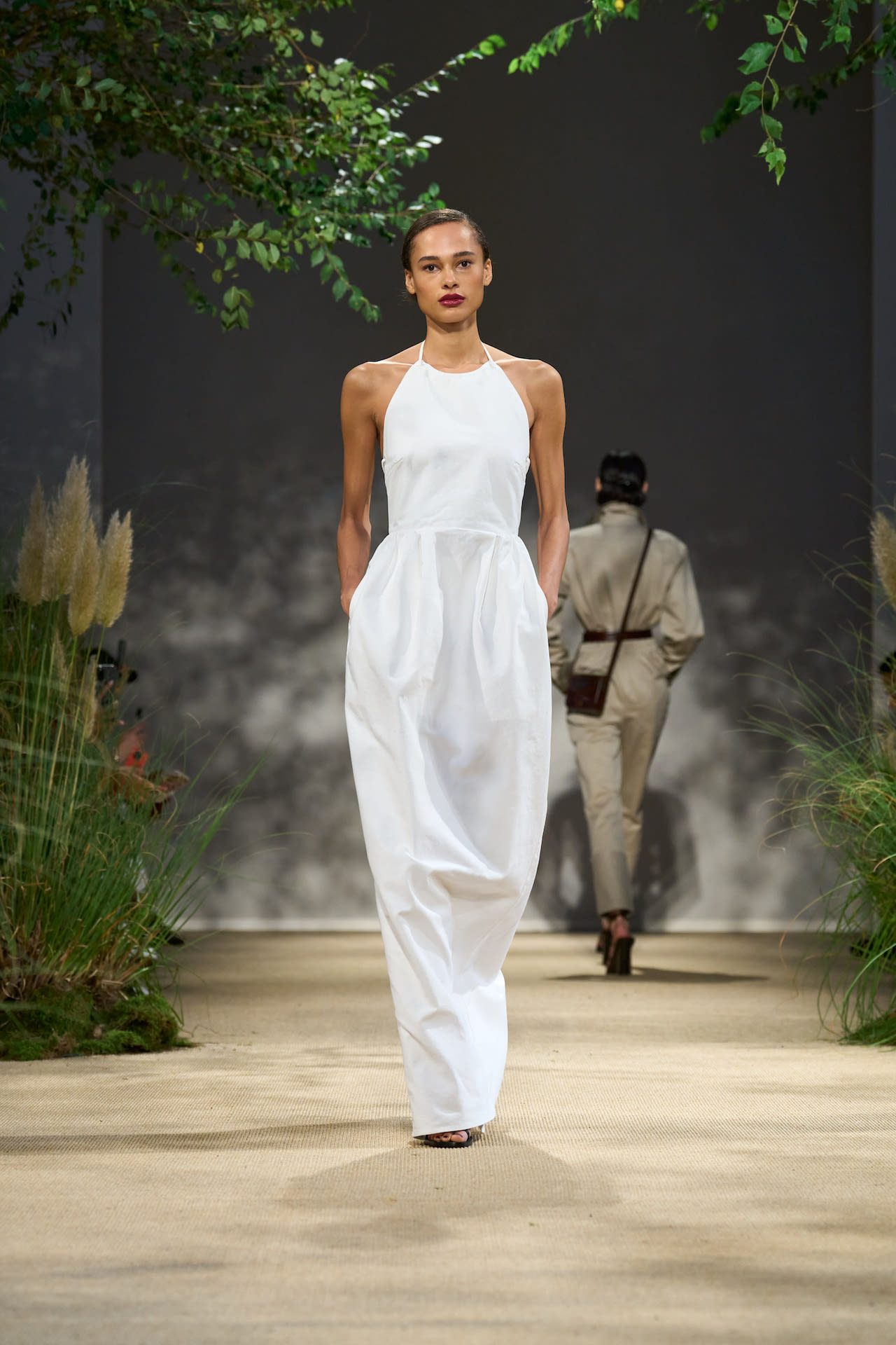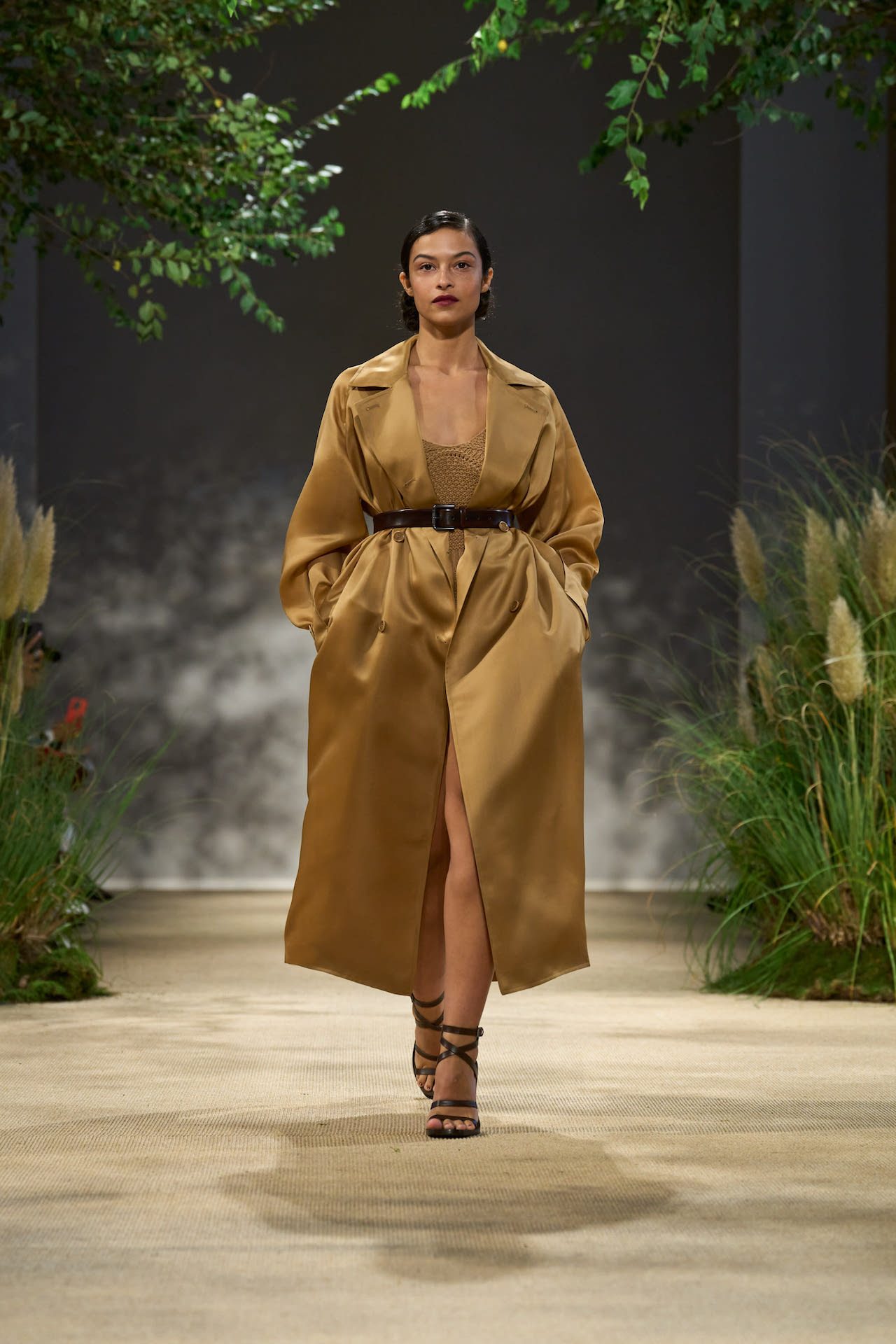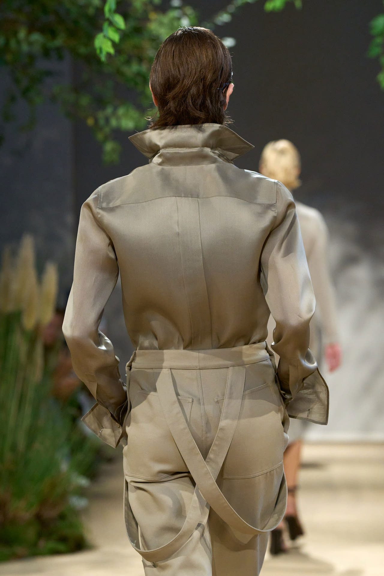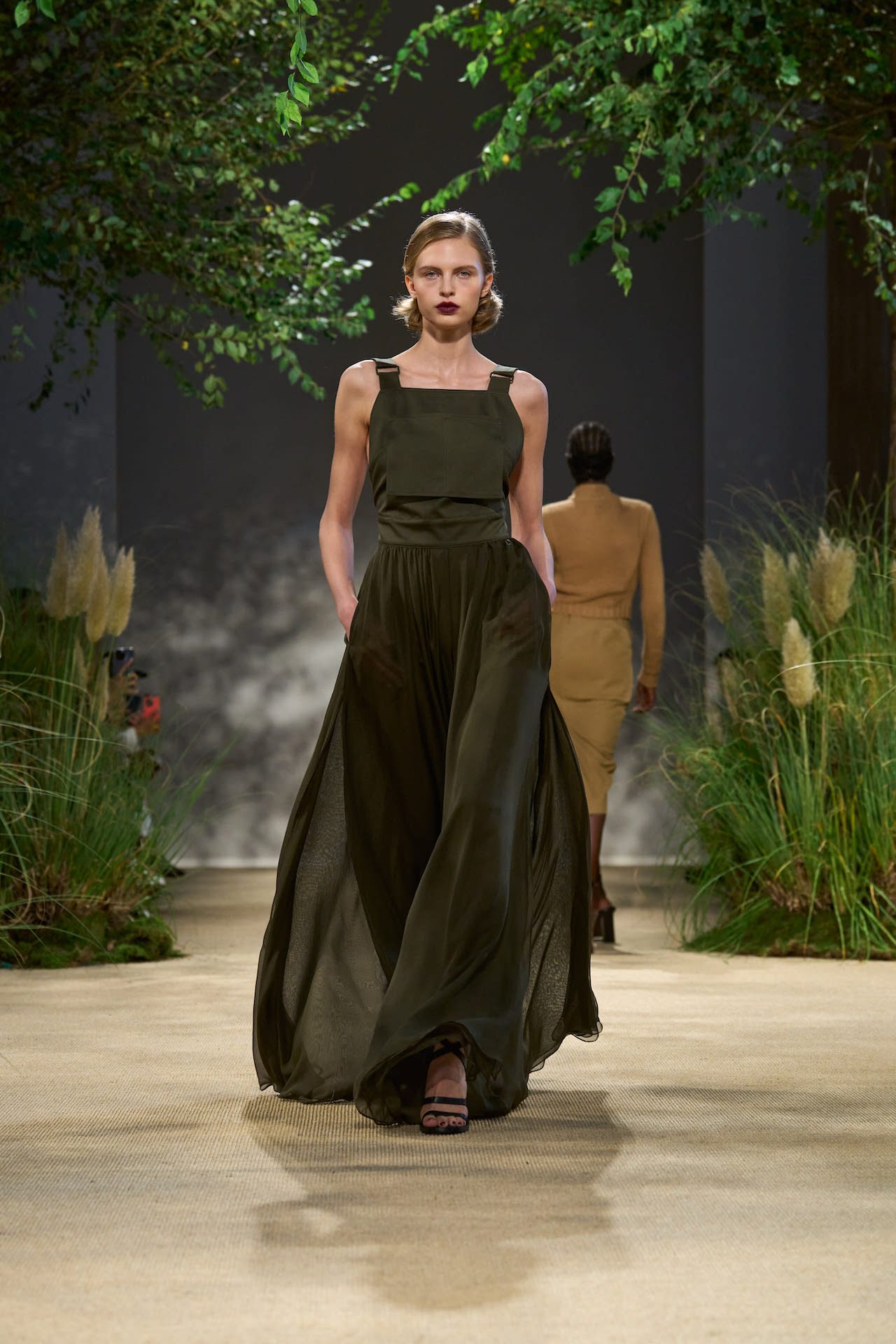 Max Mara の Utility Glamour と共鳴したランド・アーミーのジョッパーズやサイレンスーツ(オールインワン)といったクラシックなワークウェアもインスピレーション源に。ハンドスコップを入れるのに十分な大きさのポケットやポーチ、タフな補強ステッチ、頑丈なサスペンダーなどをコレクションに採用。また、庭師のエプロンから着想を得たという背中の開いたサンドレスやユニフォームを彷彿させるギャバジンのサスペンダーデザインを取り入れたシフォンスカートのガウンは、デイタイムからイブニングまでをシームレスにカバーする。