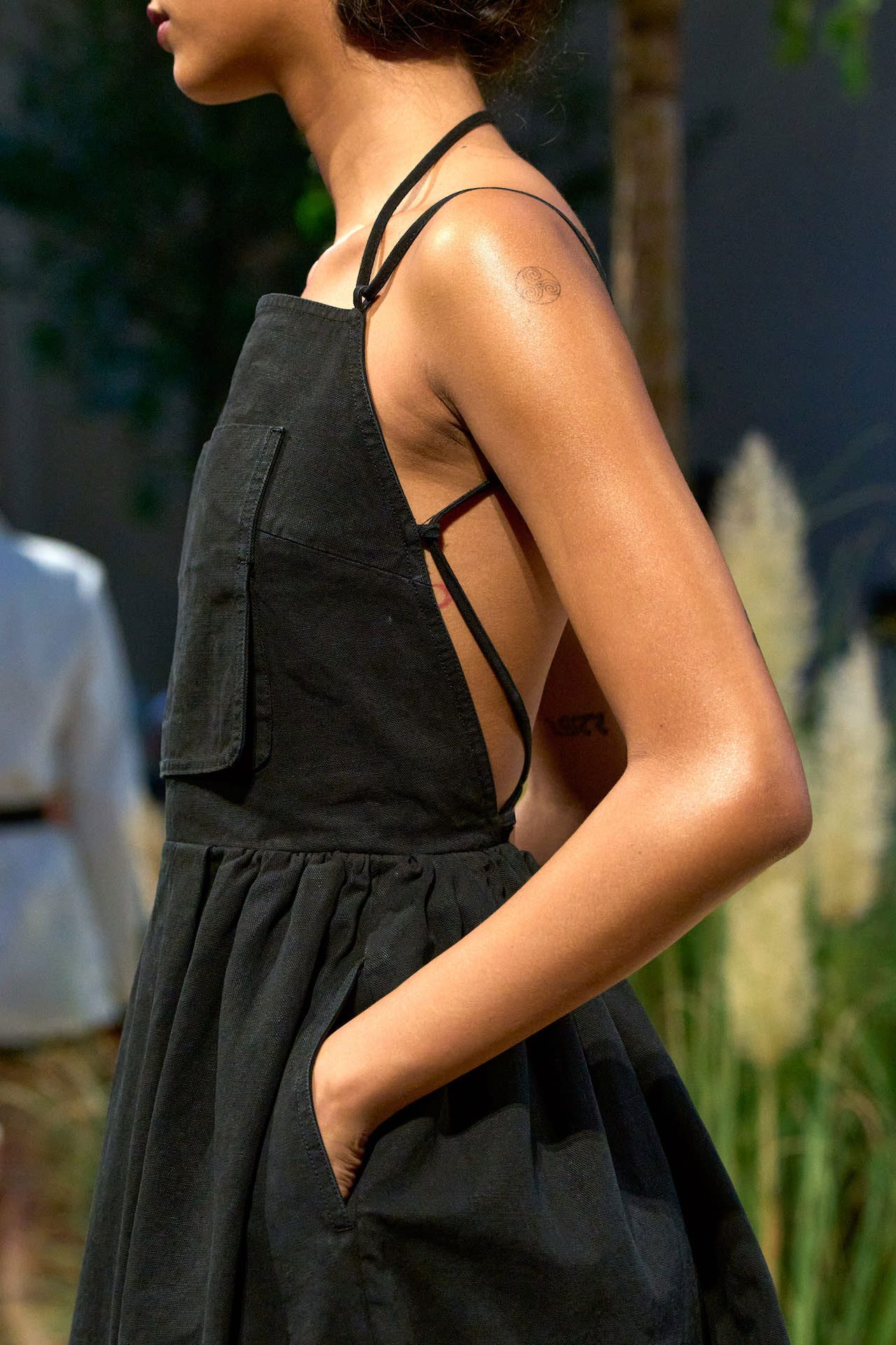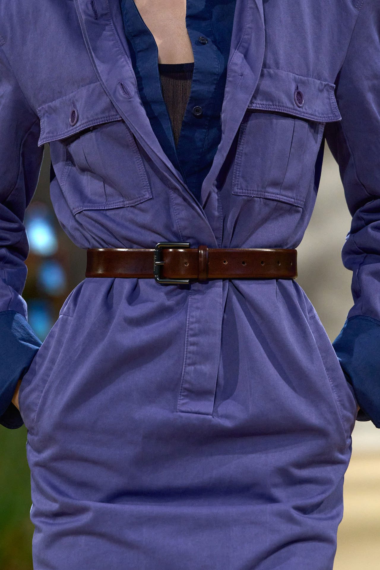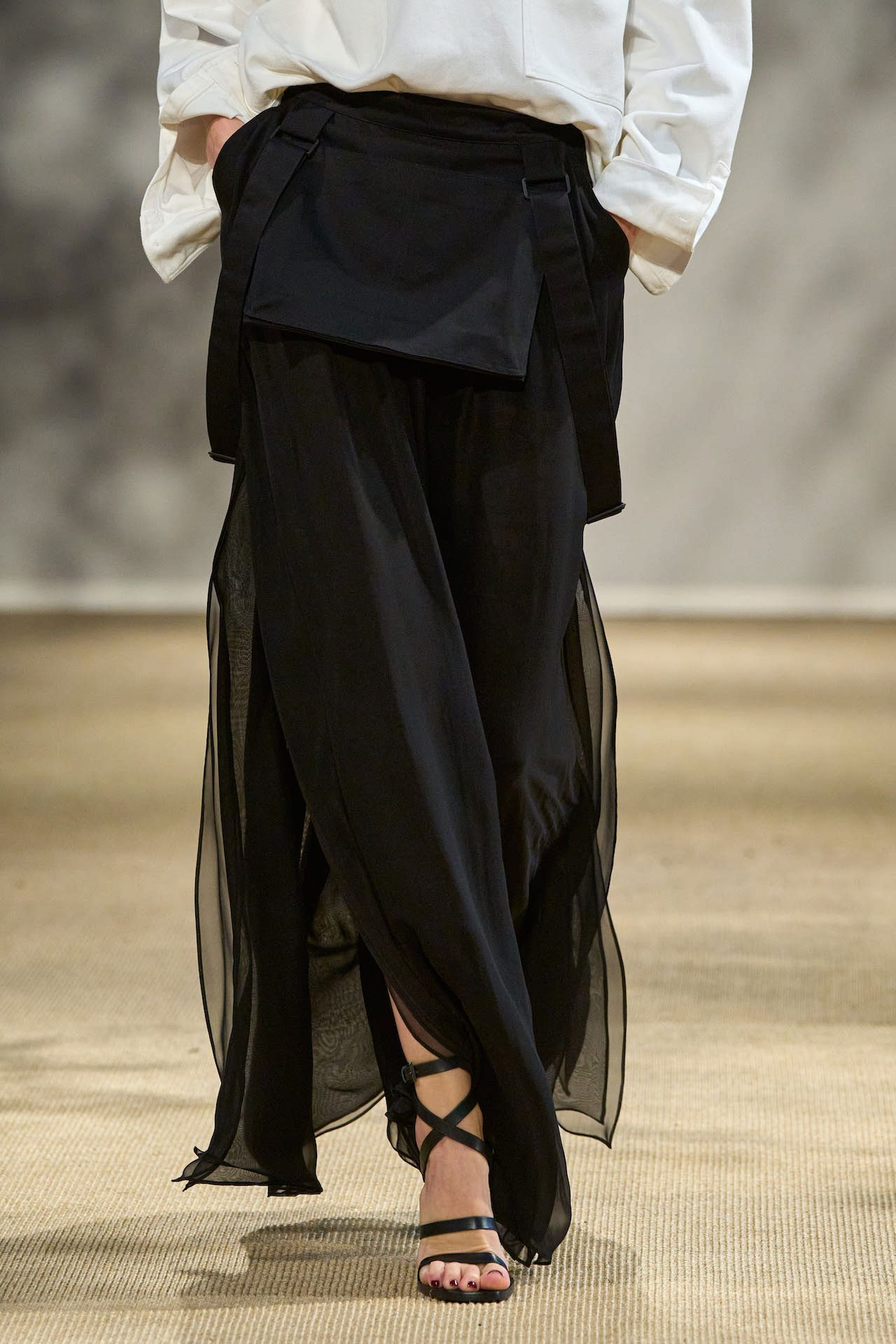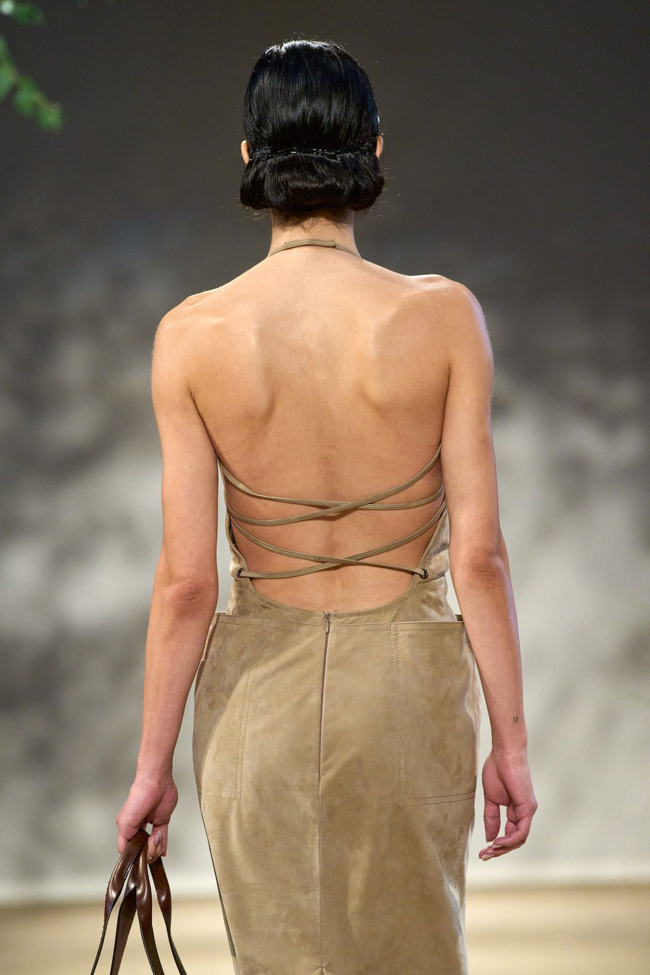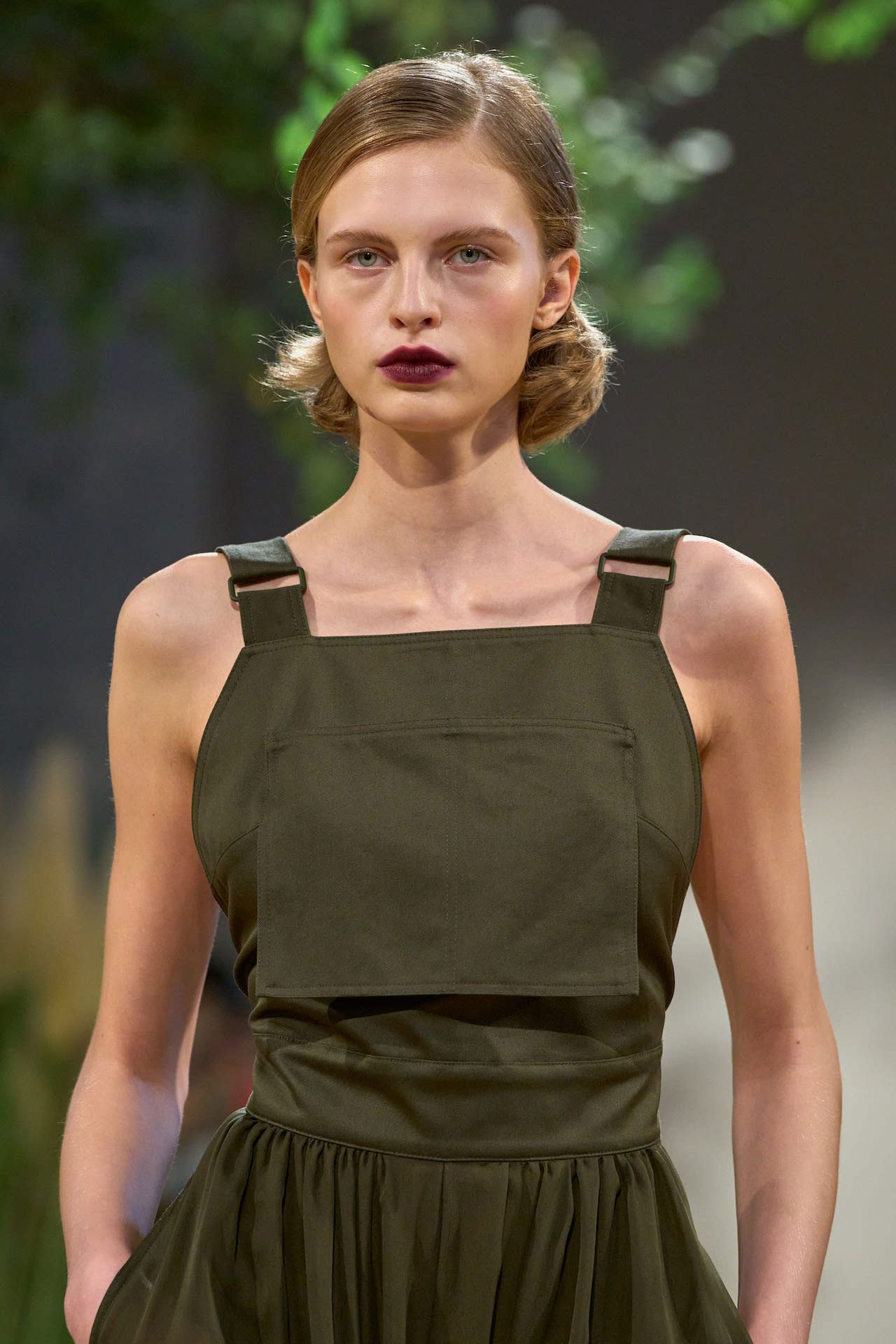 Max Mara の Utility Glamour と共鳴したランド・アーミーのジョッパーズやサイレンスーツ(オールインワン)といったクラシックなワークウェアもインスピレーション源に。ハンドスコップを入れるのに十分な大きさのポケットやポーチ、タフな補強ステッチ、頑丈なサスペンダーなどをコレクションに採用。また、庭師のエプロンから着想を得たという背中の開いたサンドレスやユニフォームを彷彿させるギャバジンのサスペンダーデザインを取り入れたシフォンスカートのガウンは、デイタイムからイブニングまでをシームレスにカバーする。