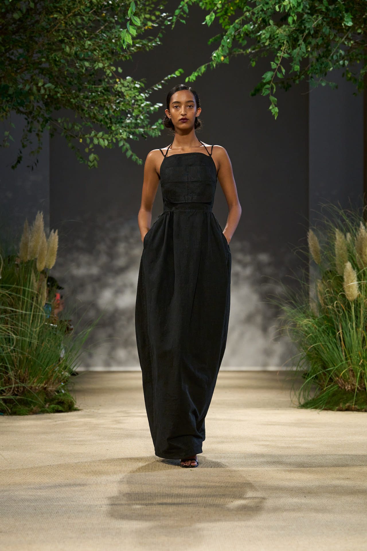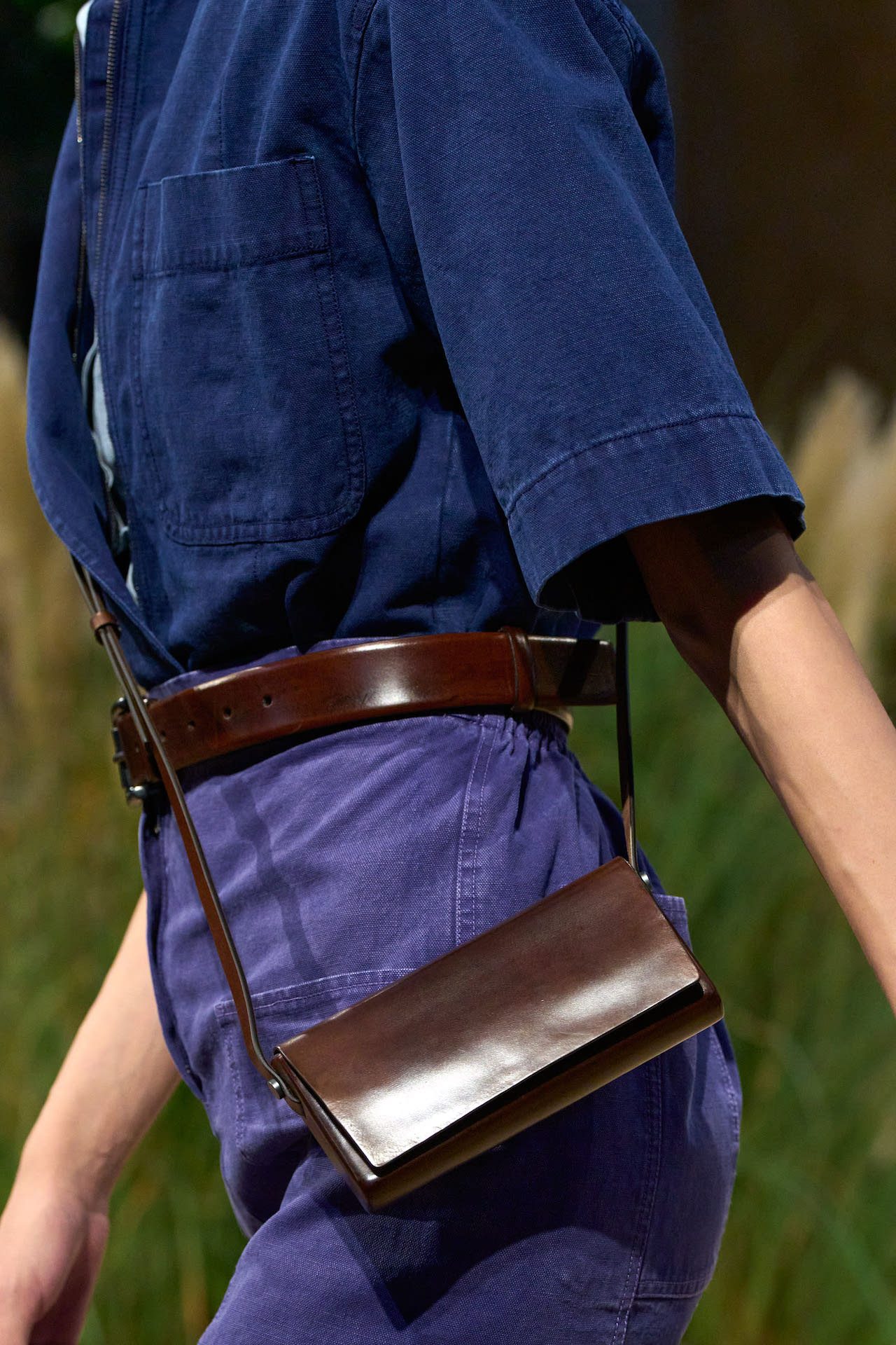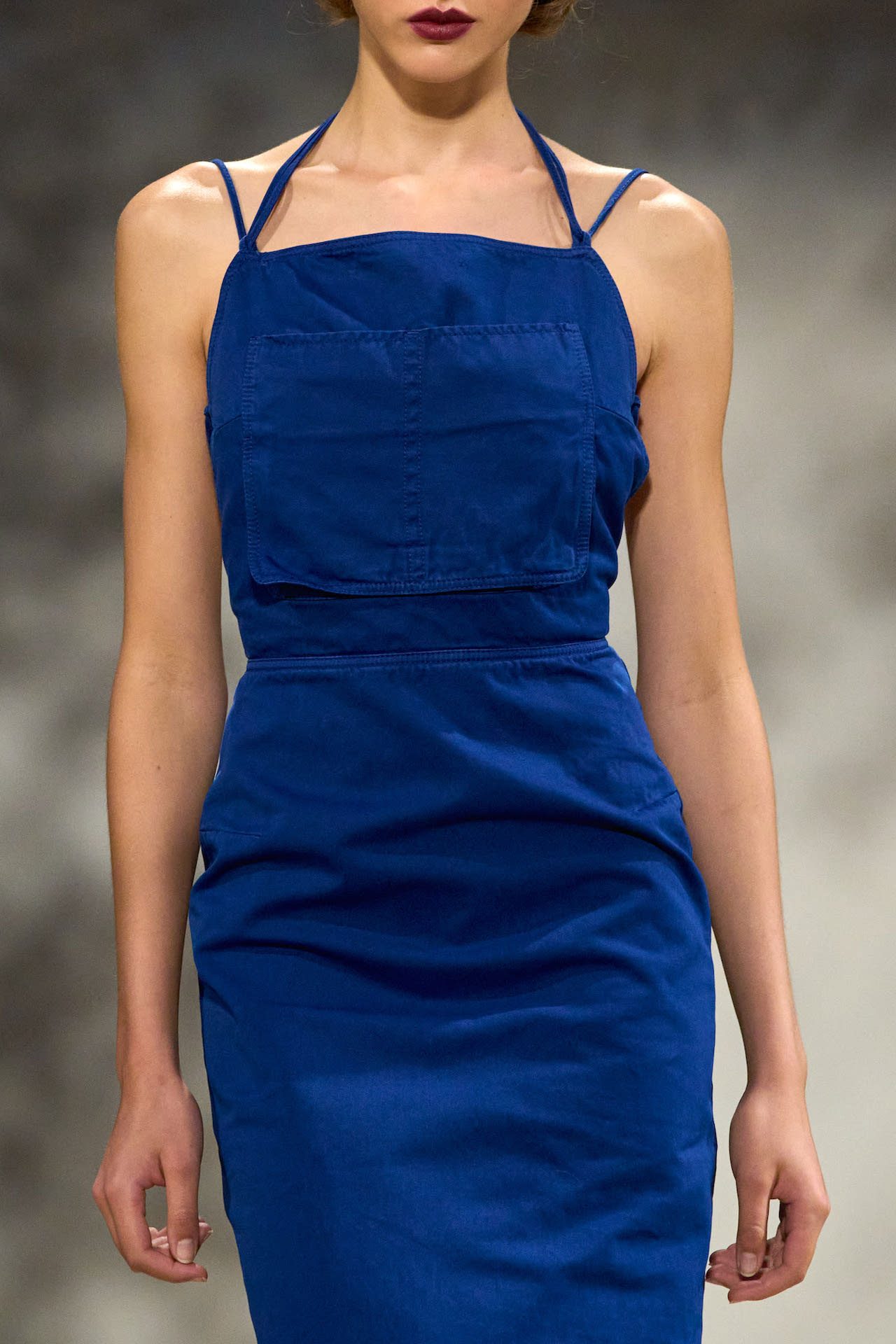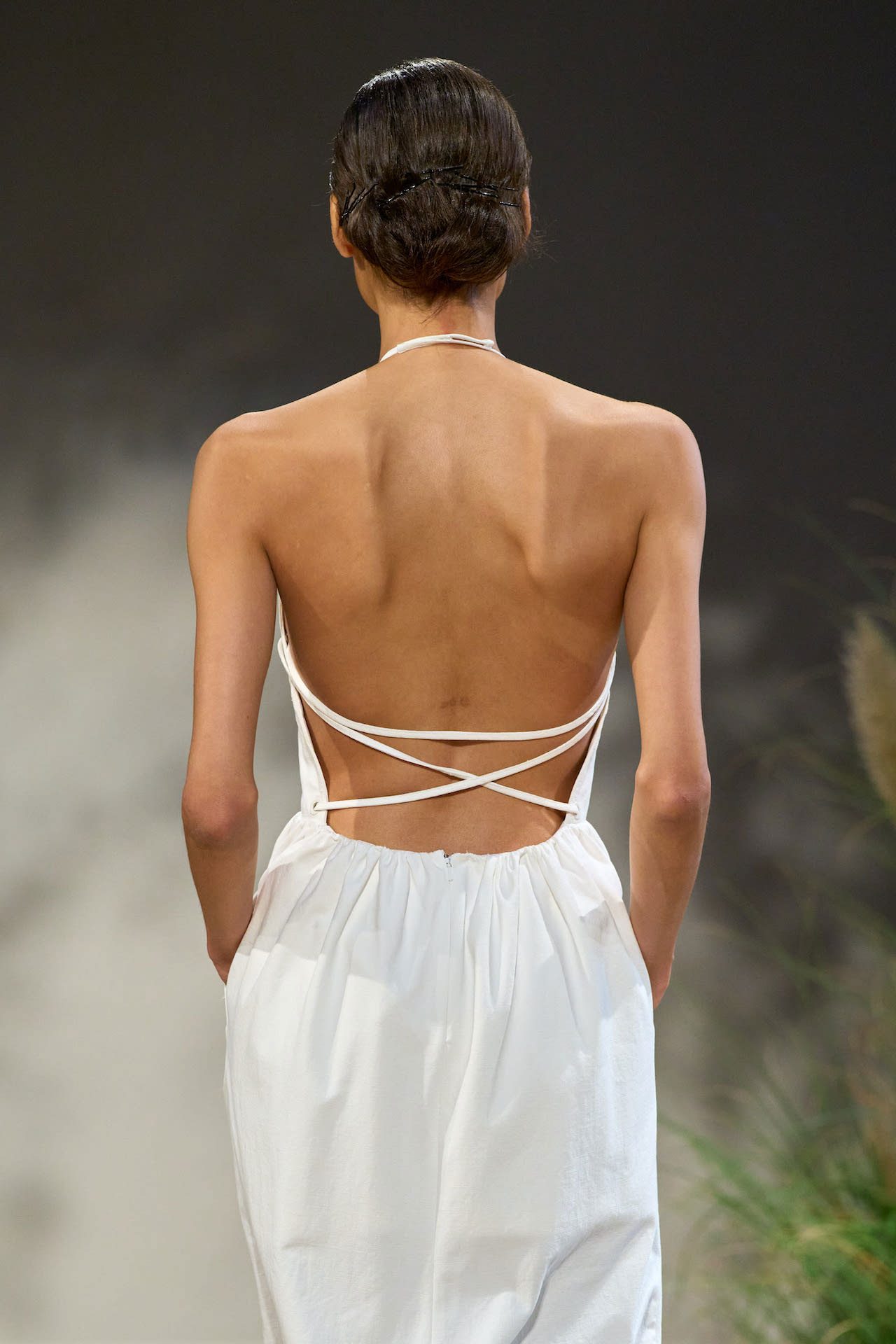 Max Mara の Utility Glamour と共鳴したランド・アーミーのジョッパーズやサイレンスーツ(オールインワン)といったクラシックなワークウェアもインスピレーション源に。ハンドスコップを入れるのに十分な大きさのポケットやポーチ、タフな補強ステッチ、頑丈なサスペンダーなどをコレクションに採用。また、庭師のエプロンから着想を得たという背中の開いたサンドレスやユニフォームを彷彿させるギャバジンのサスペンダーデザインを取り入れたシフォンスカートのガウンは、デイタイムからイブニングまでをシームレスにカバーする。