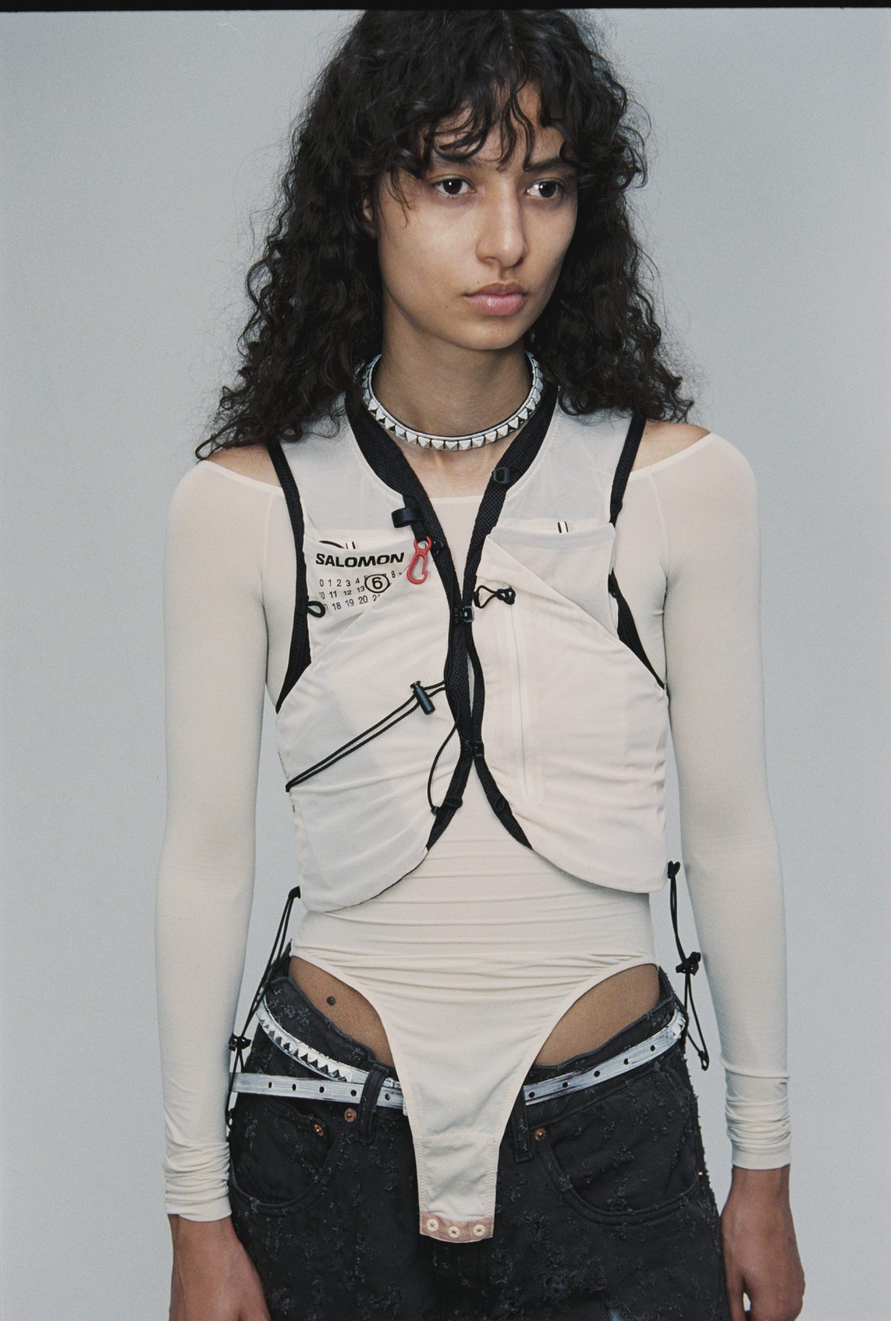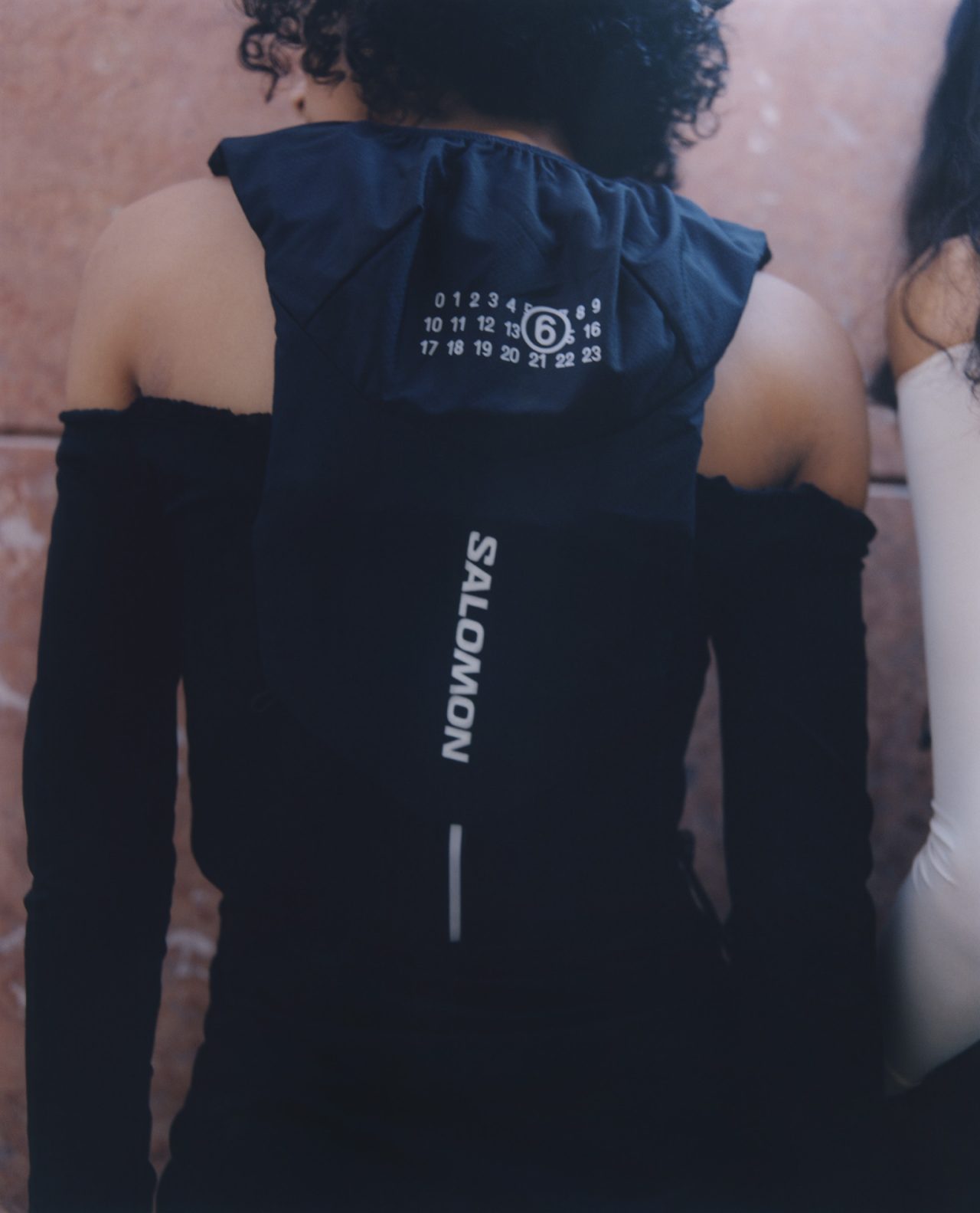 そして Salomon のベストセラーであるハイドレーションシステム「ADV Skin 5 Hydration Vest」は機能性を重視して考え抜かれた構成を、MM6 独自のレンズを通して再デザイン。胸部に統合された柔らかいウォーターフラスクとフィット感を保証する通気性のあるメッシュハーネスが特徴的となっている。カラーは同系色のブラックとバニラの展開で、裏には MM6 と Salomon のダブルネームロゴが施されている。前回も大好評に終わったこのコラボレーションモデルは、第2弾の発表も控え、これからより一層注目が集まる。