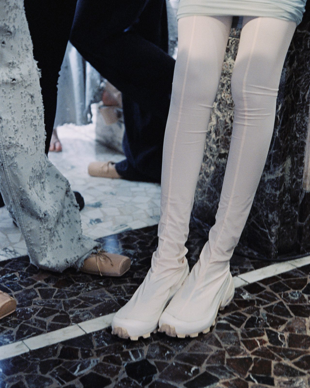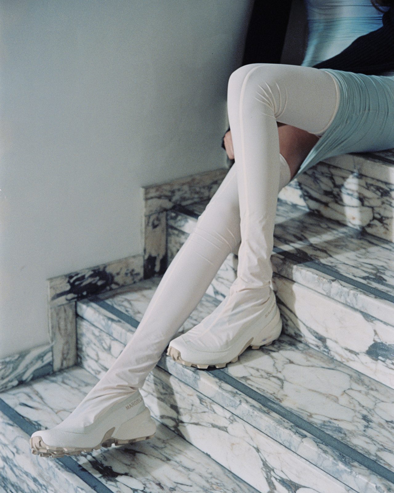 まずひとつは Salomon が長年培ってきたトレイルランニングのアイテムに不可欠な技術と MM6 の遊び心のあるデザインを融合したブーツ「Cross Wader」。トレイルランニングの頑丈な実用性をサイハイブーツで再現し、フランスのアウトドアスポーツブランドおなじみのシグネチャーを型破りな解釈で表現した。シューズは肌にフィットするように成型されたグリップの高いラバーソールを備えた革新的なシルエットで作られ、柔らかいブラック&エボニーとバニラ&アーモンドにシアンのアクセントを加えた、エレガントなカラー展開も魅力。