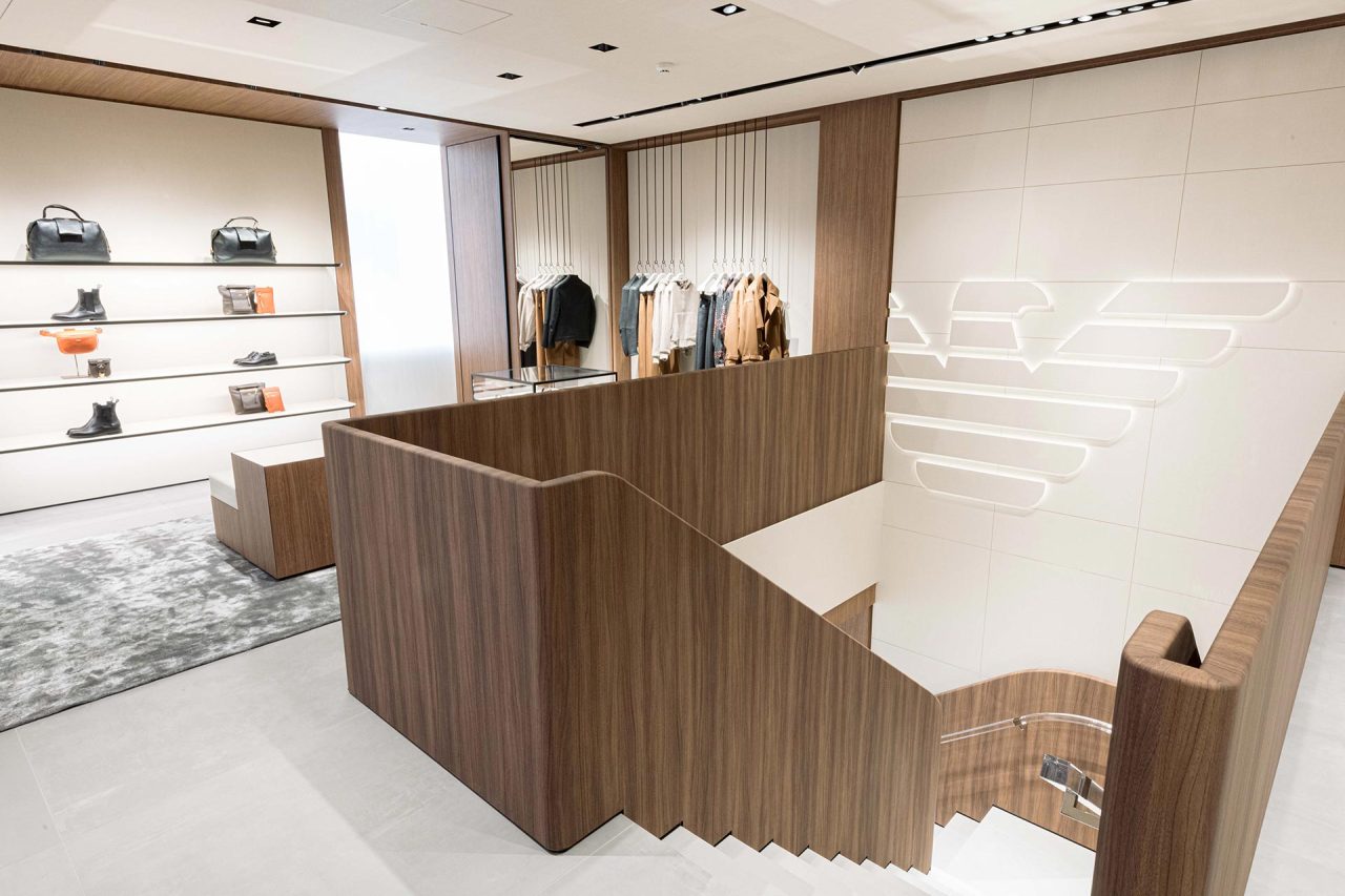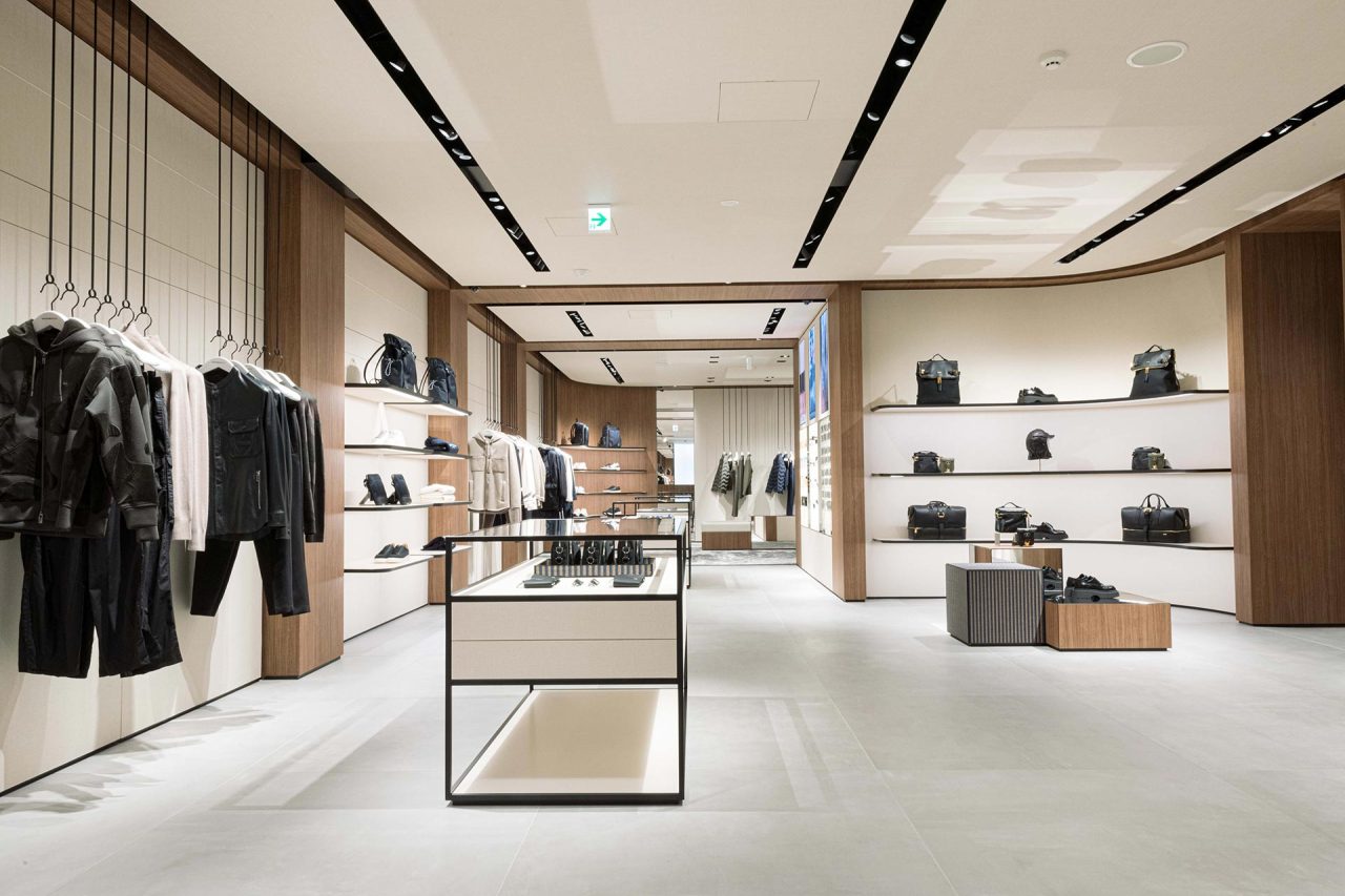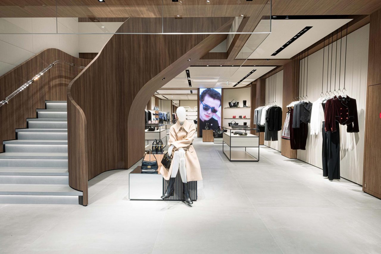 日本の歴史と文化が息づく美しい古都、京都のメインストリートである四条通りにオープンした新店舗では、木目ブラウンの天井とアイボリートーンの壁面のコントラストを採用。そして、店内は2フロア構成となっており、1階はウィメンズをはじめとするウェア、バッグ、シューズ、アクセサリー、2階はメンズを中心としたスーツを含むウェアや、小物が幅広く揃う。
