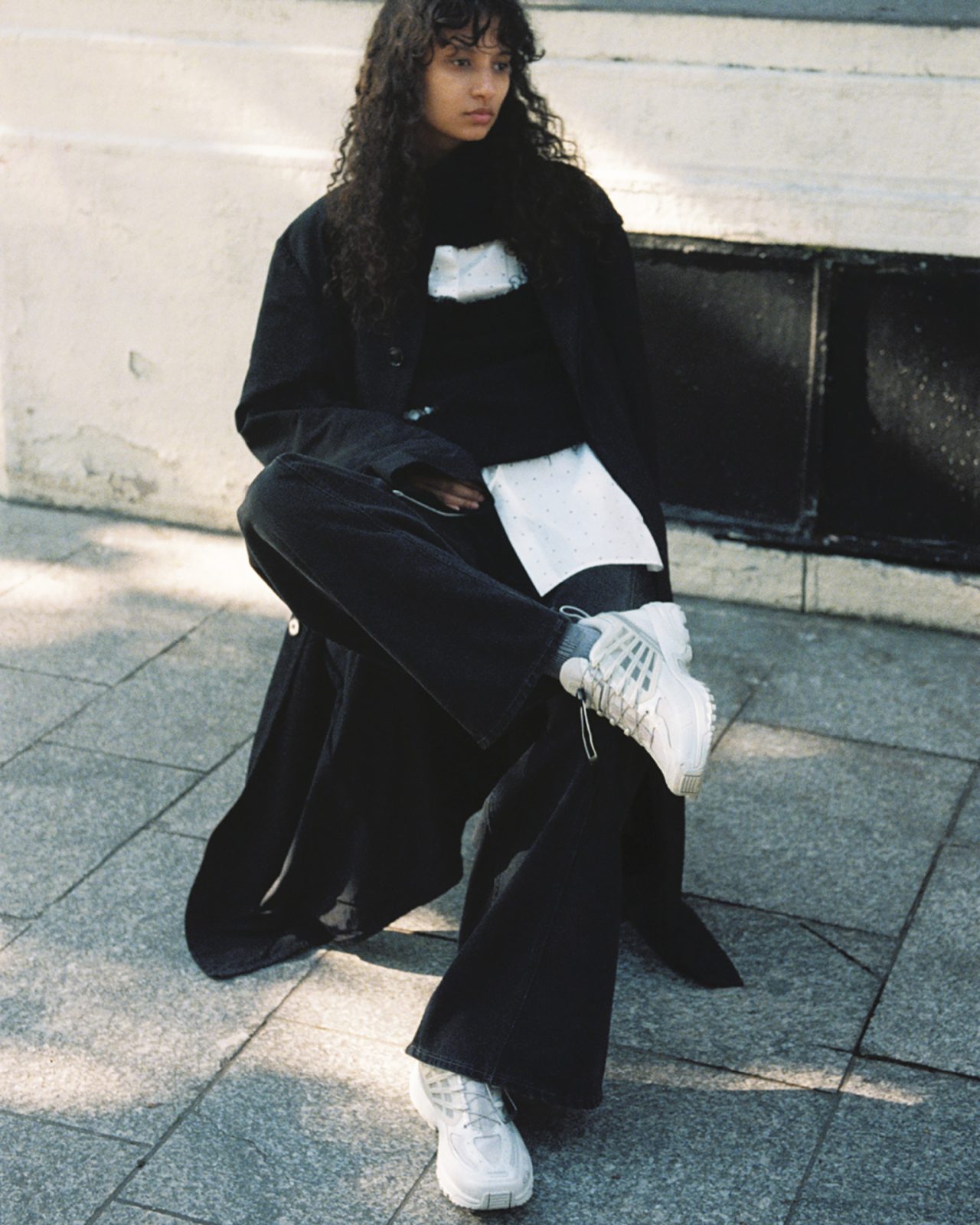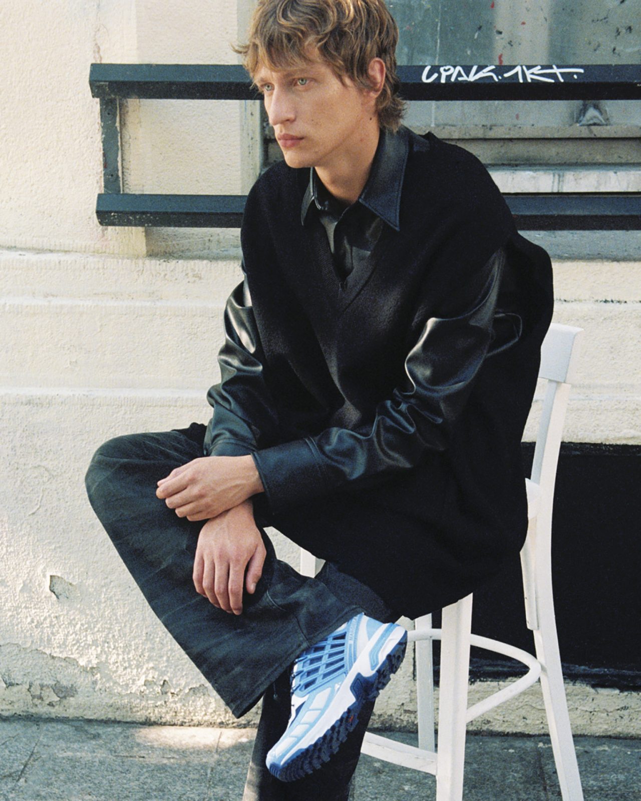 今回のコレクションで注目したいのは、Salomon の無骨でテクニカルなデザインが特徴的なアイコニックなシューズ「ACS Pro Trainer」を、MM6 Maison Margiela の独自の視点で再解釈した新作スニーカー。クリムメッシュアッパーとグリップ力の高いラバーソールが用いられた高機能性はそのままに、光沢のあるトリムとメタリックなアイレットにより、今までの「ACS Pro Trainer」とは異なる印象に仕上げられた。カラーはアイスグレー、ヘザーブルー、トーナルブラックの3色展開。