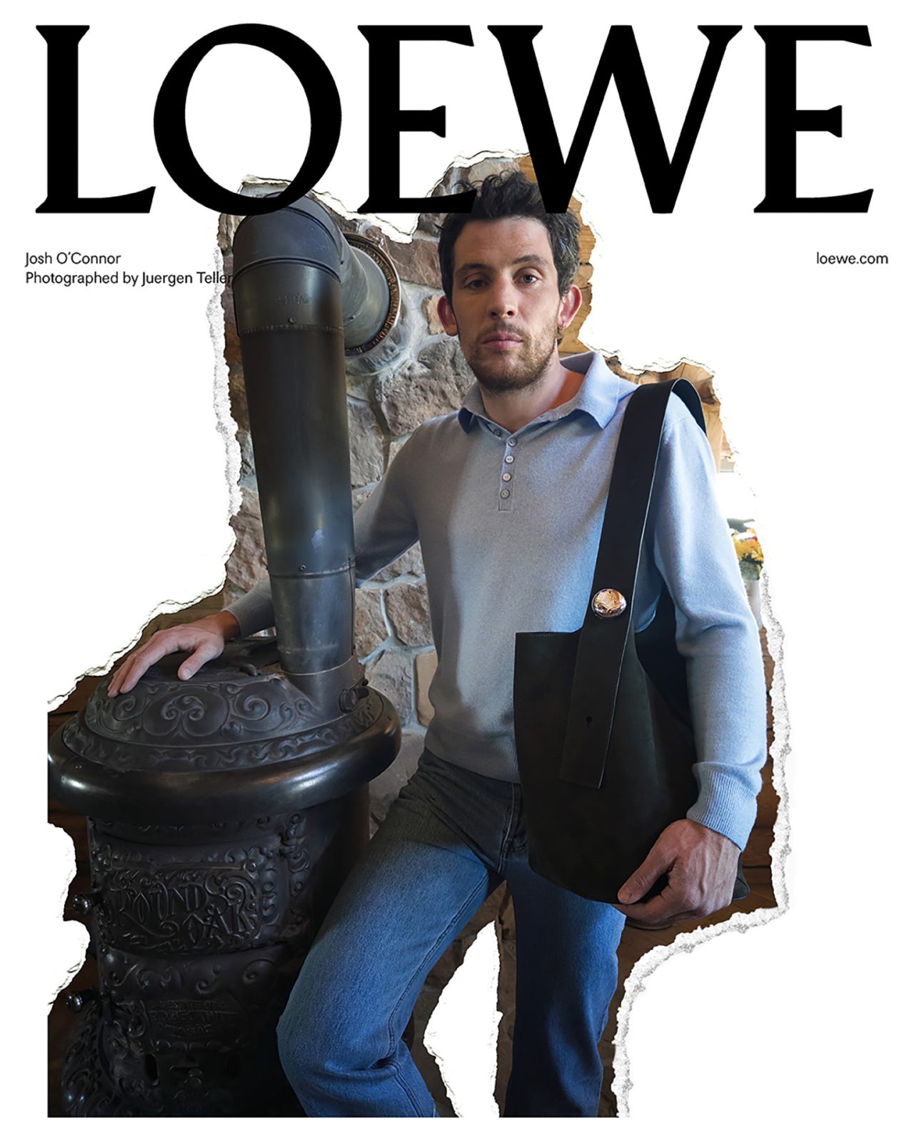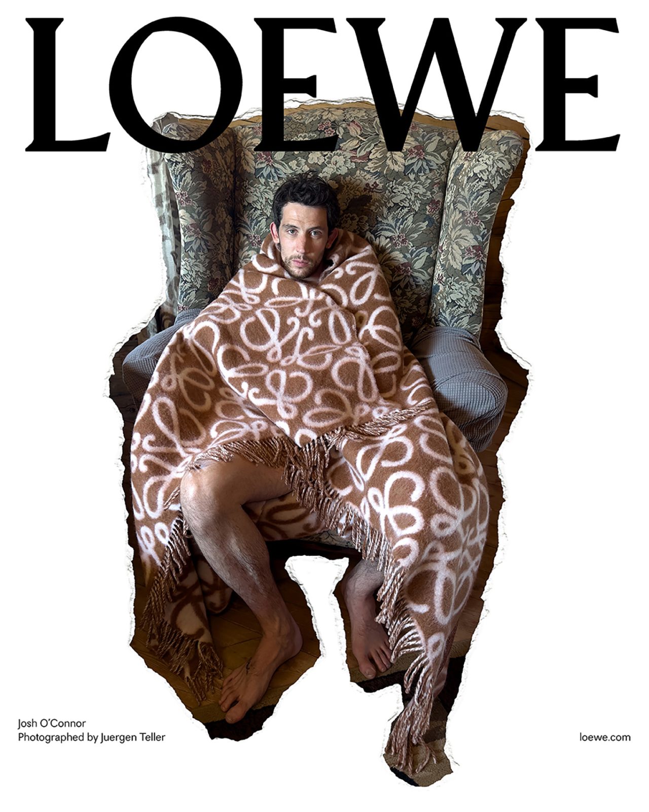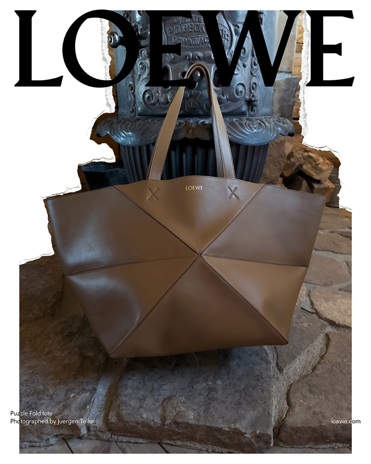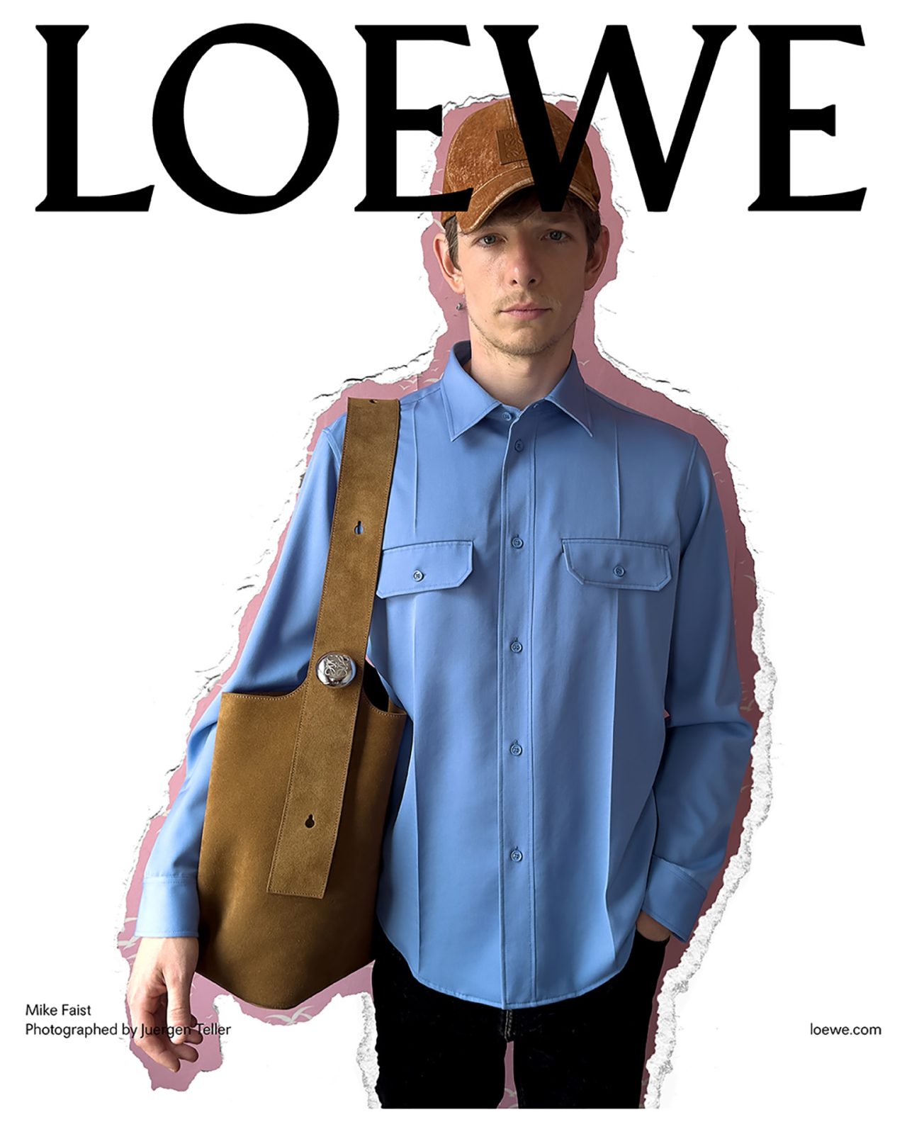 撮影を務めた Juergen Teller は過去に何度も LOEWE とのコラボを果たしており、前回の2023年秋冬プレコレクションでは、各ビジュアルに Juergen Teller 自身のアーカイブ作品を背景に使用するなど、常に挑戦的な作品を撮り続けている。またキャンペーンビジュアルは、一部を破り取られた写真を白い背景の上に置いて再撮影され、LOEWE の核であるクラフトへの信念から、このユニークな制作方法が採用された。