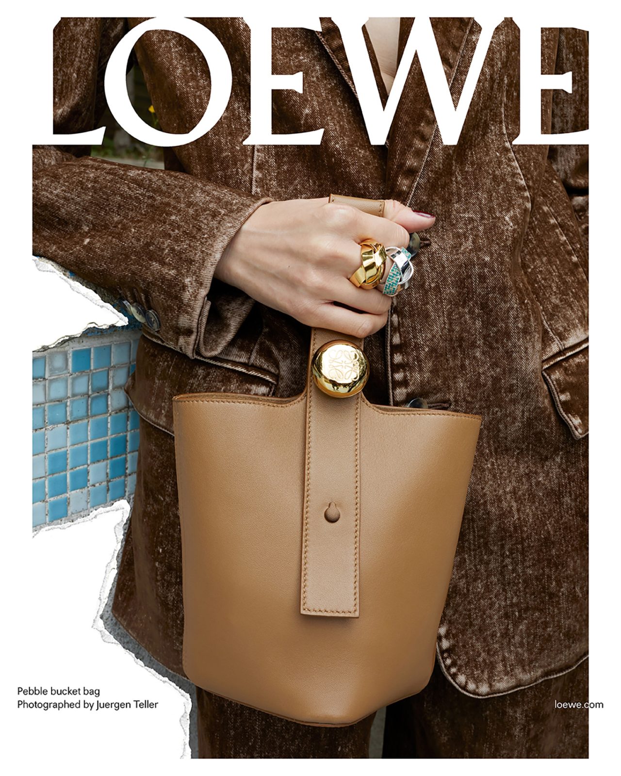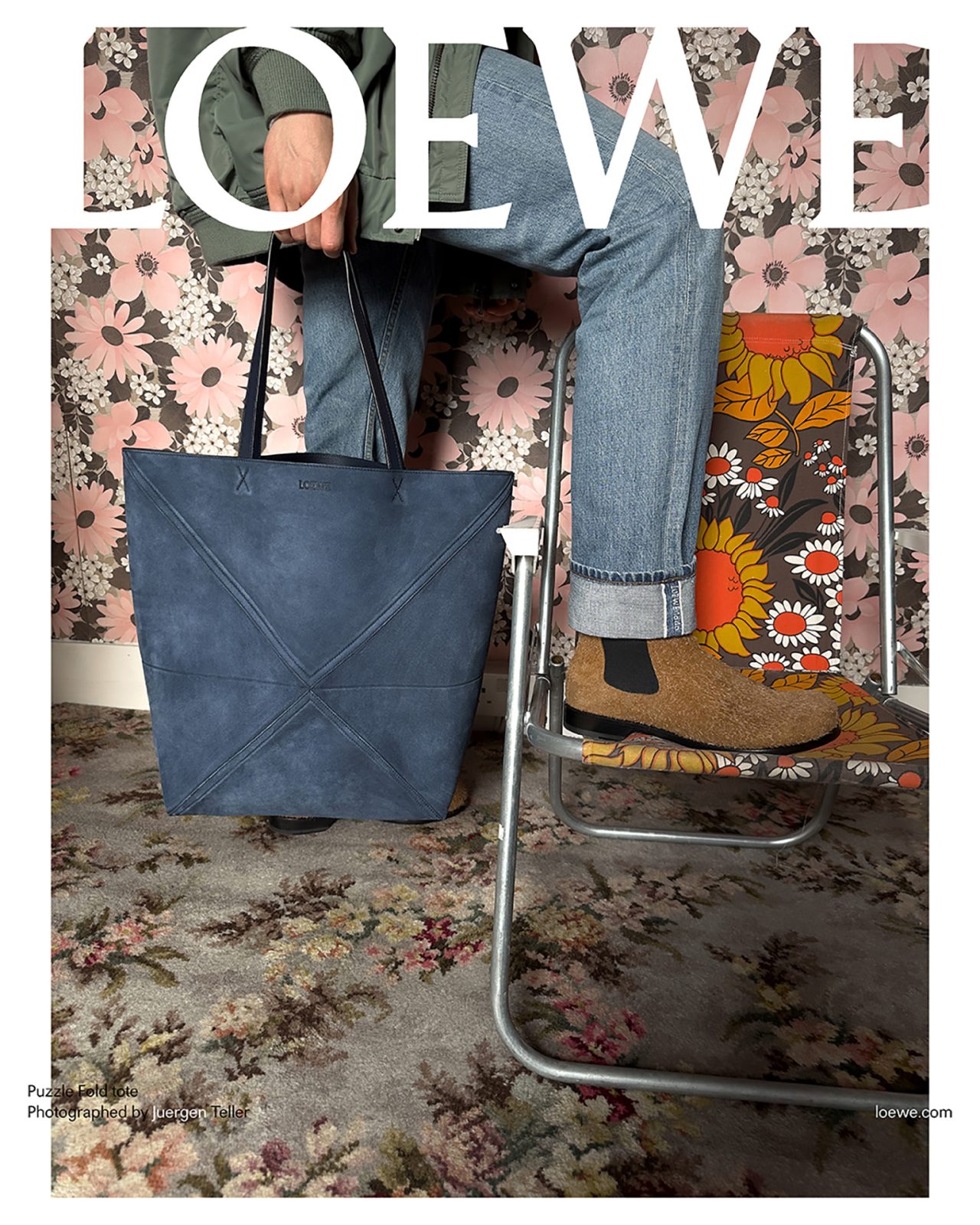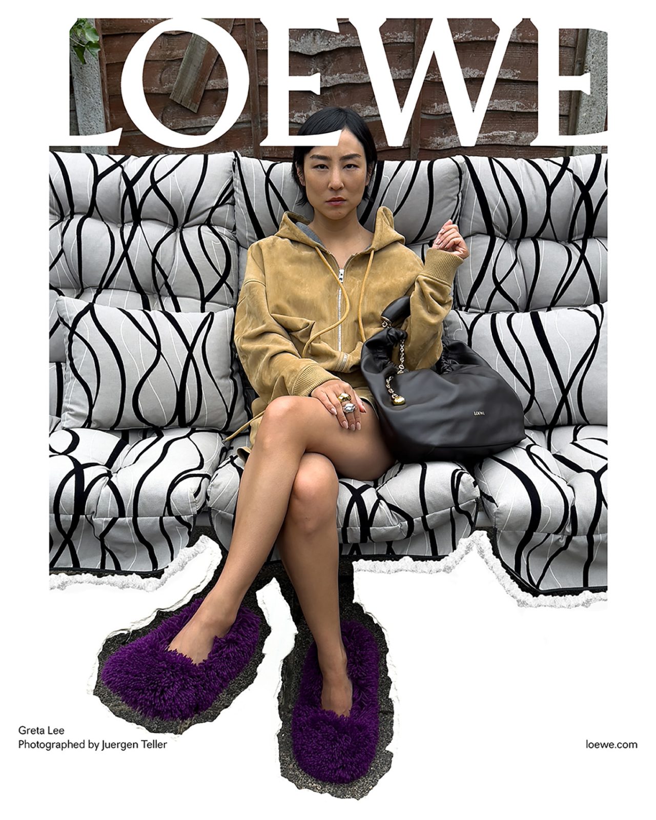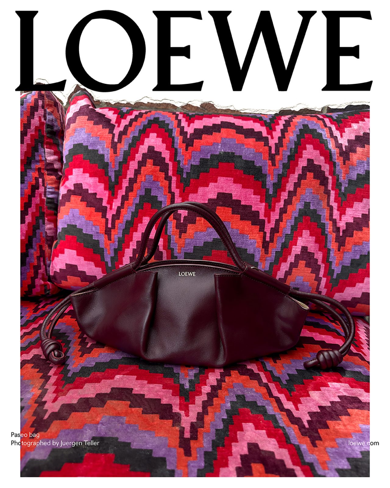撮影を務めた Juergen Teller は過去に何度も LOEWE とのコラボを果たしており、前回の2023年秋冬プレコレクションでは、各ビジュアルに Juergen Teller 自身のアーカイブ作品を背景に使用するなど、常に挑戦的な作品を撮り続けている。またキャンペーンビジュアルは、一部を破り取られた写真を白い背景の上に置いて再撮影され、LOEWE の核であるクラフトへの信念から、このユニークな制作方法が採用された。