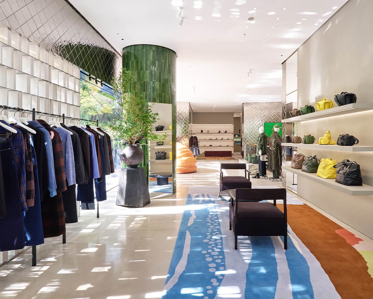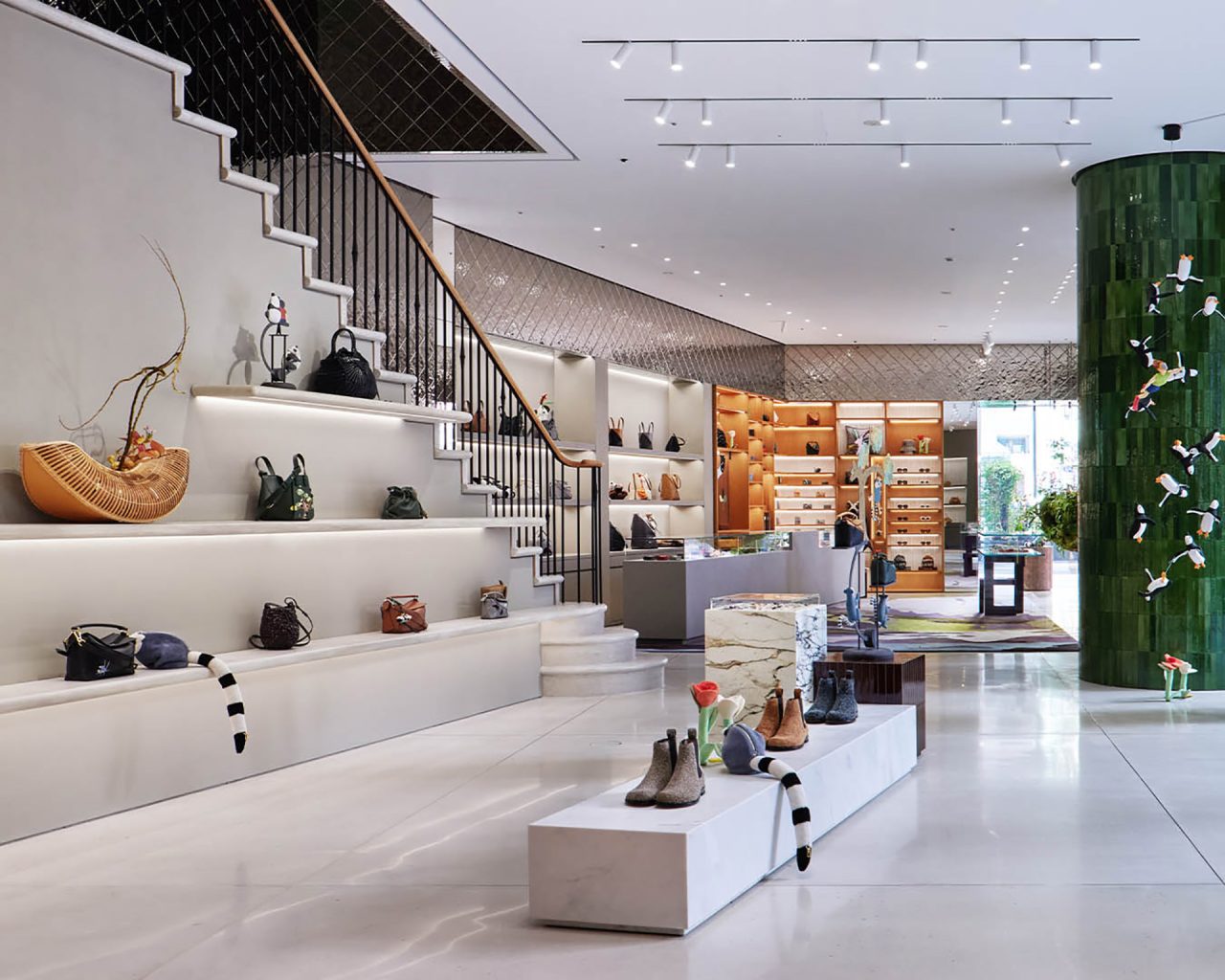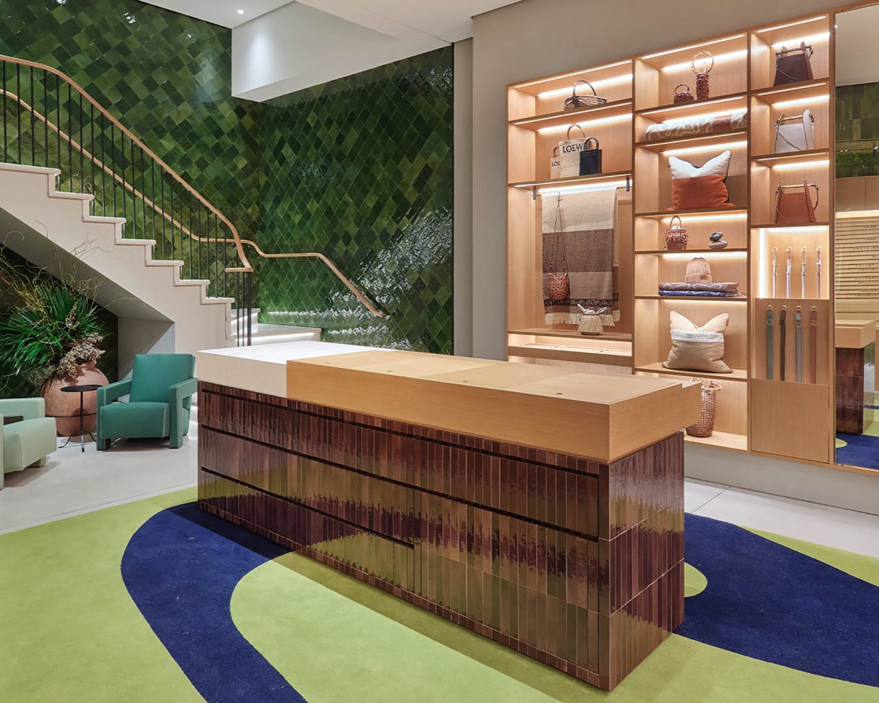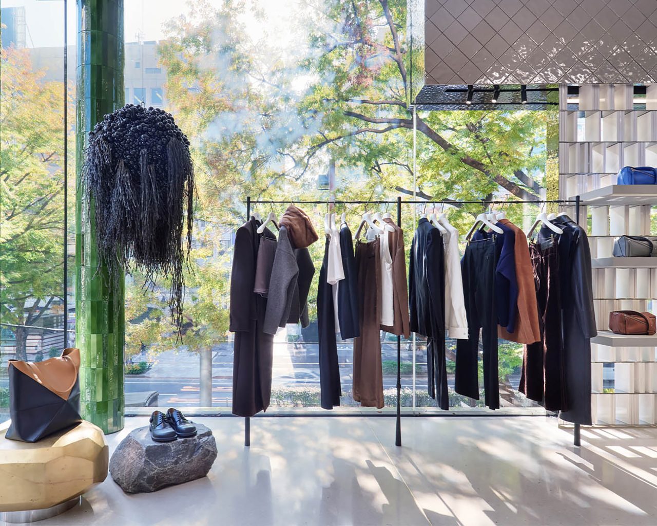 表参道店はクリエイティブ ディレクターの Jonathan Anderson (ジョナサン・アンダーソン) が初めて手がけた店舗で、各店舗をアートコレクターの邸宅としてイメージする「カサロエベ」というコンセプトのロールモデルとなった。そんな表参道店が、国内最大のロエベの店舗となったほか、革職人が在勤し、LOEWE の革製品の修理、補修サービスを提供する「LOEWE ReCraft」の都内初拠点としてリニューアル。店舗のデザインは、自然豊かな立地を活かし、表参道の街路樹を表現している。さらに、世界的アーティストである Pablo Picasso (パブロ・ピカソ) や Anthea Hamilton (アンセア・ハミルトン) の作品、四代田辺竹雲斎や TSUBAKI (ツバキ) などの日本人アーティストの作品も展示され、厳選した家具や「光の彫刻」とともに店舗の雰囲気を演出。店内では、バッグやシューズをはじめ、スカーフ、アイウェア、ジュエリー、メンズとウィメンズのウェア、アクセサリーを取り揃える。