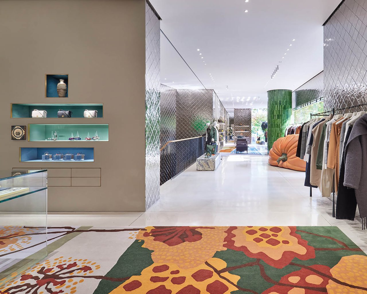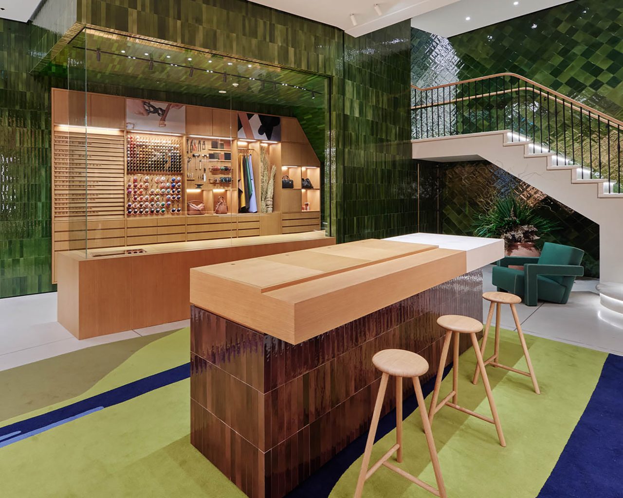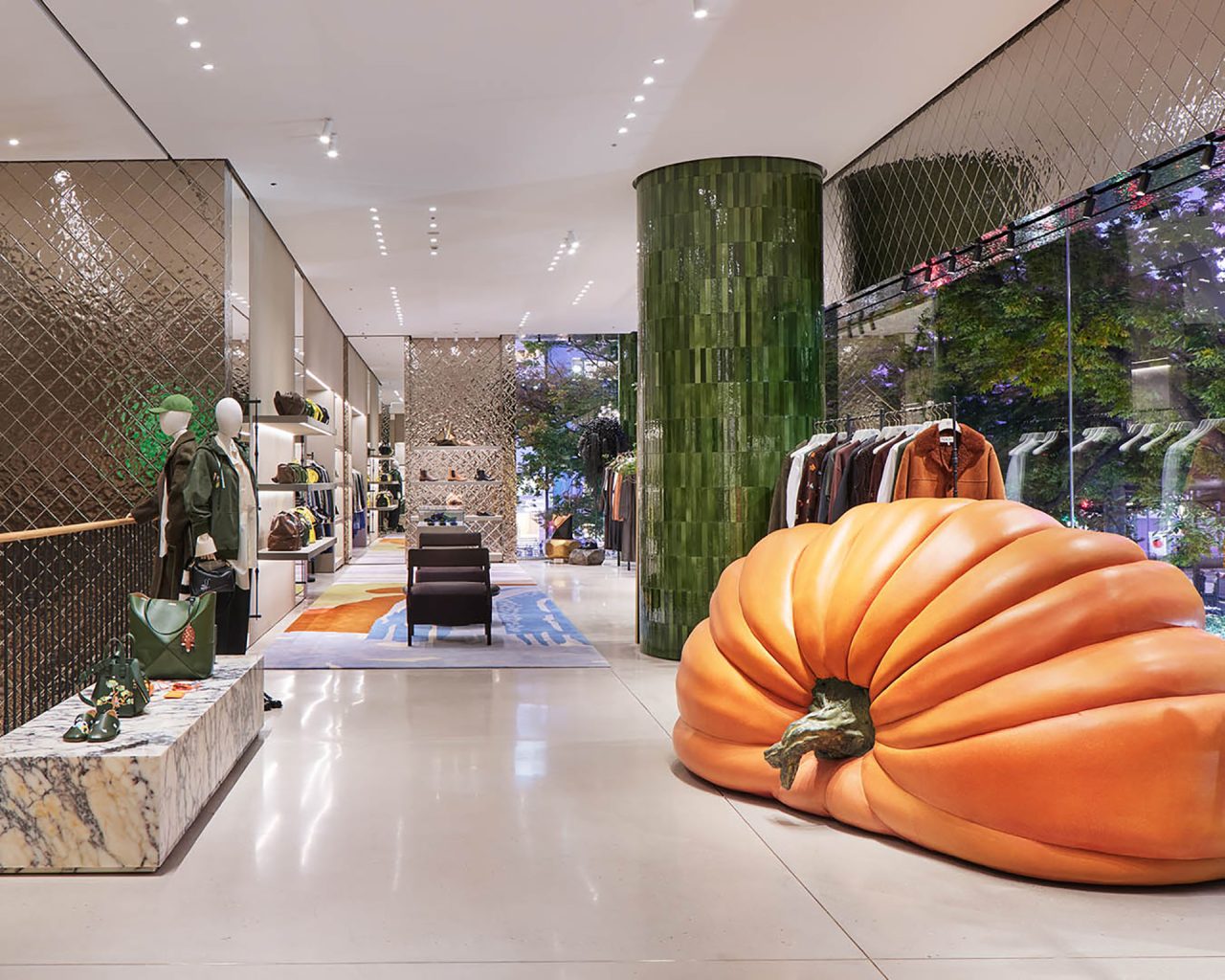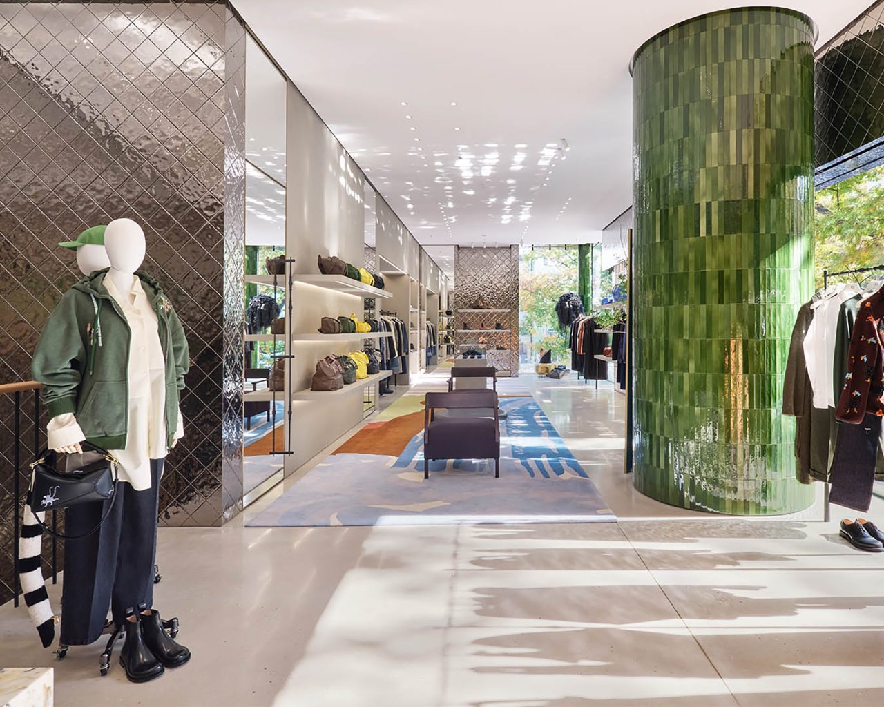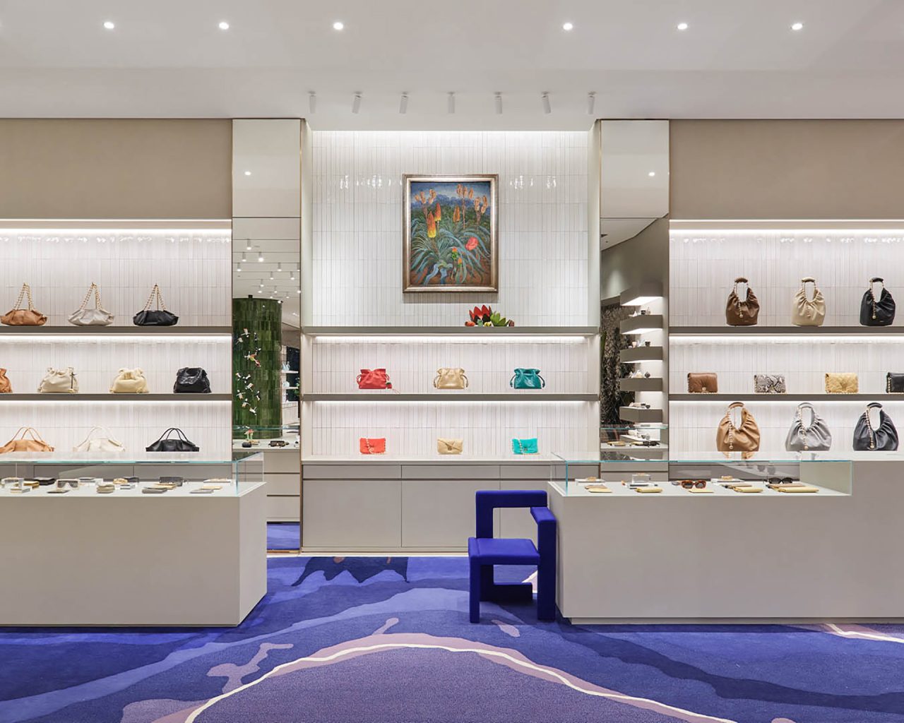 表参道店はクリエイティブ ディレクターの Jonathan Anderson (ジョナサン・アンダーソン) が初めて手がけた店舗で、各店舗をアートコレクターの邸宅としてイメージする「カサロエベ」というコンセプトのロールモデルとなった。そんな表参道店が、国内最大のロエベの店舗となったほか、革職人が在勤し、LOEWE の革製品の修理、補修サービスを提供する「LOEWE ReCraft」の都内初拠点としてリニューアル。店舗のデザインは、自然豊かな立地を活かし、表参道の街路樹を表現している。さらに、世界的アーティストである Pablo Picasso (パブロ・ピカソ) や Anthea Hamilton (アンセア・ハミルトン) の作品、四代田辺竹雲斎や TSUBAKI (ツバキ) などの日本人アーティストの作品も展示され、厳選した家具や「光の彫刻」とともに店舗の雰囲気を演出。店内では、バッグやシューズをはじめ、スカーフ、アイウェア、ジュエリー、メンズとウィメンズのウェア、アクセサリーを取り揃える。
