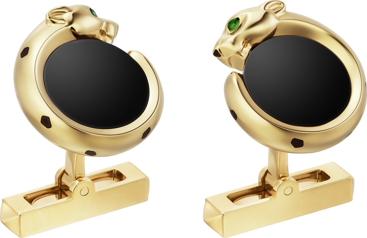 「パンテール ドゥ カルティエ」カフリンクス YG × ツァボライト × ブラックラッカー × オニキス 18.9 × 16.8 mm ¥1,478,400 (Antoine Pividori © Cartier)