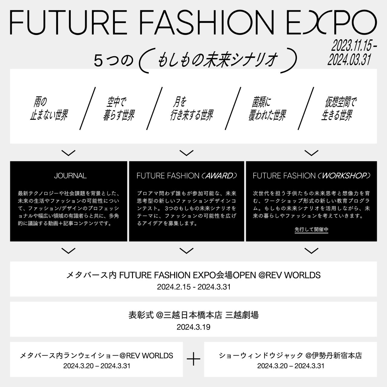 三越伊勢丹が新たに立ち上げた「FUTURE FASHION EXPO」は、現在の社会課題や最新テクノロジーを背景とした「もしもの未来シナリオ」を題材とするイベント。このイベントは、デザインを楽しむだけでなく、未来のライフスタイルを多くの人とともに考えるきっかけを作りたいという想いから実現した。今回は、5つのシナリオをテーマにしており、「FUTURE FASHION AWARD (フューチャー ファッション アワード)」、「FUTURE FASHION WORKSHOP (フューチャー ファッション ワークショップ)」、「JOURNAL (ジャーナル)」などの企画から構成されている。