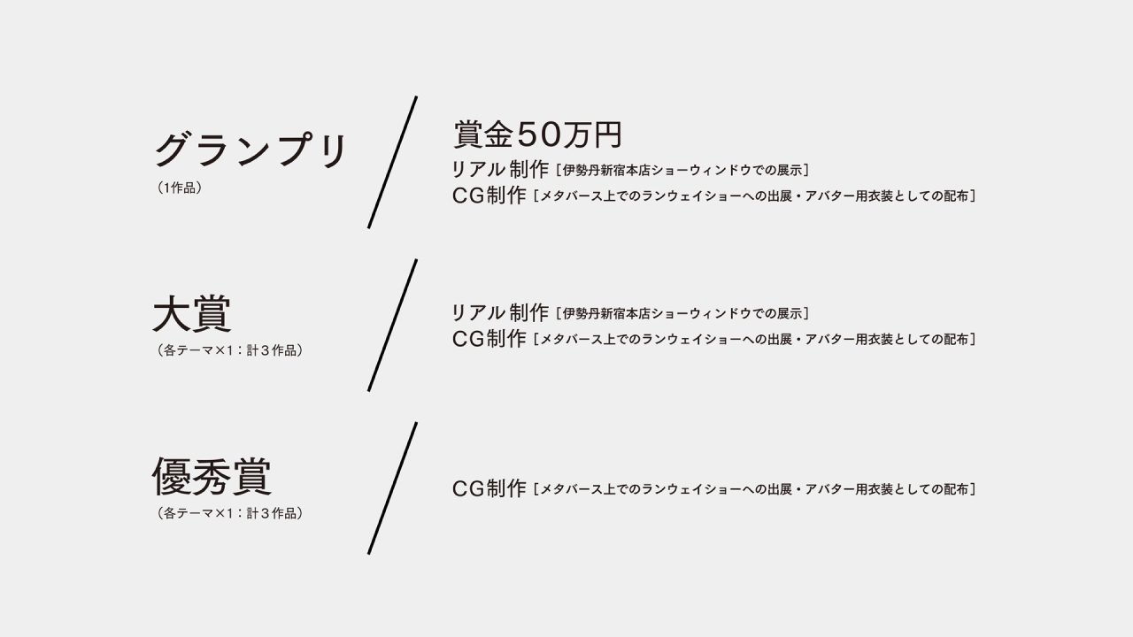 メインプロジェクトの「FUTURE FASHION AWARD」は、誰もが応募可能な未来思考型の新しいファッションデザインコンテストである。「⾬の⽌まない世界」、「空中で暮らす世界」、「⽉を⾏き来する世界」の3つのもしもの未来シナリオをテーマとし、それぞれの未来における暮らしを豊かにする自由なファッションアイデアを募集している。選出された受賞作品は、リアルとデジタルで服として形になり、伊勢丹新宿本店のショーウィンドウやメタバース空間にて展⽰される予定だ。エントリー期間はすでに開始されており、2024年1月5日(金)が締め切りとなっている。