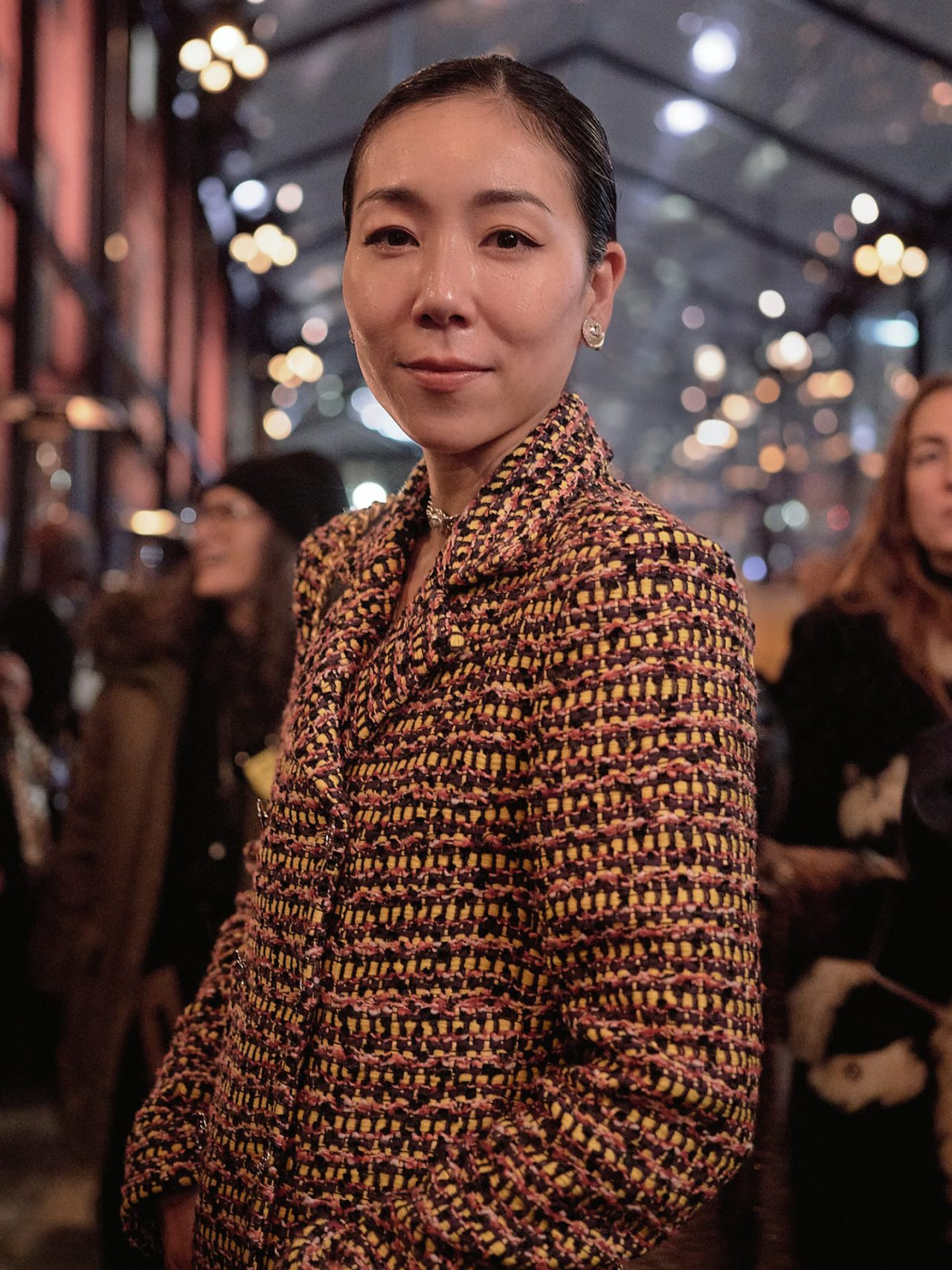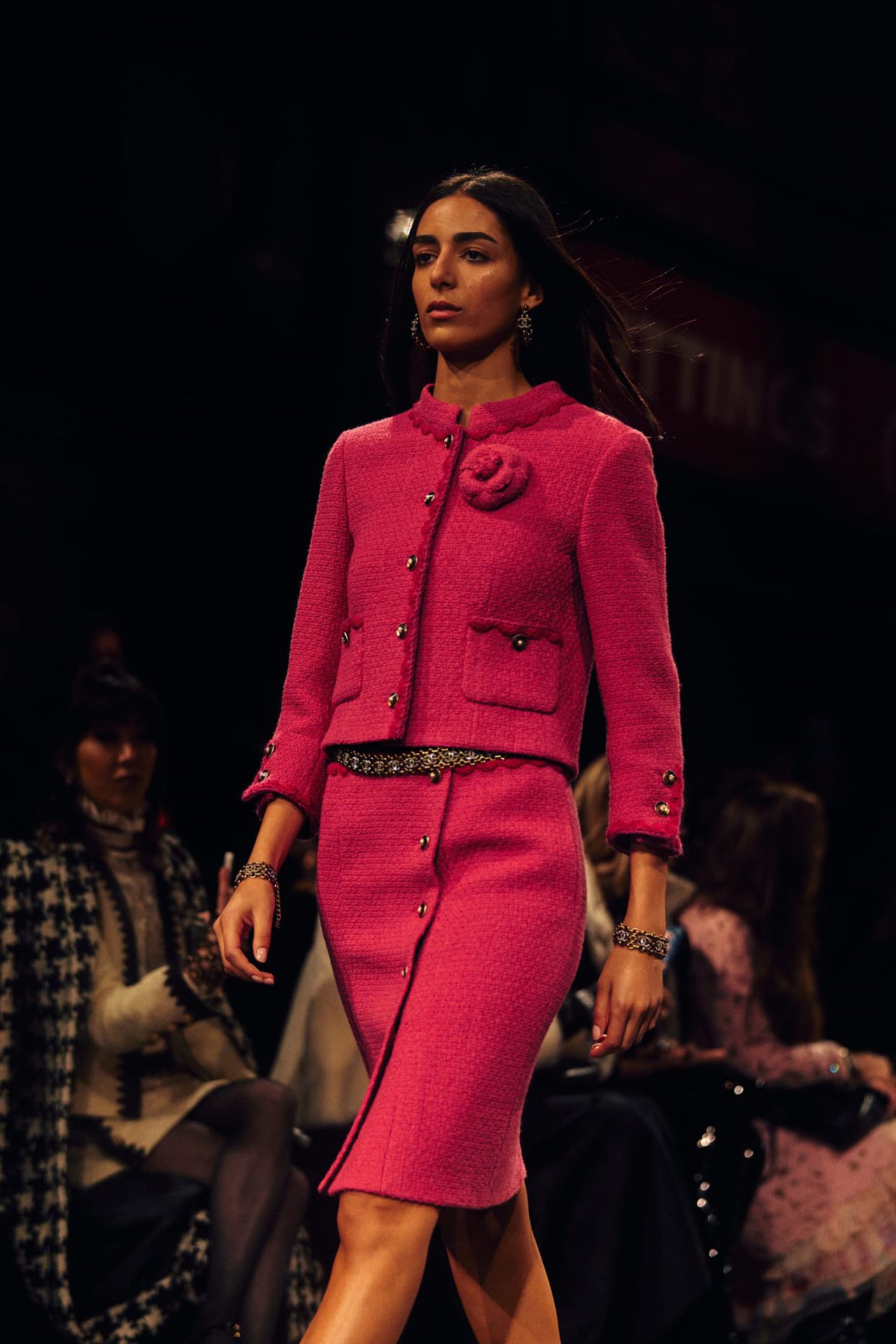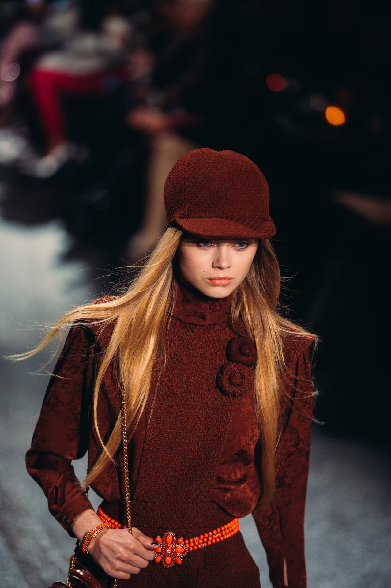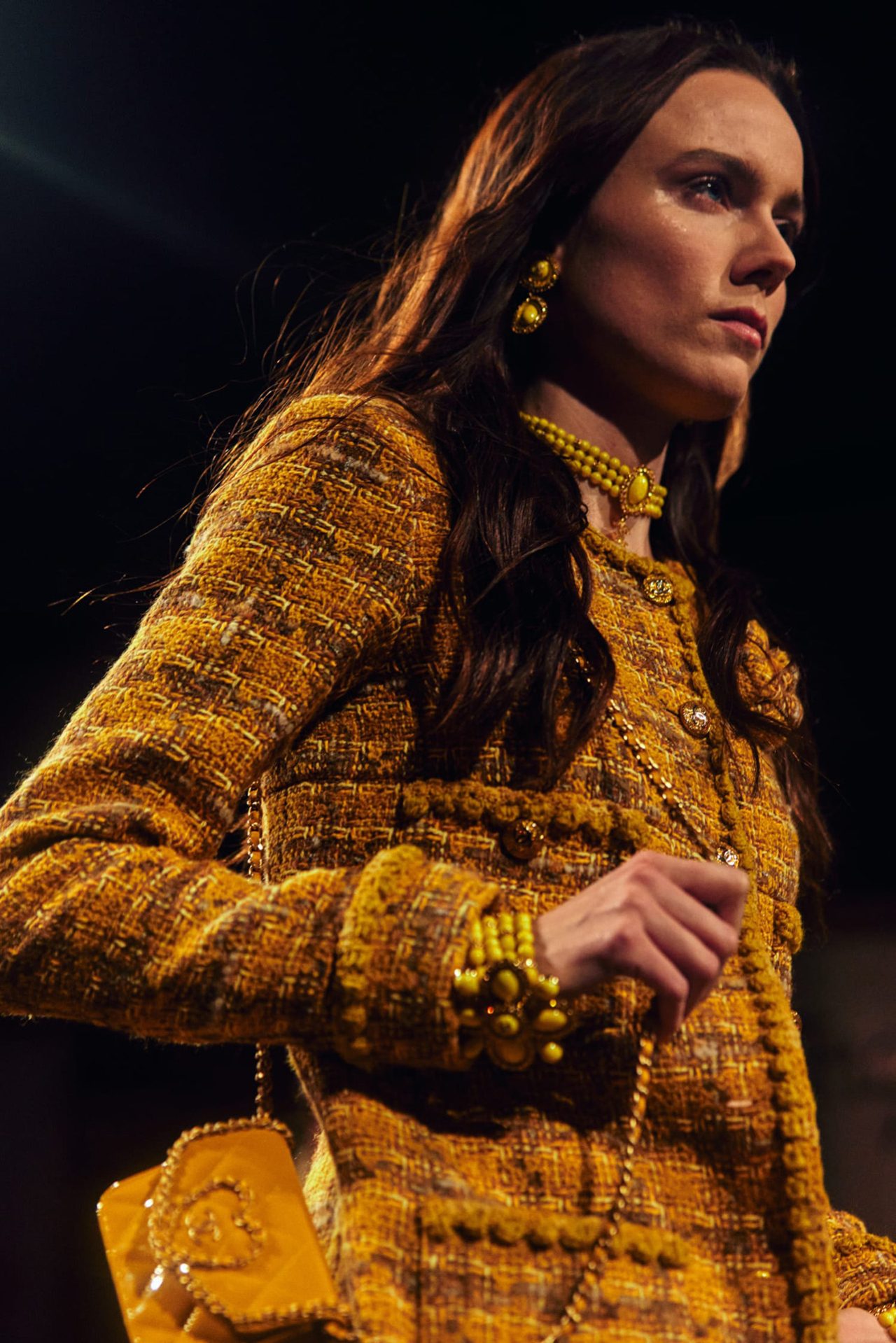 2023/24 年 メティエダール コレクションでは、メゾンの代名詞であるツイードが主役に。ツイードに色を取り入れた Gabrielle Chanel からヒントを得て、鮮やかでポップなスピリットが加わった。スーツやバッグを彩るサーモンピンク、パンプキン、アップルグリーン、マスタード、 スカイブルー、レッド、そしてセピアという配色が60年代の雰囲気を醸し出し、フェミニンで唯一無二なルックの数々を輝かせる。