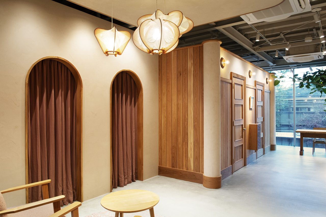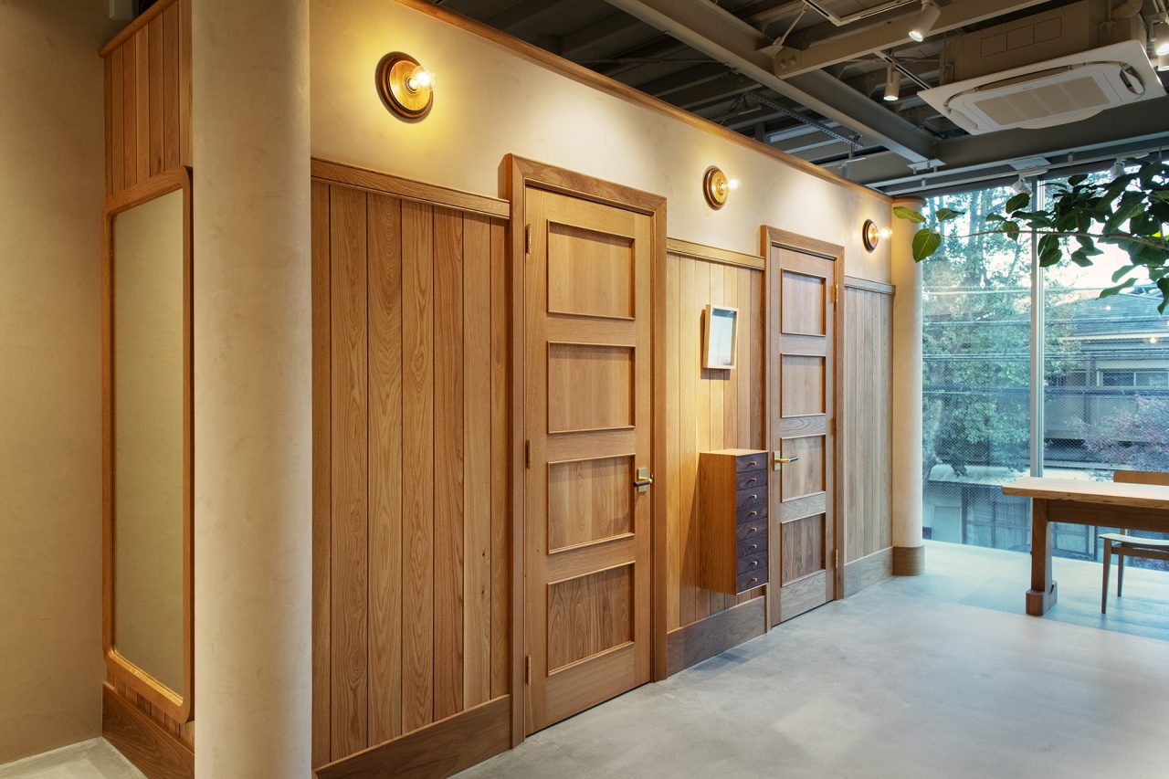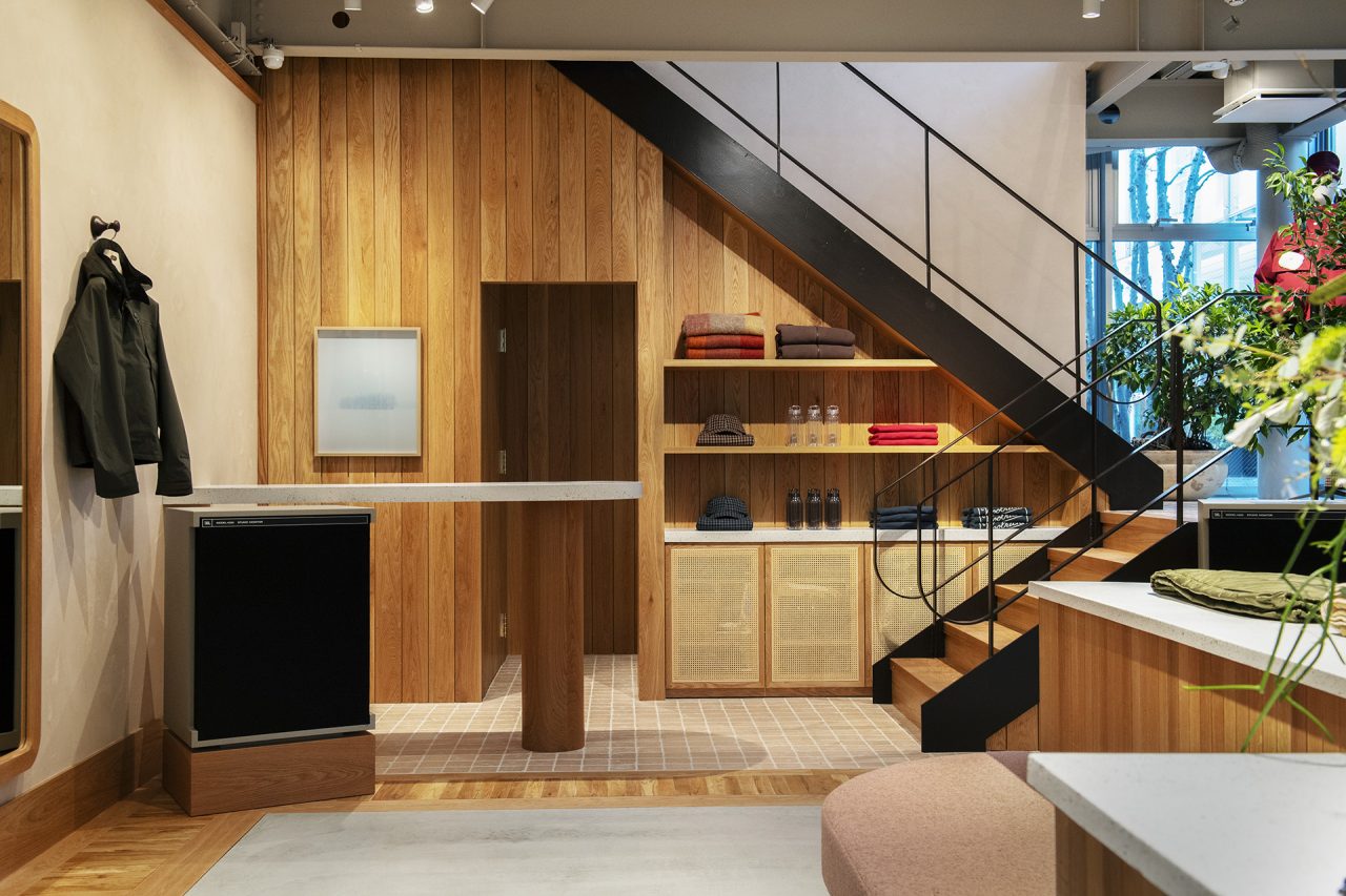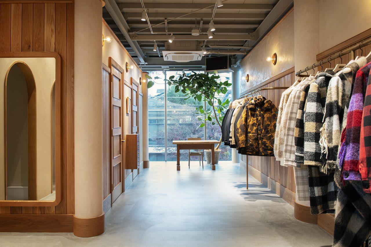 「WOOLRICH OUTDOOR LABEL DAIKANYAMA (ウールリッチ アウトトドアレーべル ダイカンヤマ)」の内装デザインは、家具職人の鰤岡力也氏が主宰する MOBLEY WORKS (モーブレーワークス) が担当。採光を重視した明るく開放的な空間には、素朴で温かみのあるオーク材を基調に、真鍮の什器を配置し、床には天然石のタイルを、壁にウールを混ぜ込んだ左官を選定。異なる素材のコントラストやテクスチャーを用いてブランドの世界観を巧みに表現した。