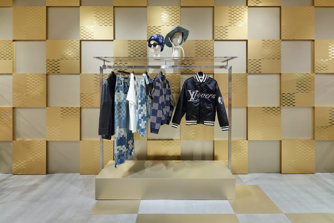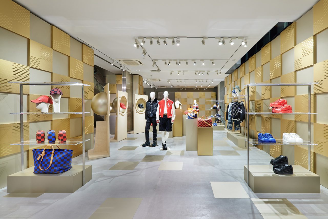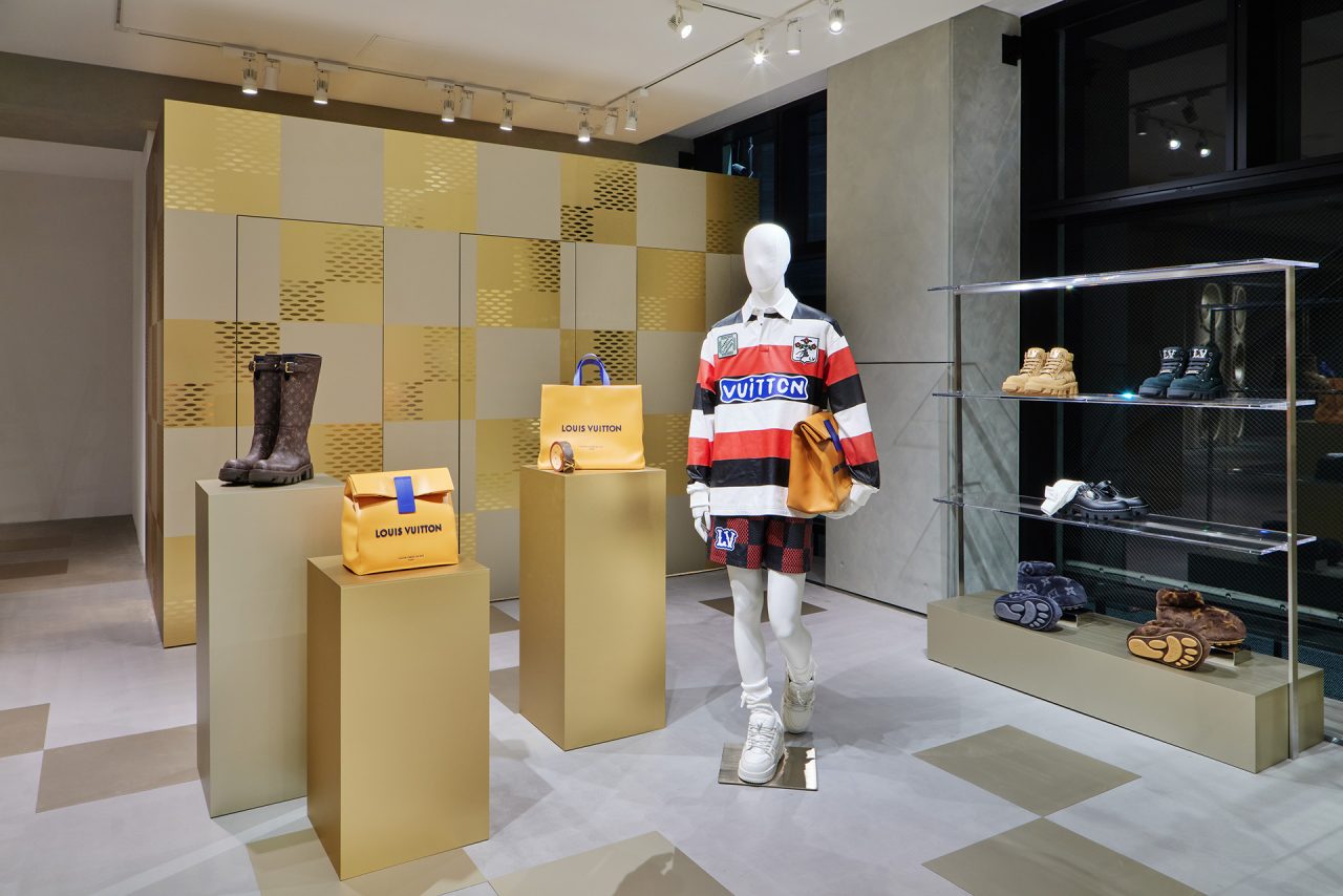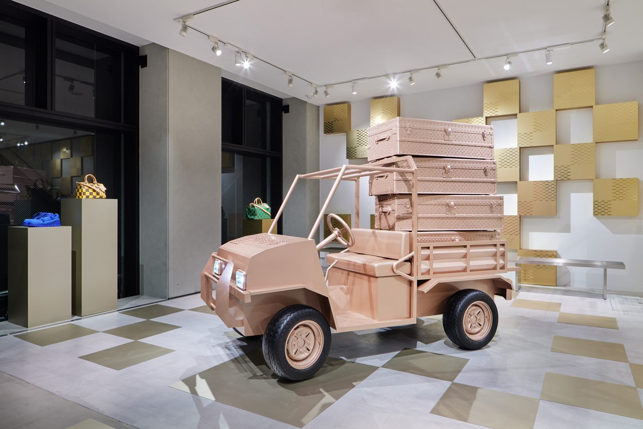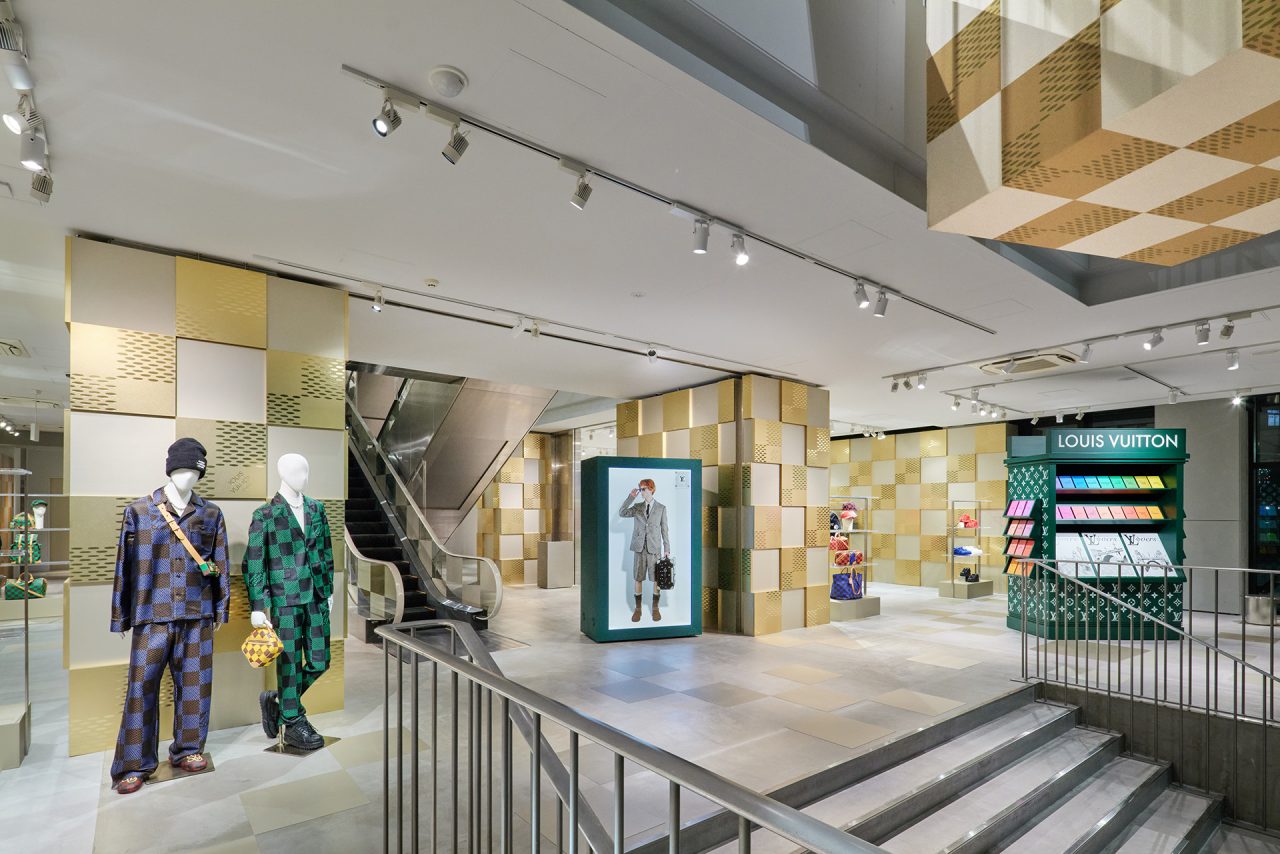 ダミエ・パターンに彩られたファサードに出迎えられ、店内に入るとゴールドカラーを基調とした空間が広がる。天井からはキューブ型のインスタレーションが吊るされ、デジタルアニメーションや Louis Vuitton 仕様のゴルフカートやブックストアを連想させるディスプレイが並ぶ。ペパーミントグリーンに染まった2階は、壁一面にモニターやスピーカーが設置され、デジタル化したダモフラージュ・モチーフやアイコニックなダミエ、モノグラムを取り入れた本コレクションの雰囲気が忠実に体現された。