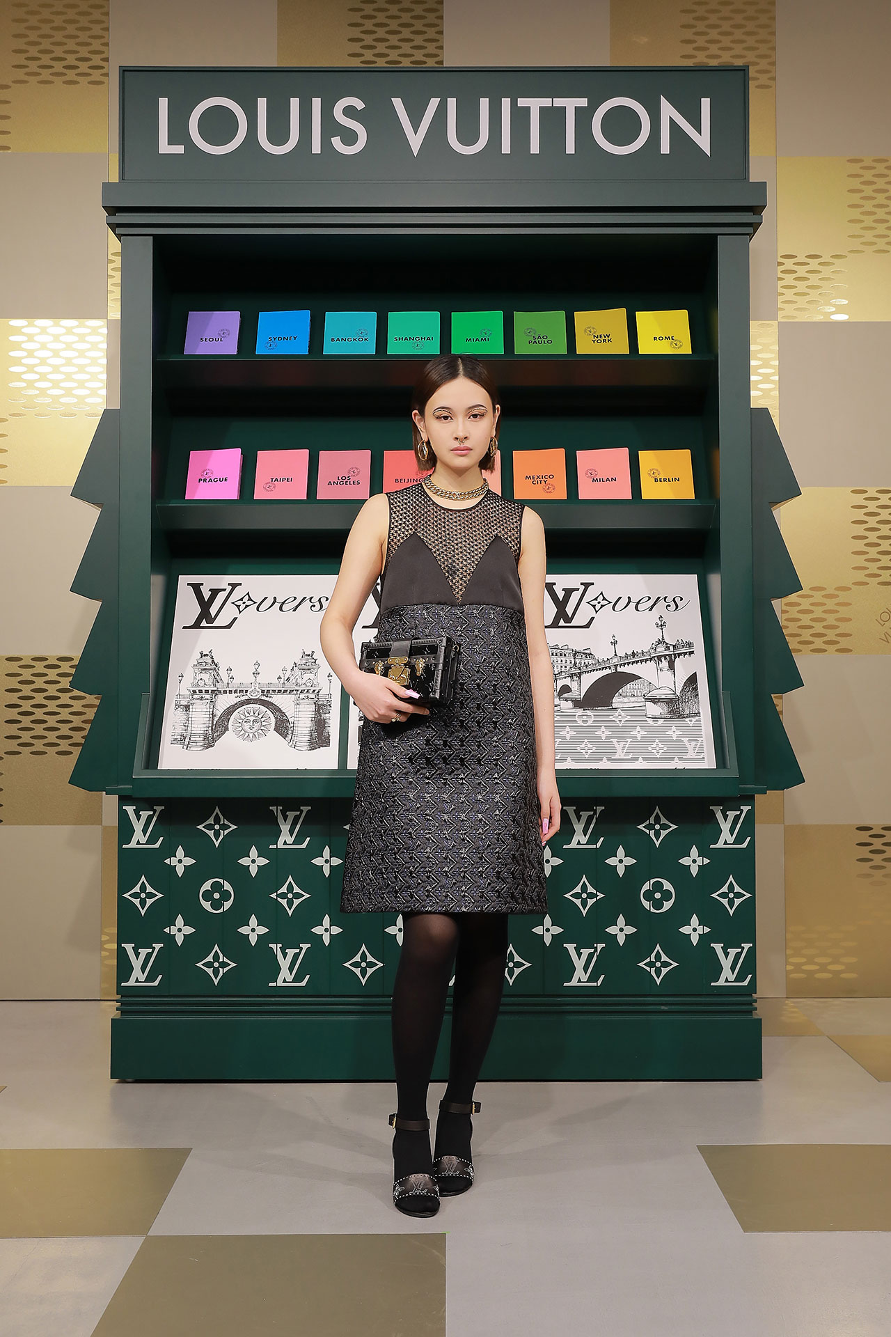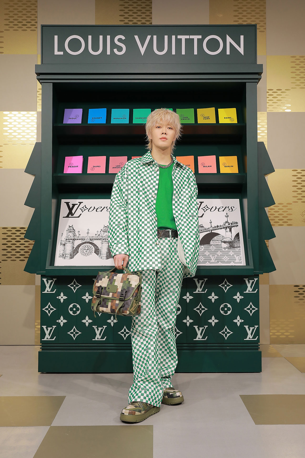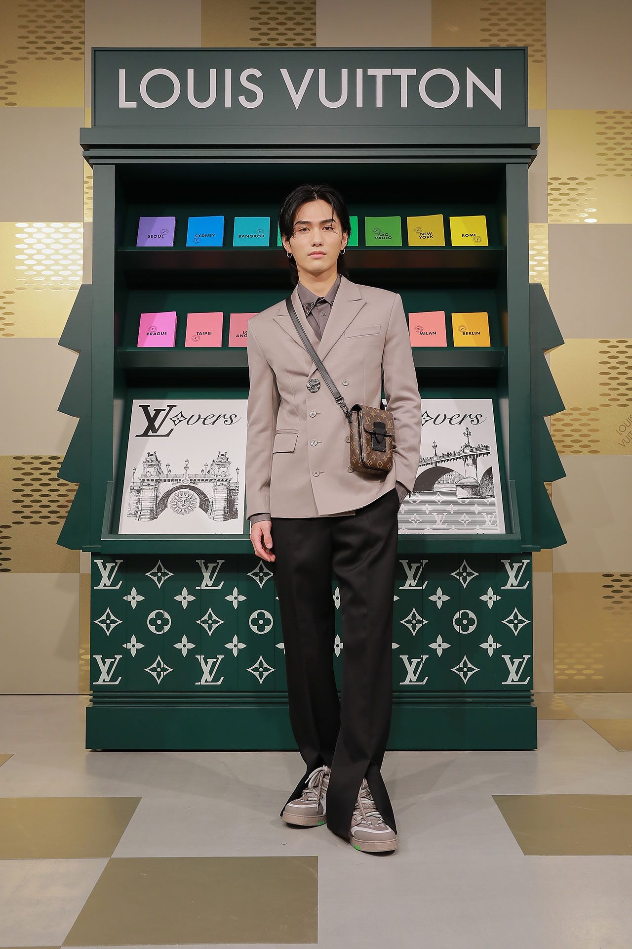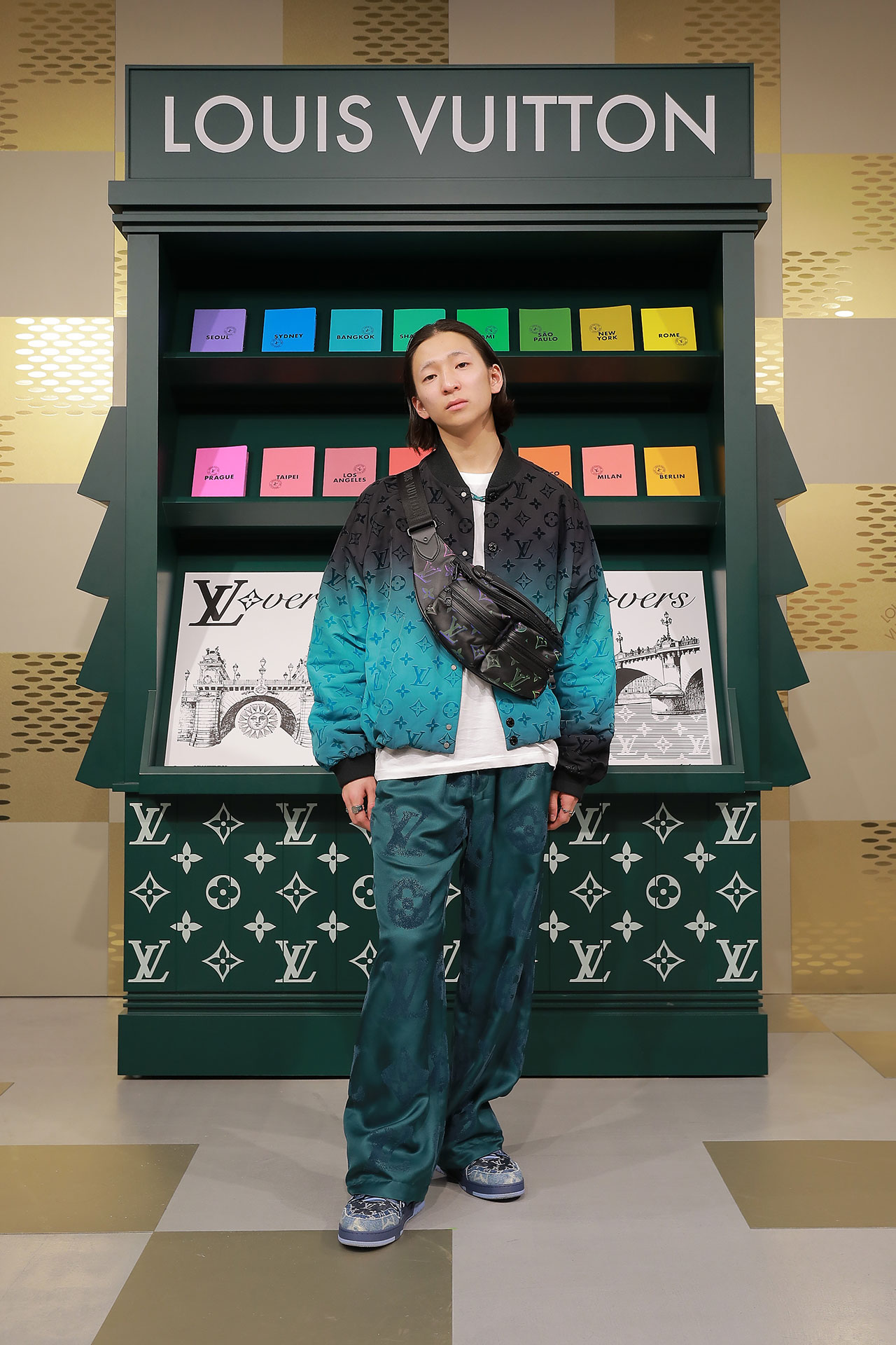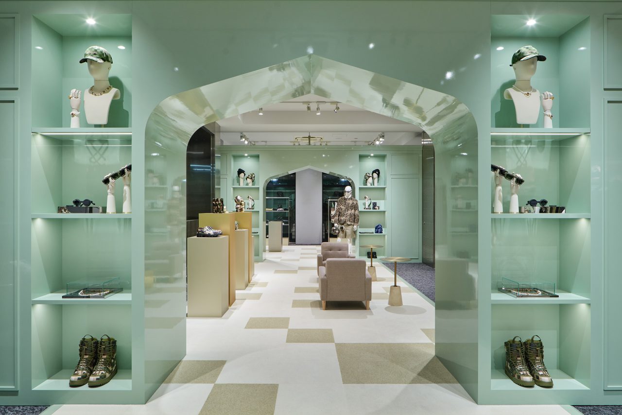 ダミエ・パターンに彩られたファサードに出迎えられ、店内に入るとゴールドカラーを基調とした空間が広がる。天井からはキューブ型のインスタレーションが吊るされ、デジタルアニメーションや Louis Vuitton 仕様のゴルフカートやブックストアを連想させるディスプレイが並ぶ。ペパーミントグリーンに染まった2階は、壁一面にモニターやスピーカーが設置され、デジタル化したダモフラージュ・モチーフやアイコニックなダミエ、モノグラムを取り入れた本コレクションの雰囲気が忠実に体現された。