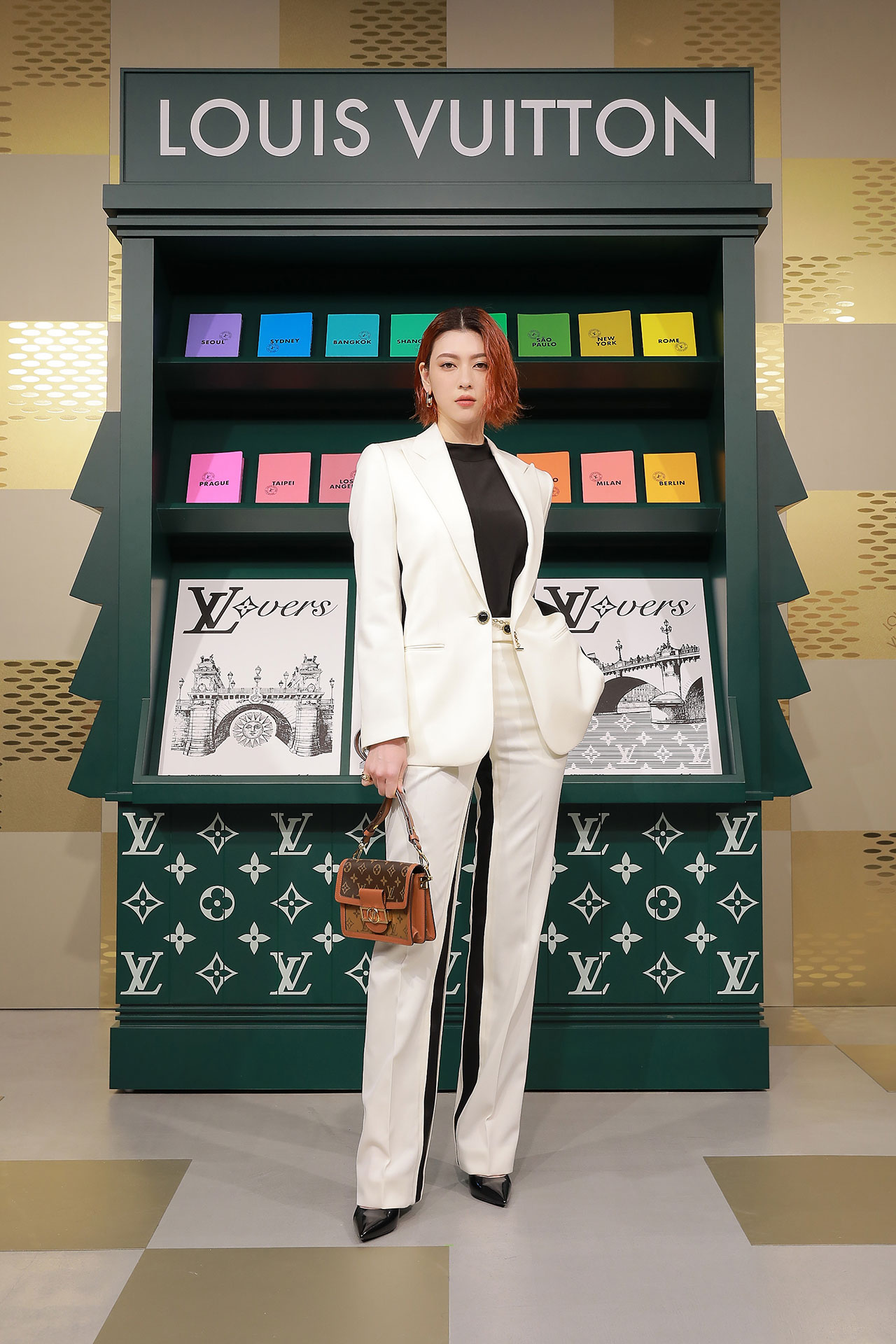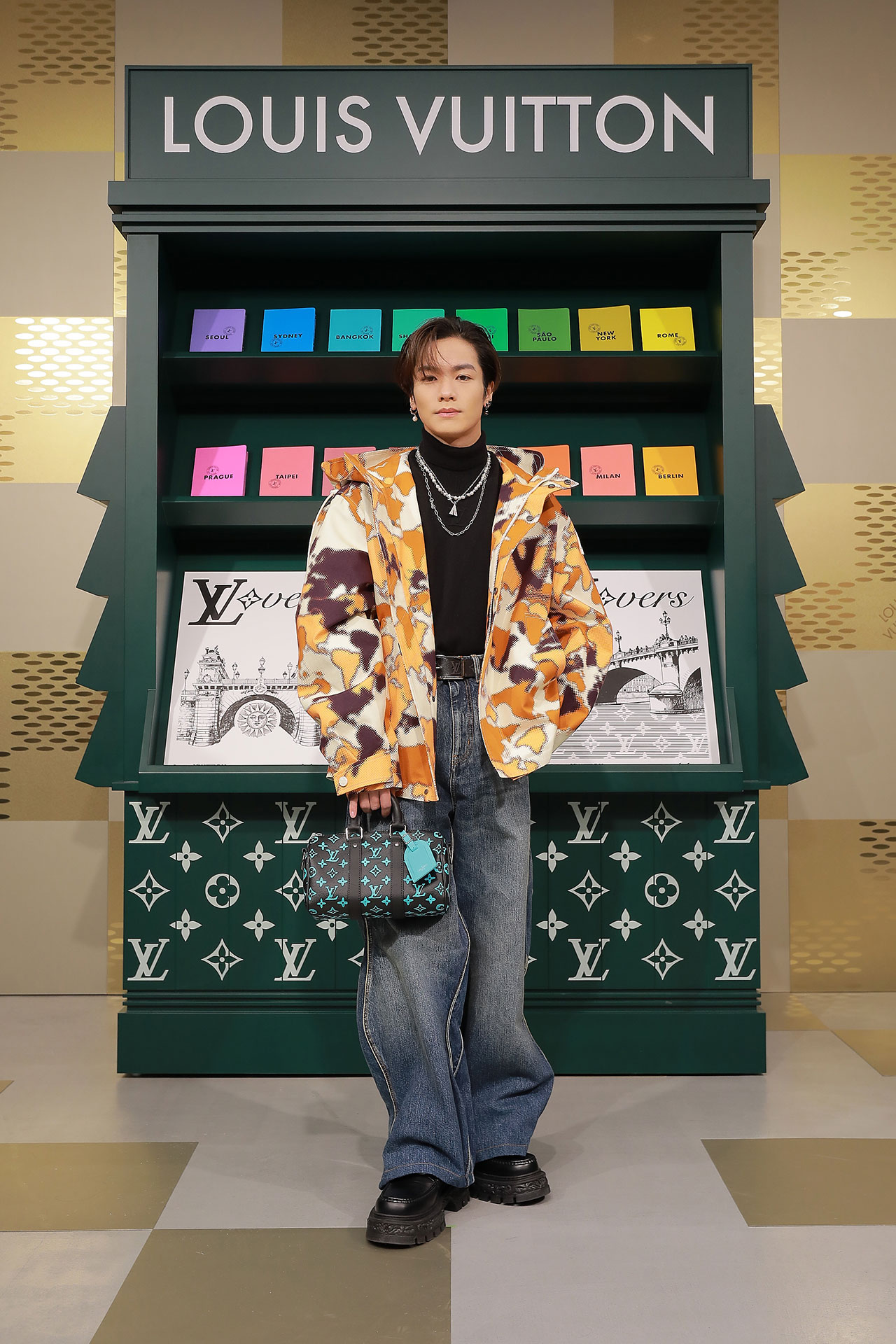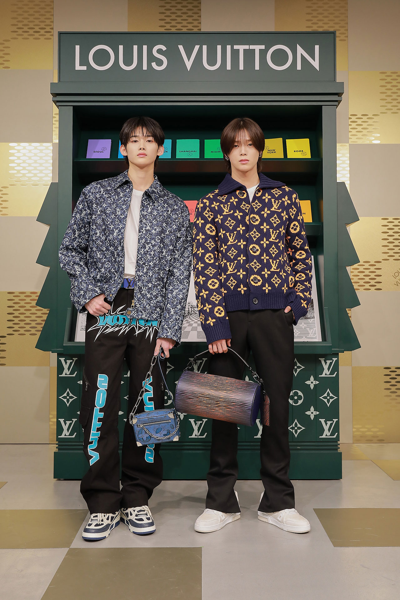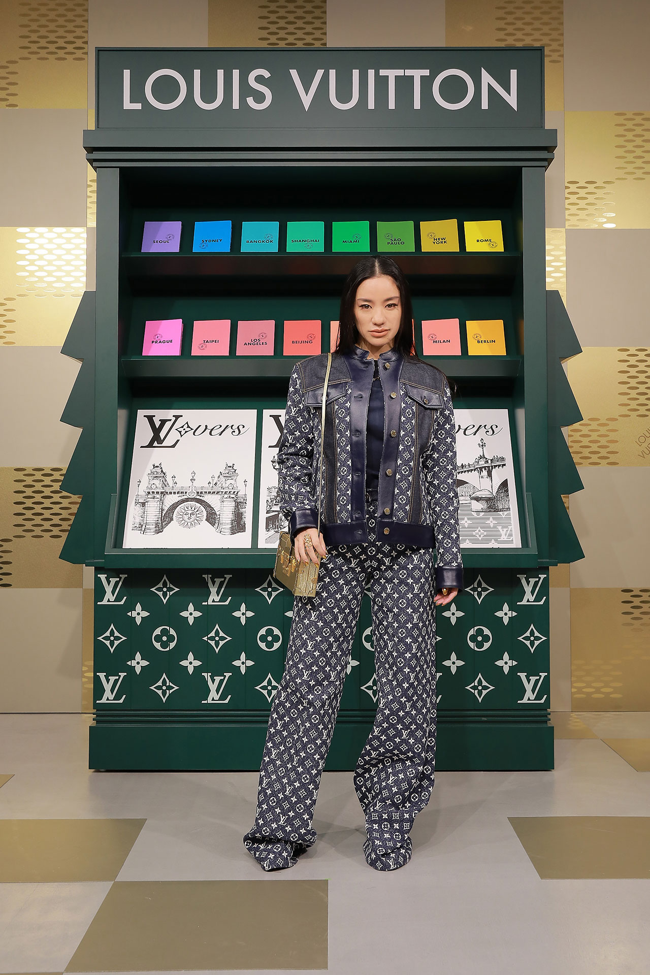 ダミエ・パターンに彩られたファサードに出迎えられ、店内に入るとゴールドカラーを基調とした空間が広がる。天井からはキューブ型のインスタレーションが吊るされ、デジタルアニメーションや Louis Vuitton 仕様のゴルフカートやブックストアを連想させるディスプレイが並ぶ。ペパーミントグリーンに染まった2階は、壁一面にモニターやスピーカーが設置され、デジタル化したダモフラージュ・モチーフやアイコニックなダミエ、モノグラムを取り入れた本コレクションの雰囲気が忠実に体現された。