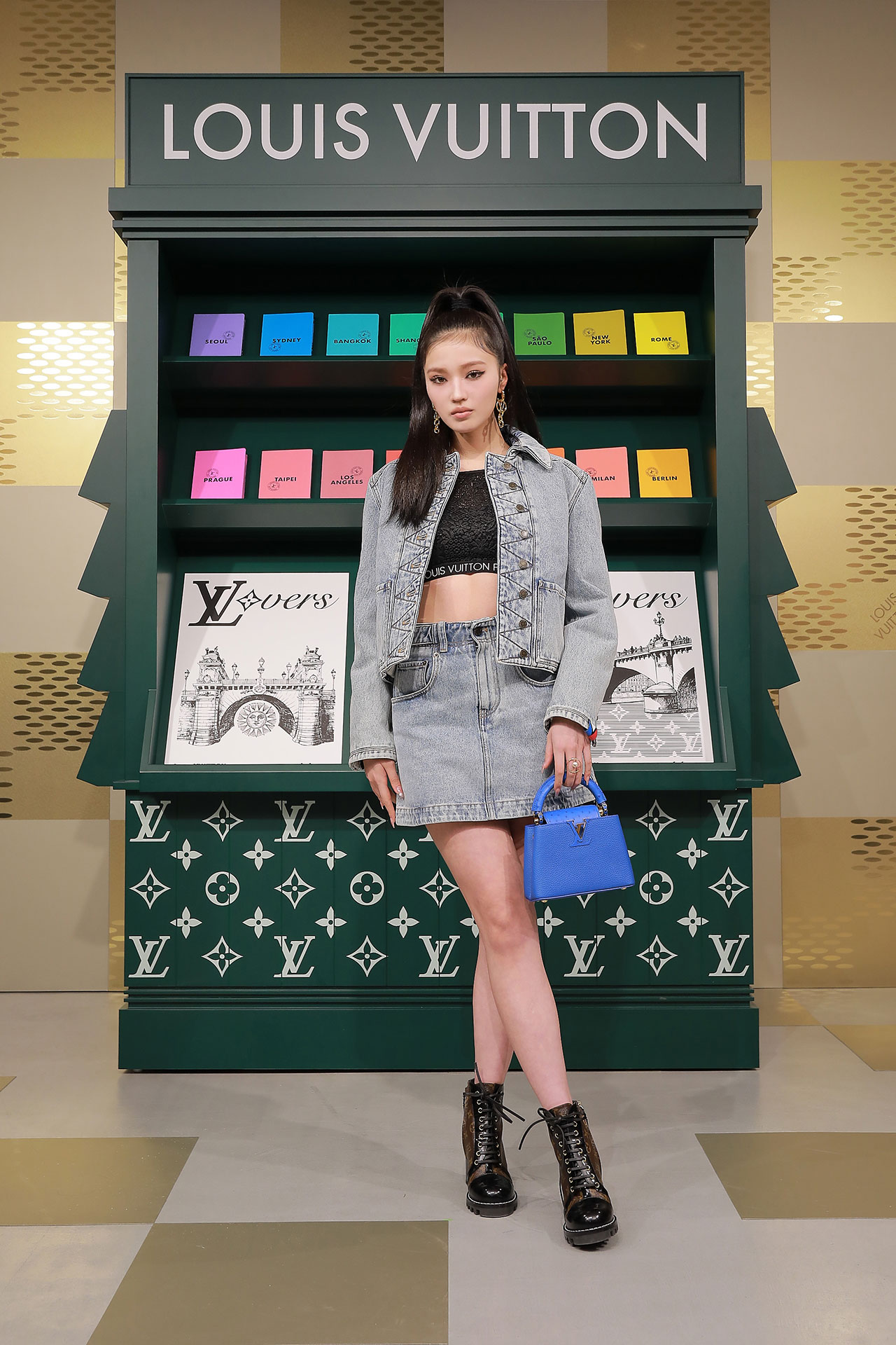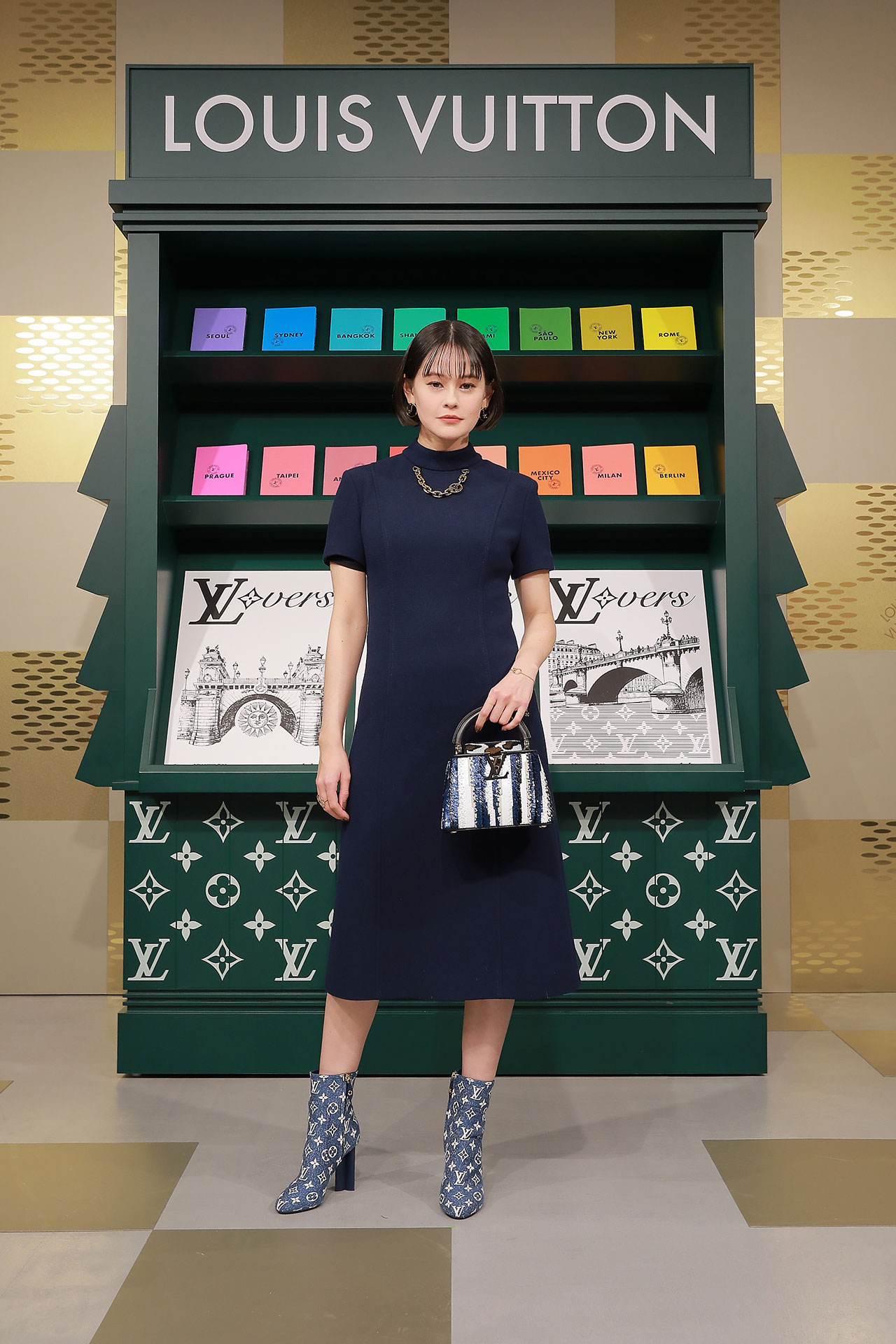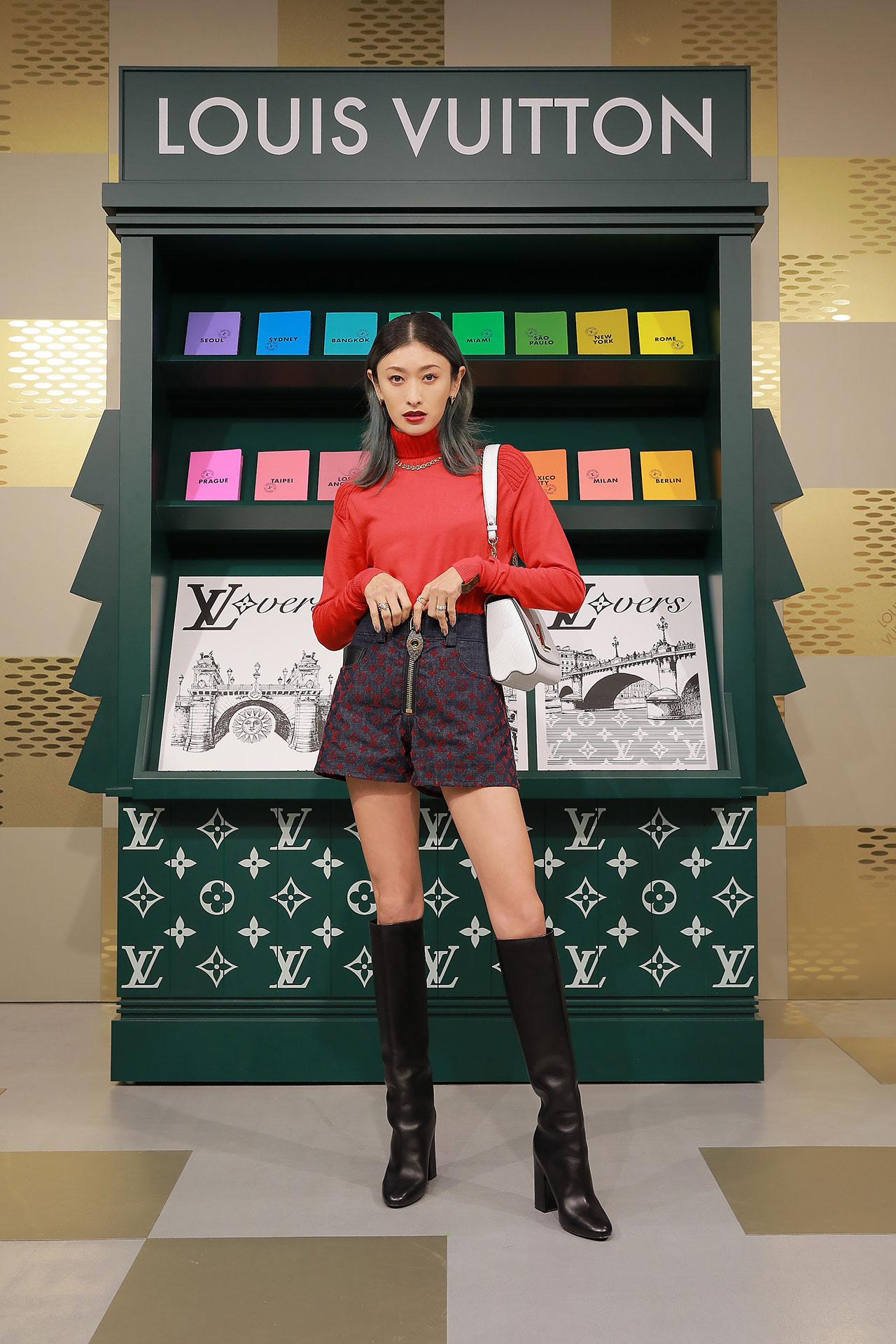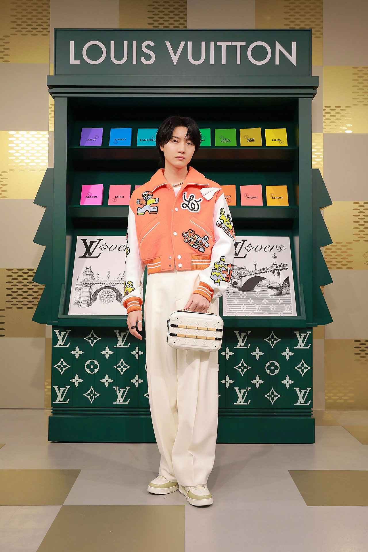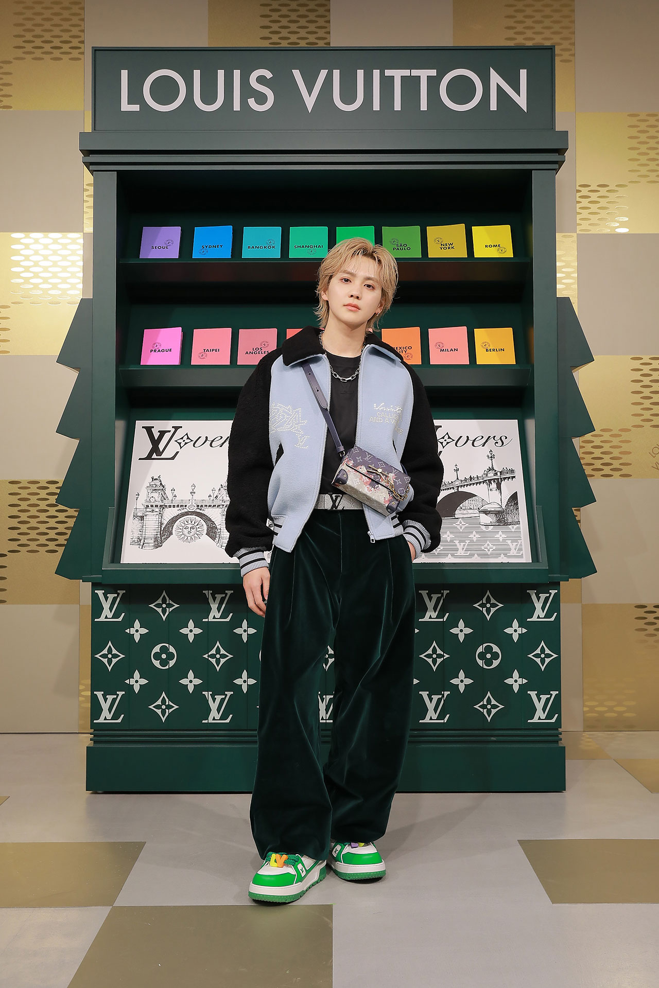 ダミエ・パターンに彩られたファサードに出迎えられ、店内に入るとゴールドカラーを基調とした空間が広がる。天井からはキューブ型のインスタレーションが吊るされ、デジタルアニメーションや Louis Vuitton 仕様のゴルフカートやブックストアを連想させるディスプレイが並ぶ。ペパーミントグリーンに染まった2階は、壁一面にモニターやスピーカーが設置され、デジタル化したダモフラージュ・モチーフやアイコニックなダミエ、モノグラムを取り入れた本コレクションの雰囲気が忠実に体現された。