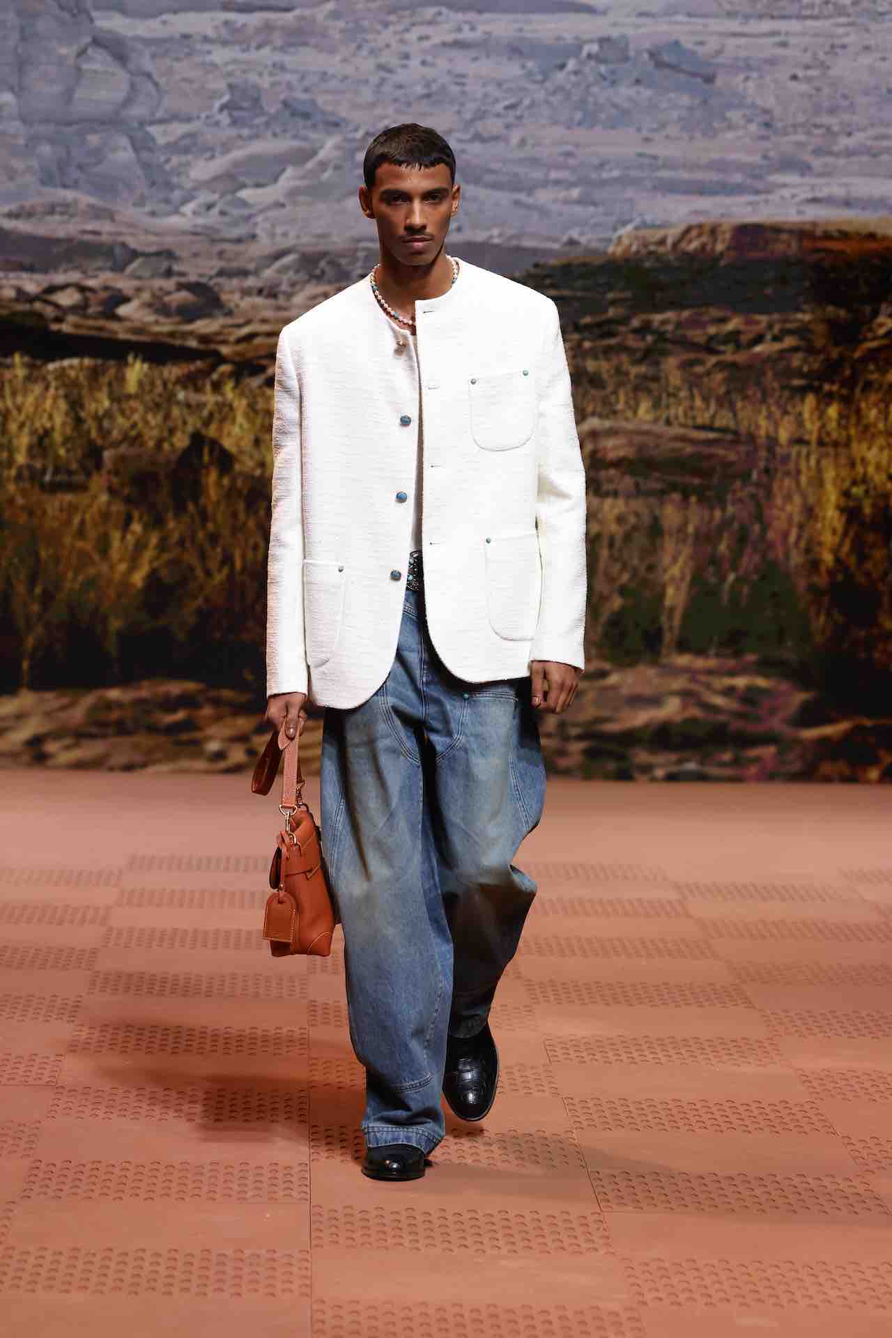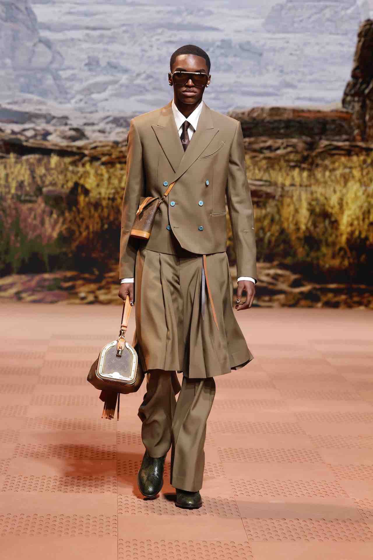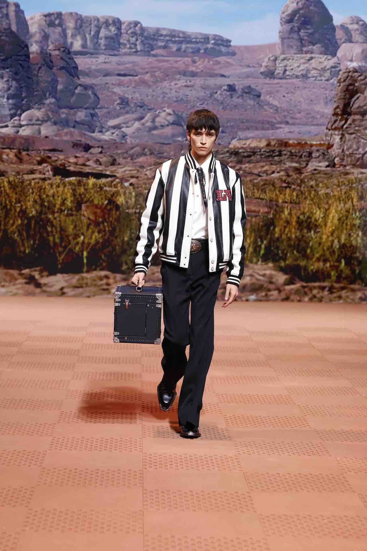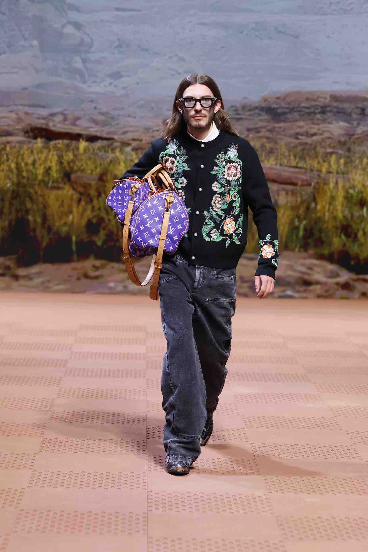 荘厳な太鼓のリズムとともに登場したファーストルックでは、フリンジが揺れる上質なウールコートにブーツカットのデニム、ウエスタンブーツ「LV Rider」を合わせ、ターコイズが輝いた。デビューコレクションで印象的だった「スピーディ」も、ターコイズカラーに染まり、さらにフレッシュな印象。