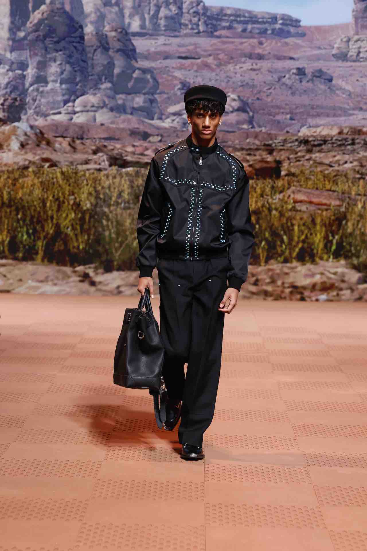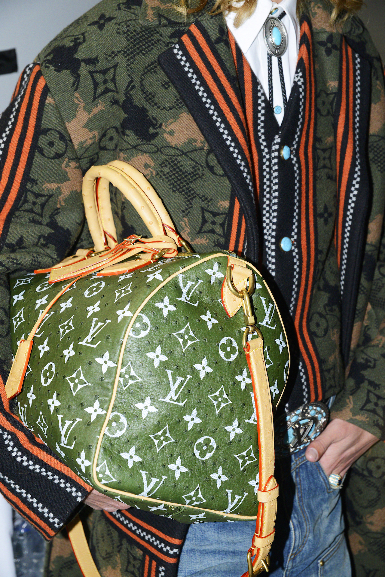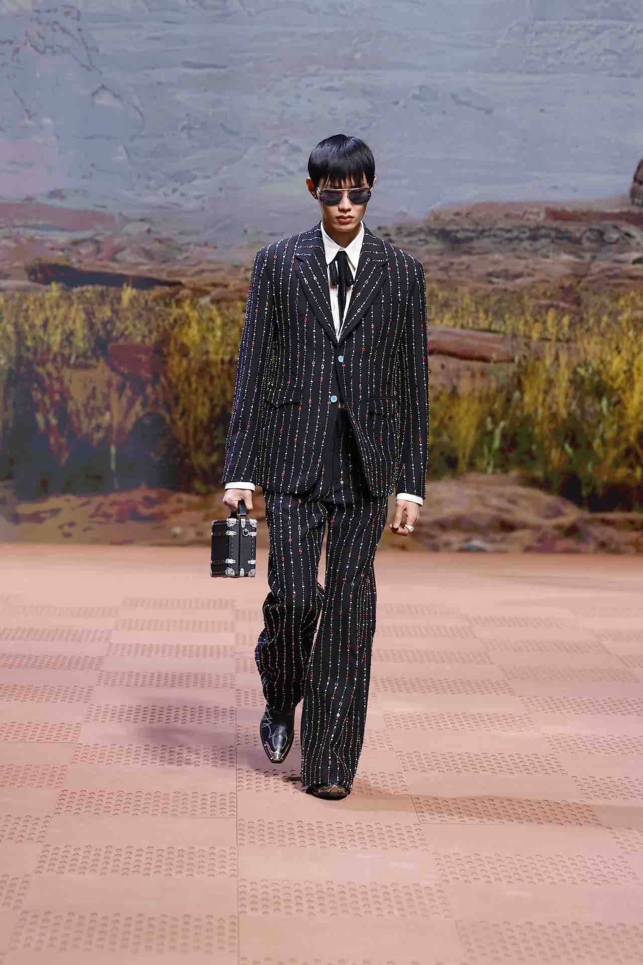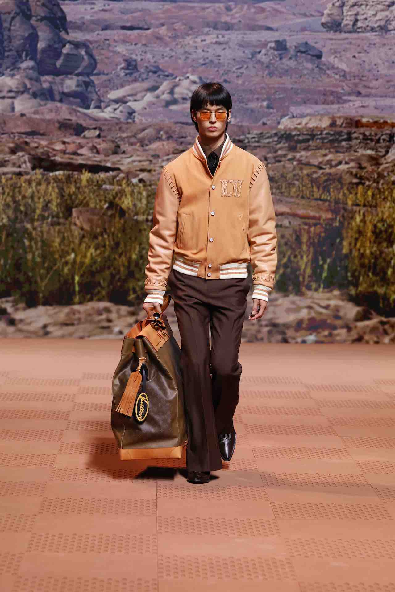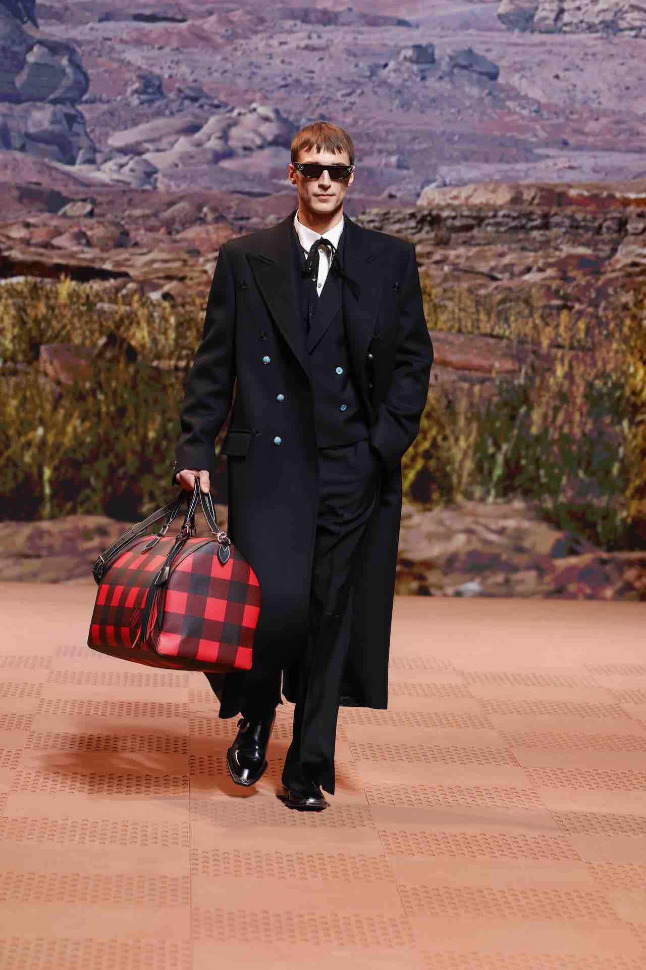 荘厳な太鼓のリズムとともに登場したファーストルックでは、フリンジが揺れる上質なウールコートにブーツカットのデニム、ウエスタンブーツ「LV Rider」を合わせ、ターコイズが輝いた。デビューコレクションで印象的だった「スピーディ」も、ターコイズカラーに染まり、さらにフレッシュな印象。