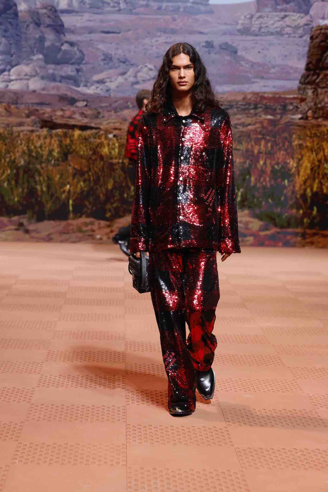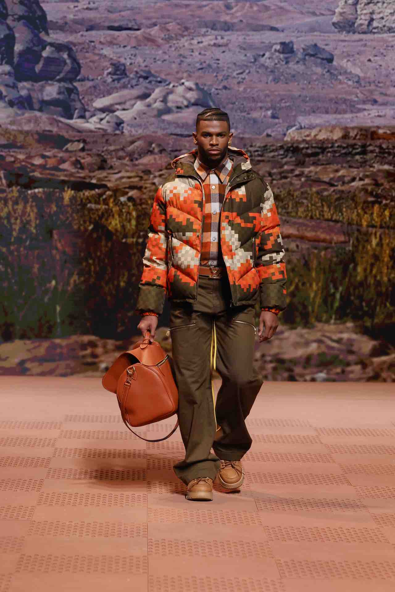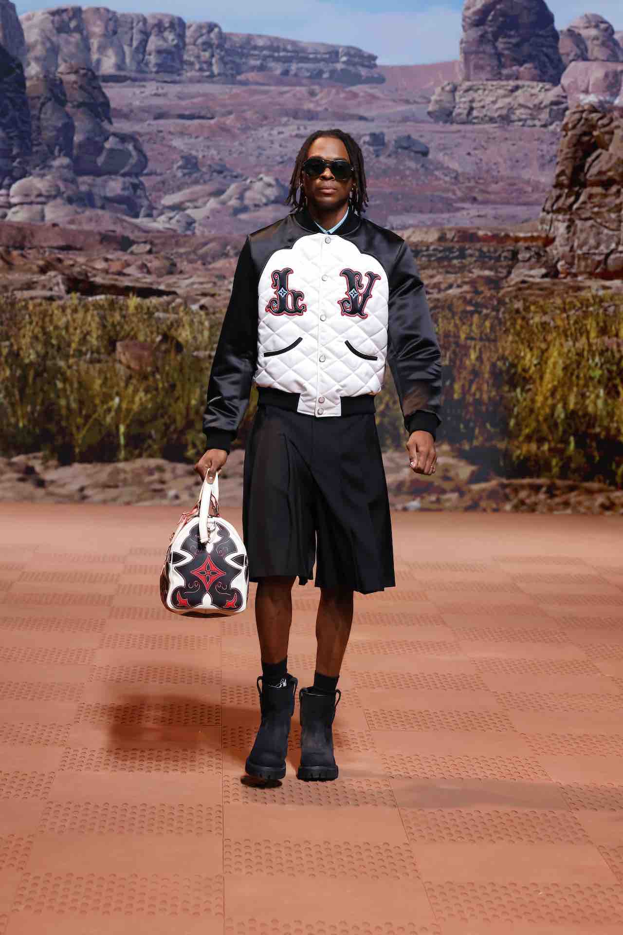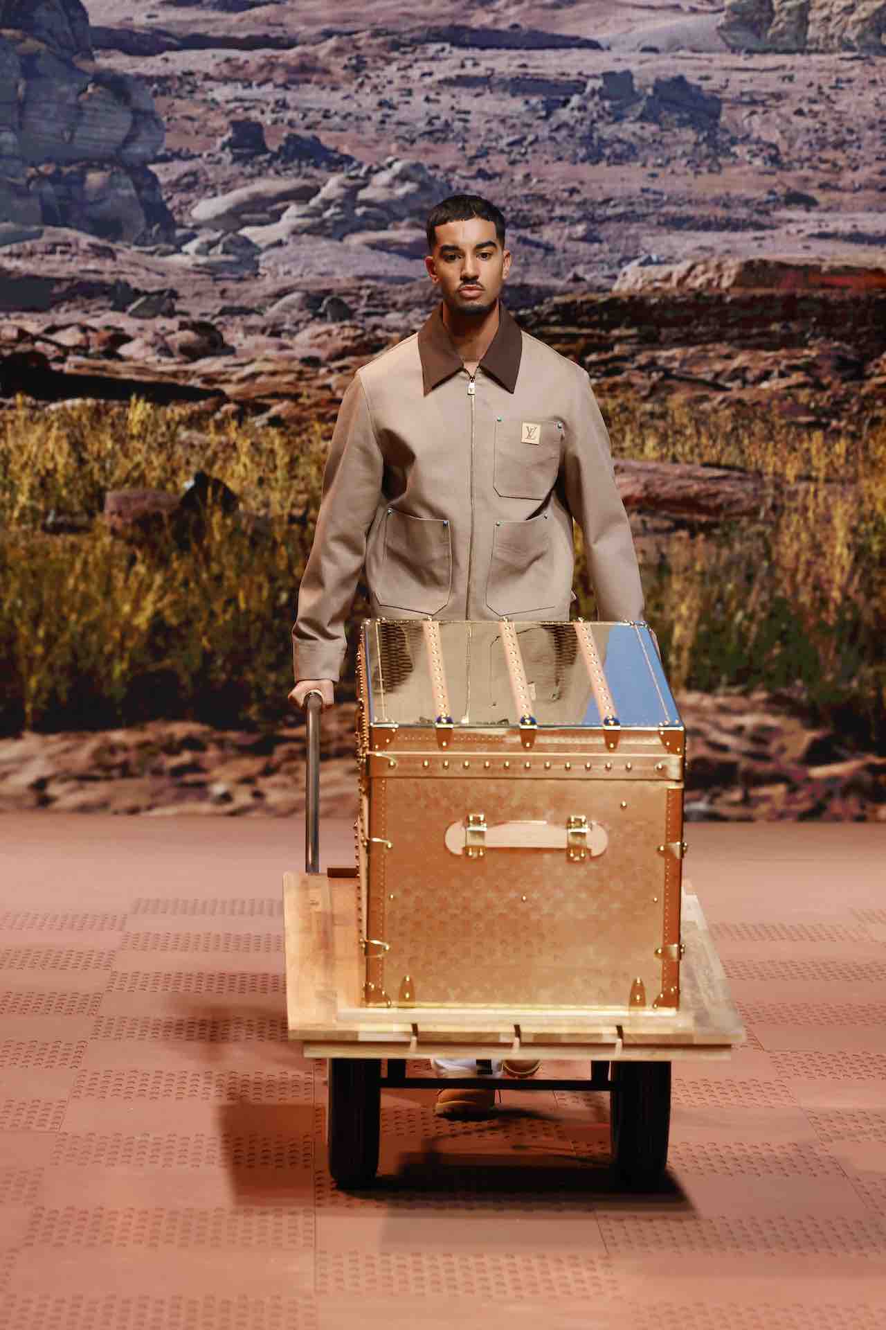 荘厳な太鼓のリズムとともに登場したファーストルックでは、フリンジが揺れる上質なウールコートにブーツカットのデニム、ウエスタンブーツ「LV Rider」を合わせ、ターコイズが輝いた。デビューコレクションで印象的だった「スピーディ」も、ターコイズカラーに染まり、さらにフレッシュな印象。