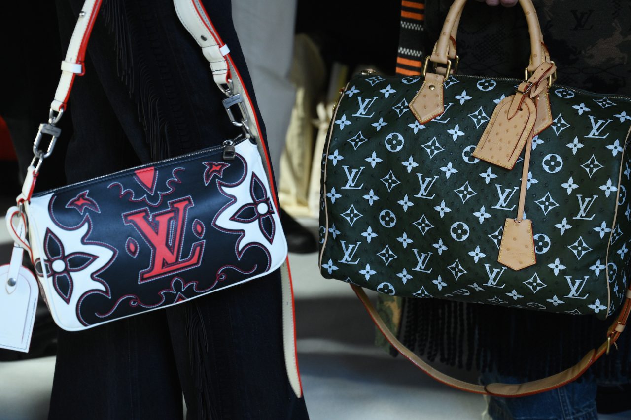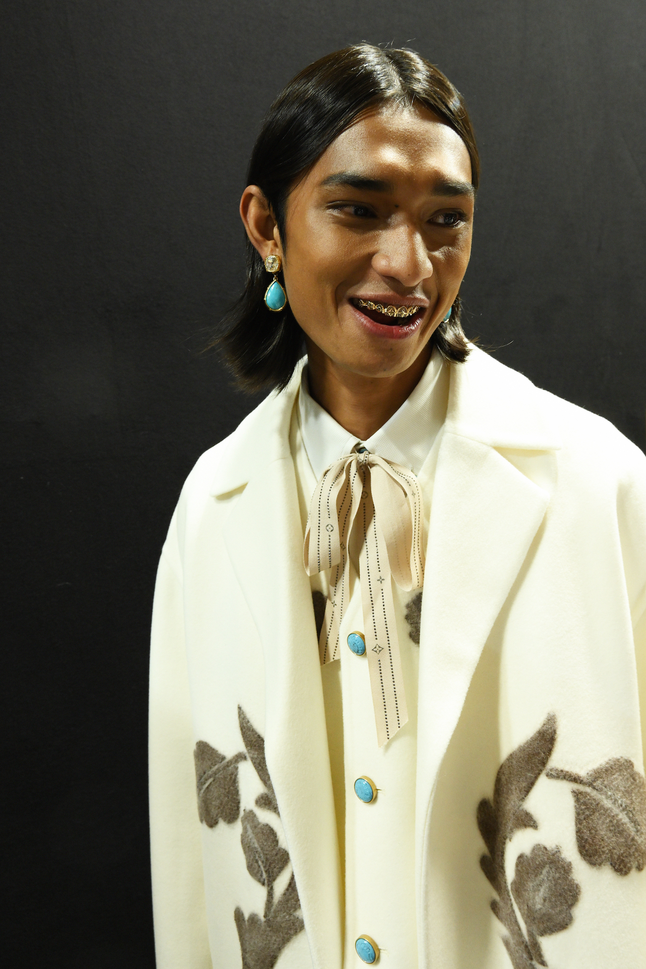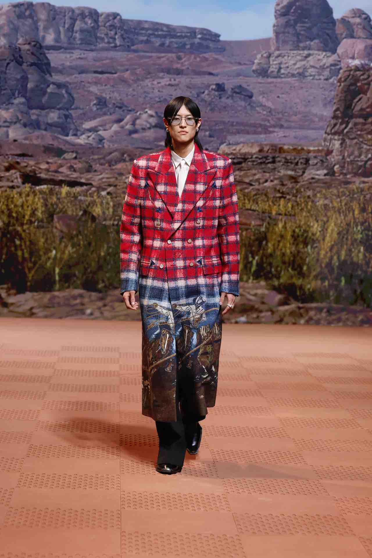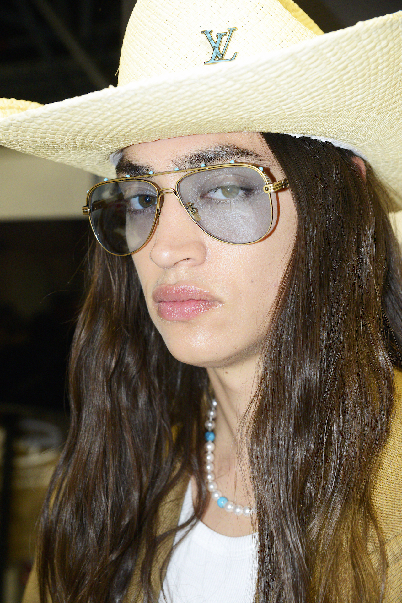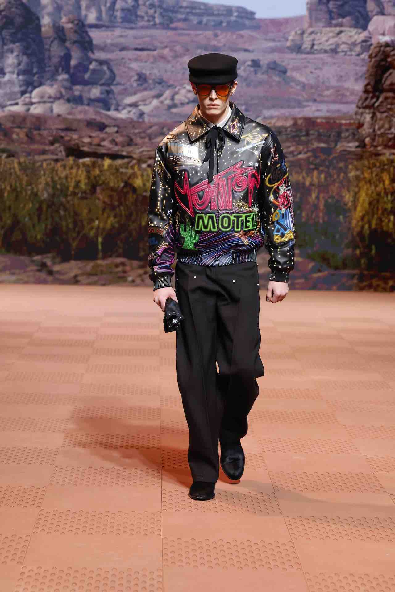 荘厳な太鼓のリズムとともに登場したファーストルックでは、フリンジが揺れる上質なウールコートにブーツカットのデニム、ウエスタンブーツ「LV Rider」を合わせ、ターコイズが輝いた。デビューコレクションで印象的だった「スピーディ」も、ターコイズカラーに染まり、さらにフレッシュな印象。