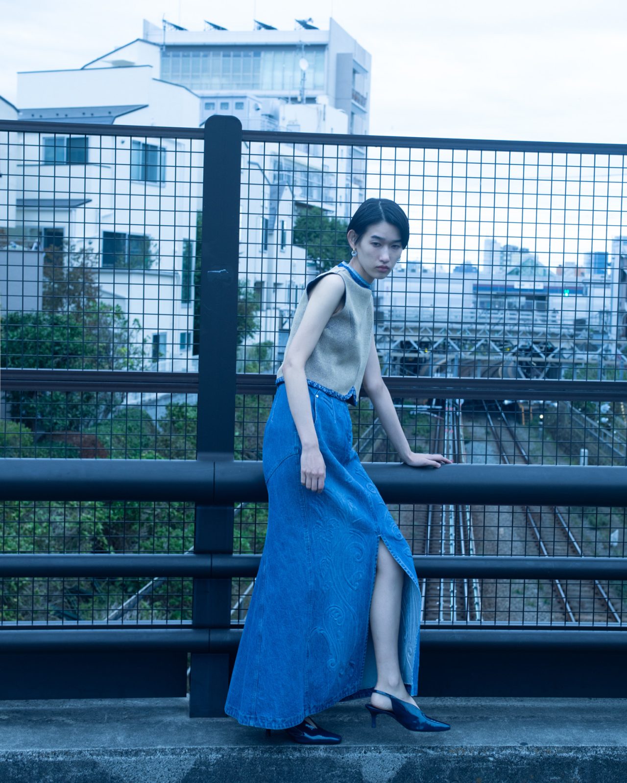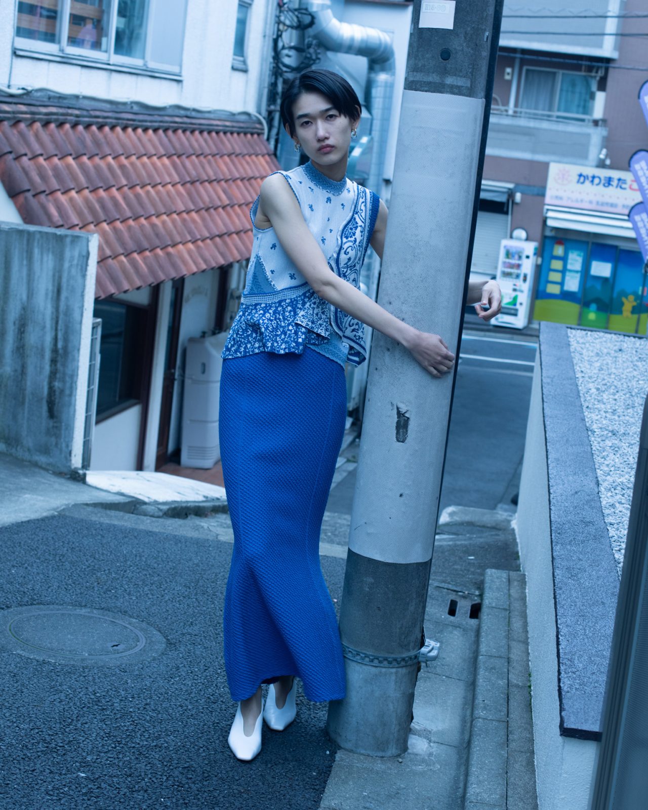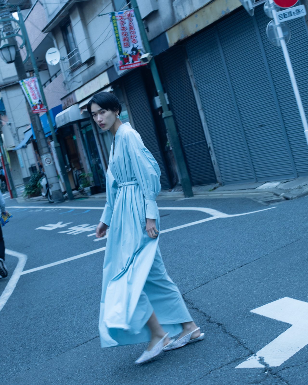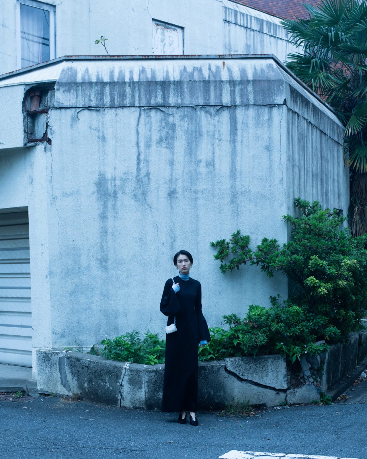 撮影を手がけたのは、国内外で精力的に活動を続けるフォトグラファーの細倉真弓で、ブランドの2023年ホリデーコレクションのキービジュアルも担当。彼女の作品を象徴するブルーを纏い、非日常性・非現実性を帯びた浮遊感のあるビジュアルを制作した。撮影場所には、ブランドとゆかりのある地をピックアップ。有田町と羽根木という異なる場所・時間の「日常」を混和させ、⿊河内真⾐子の記憶をトリップするような世界観をイメージしている。
