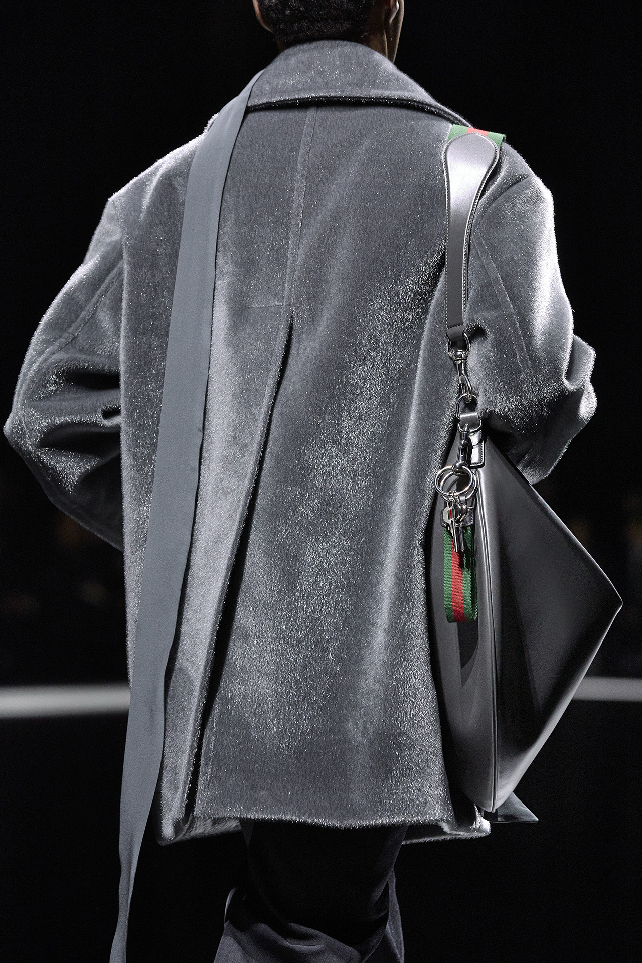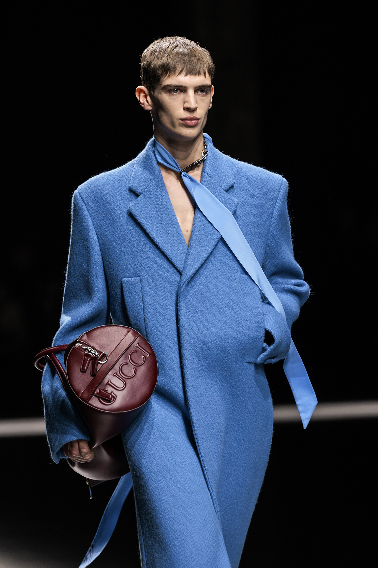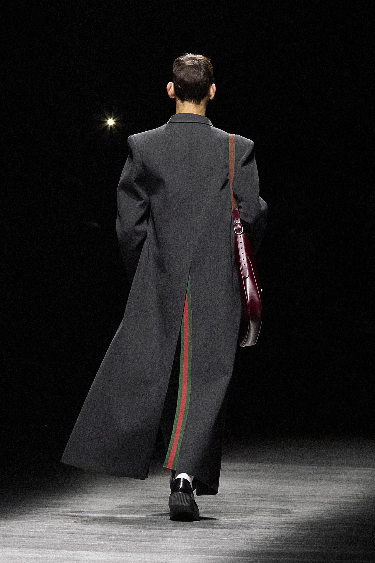 新たに発表された2024年秋冬メンズコレクションでは、ウィメンズコレクションと同様 Sabato De Sarno がこれまでの GUCCI を再解釈。フォーマルウェアは、クラシカルなダブルブレストをベースとしつつ、マキシ丈に深い切り込みを入れた躍動感あふれるコートや、リラックスフィットのジャケットなど、大胆なテーラリングが特徴的だ。また、存在感のあるトップスにすっきりとしたトラウザーを合わせるなど、コントラストの効いたシルエットがクリーンな雰囲気を見せる。