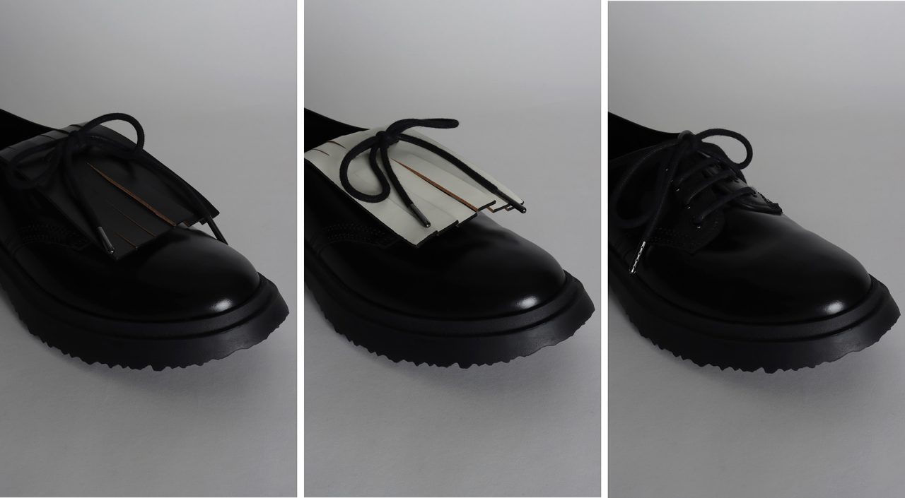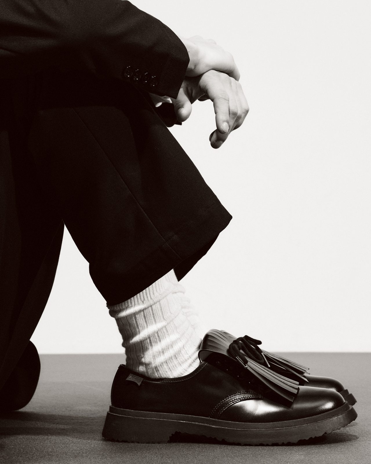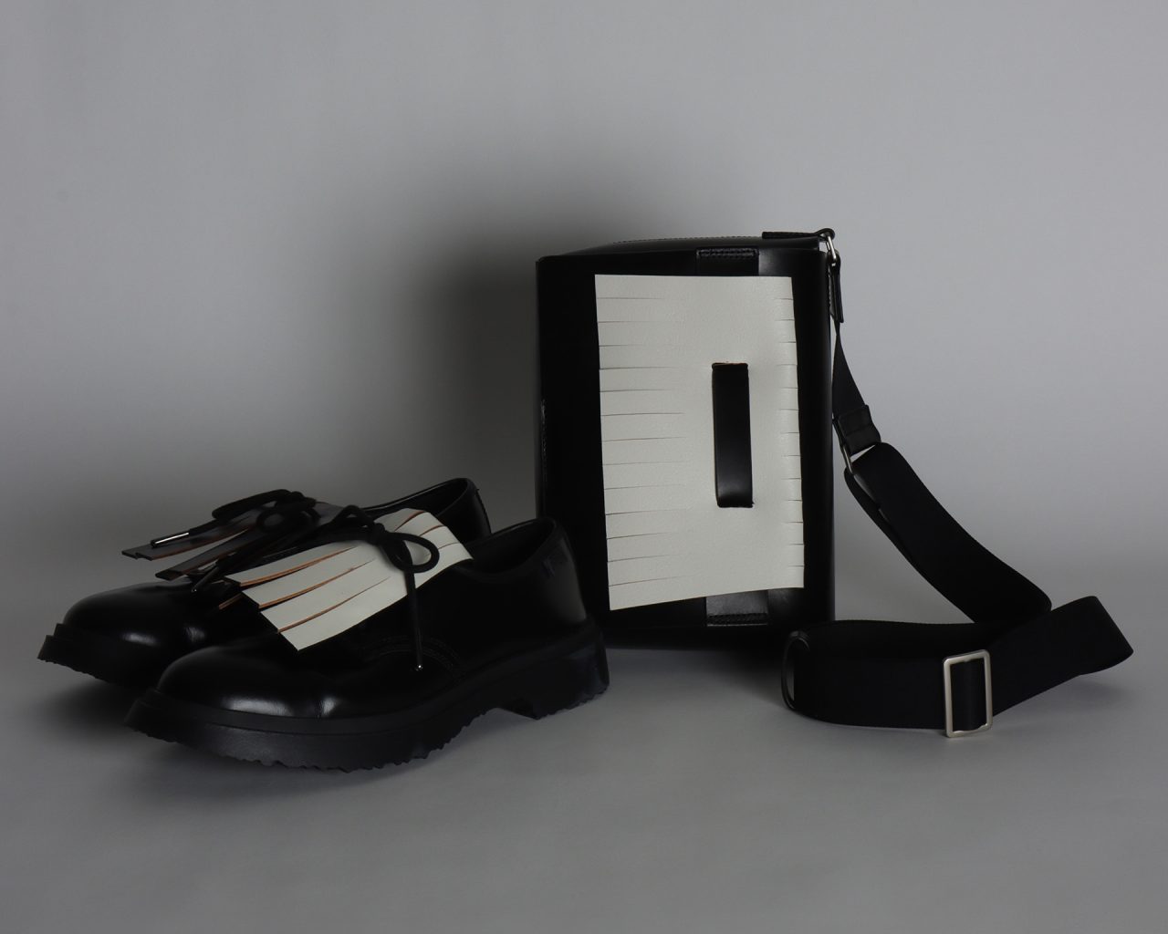 初となる今回のコラボレーションでは、洗練されたモノトーンの上質なレザーを用いて、タイムレスに使えるミニマムなデザインに仕上げたダービーシューズとショルダーバッグを展開。シューズのベースとなったのは、CAMPER の人気ライン「WALDEN (ウォールデン)」。ホワイトとブラックのリバーシブル仕様であるキルトは取り外しが可能で、様々なシーンに合わせて使える3WAY仕様になっているのもポイントの一つ。さらに、クロムフリーレザーとリサイクル PET 素材のライニング、取り外し可能なリサイクル Ortholite® (オーソライト) インソールを採用している。