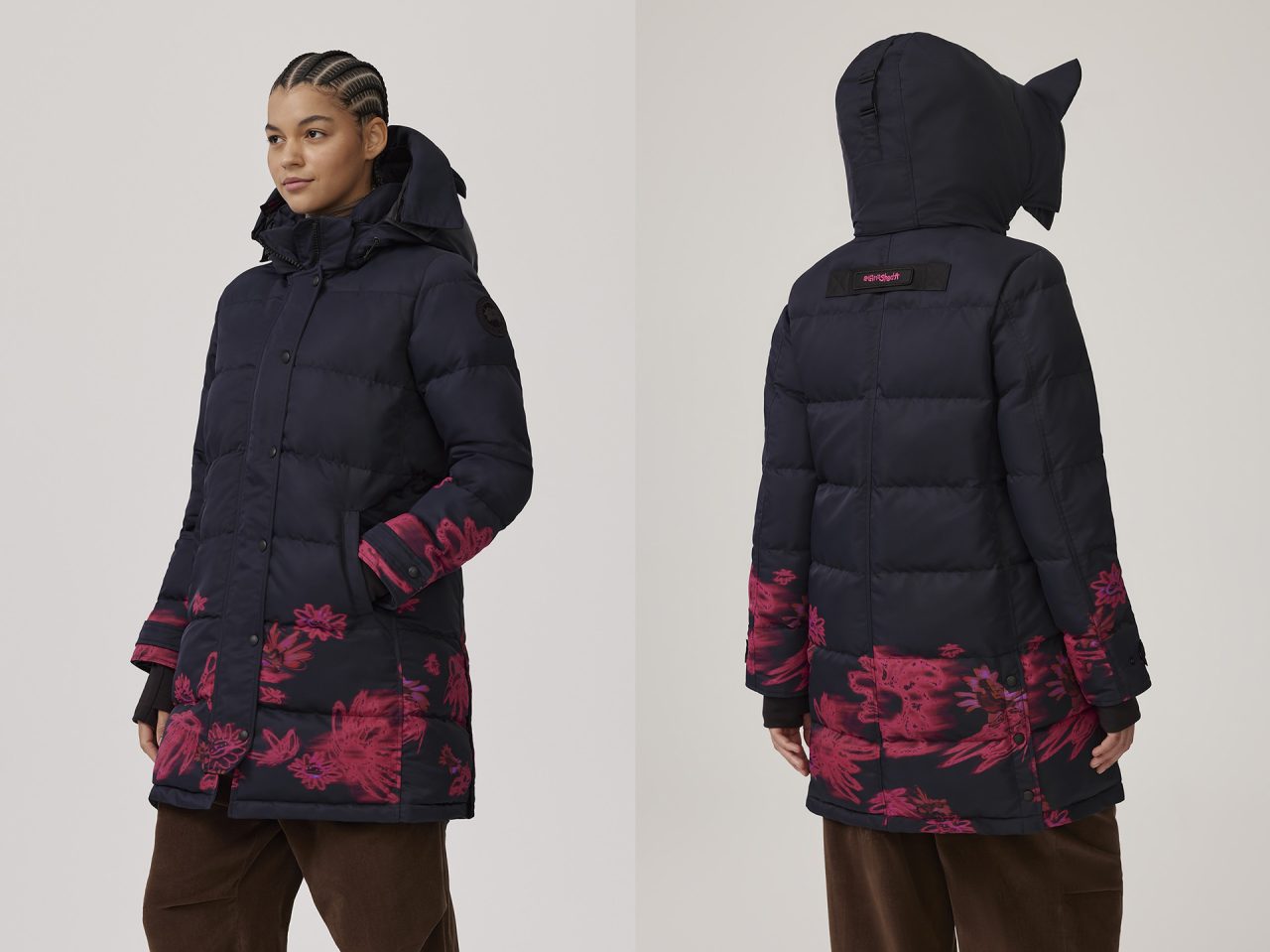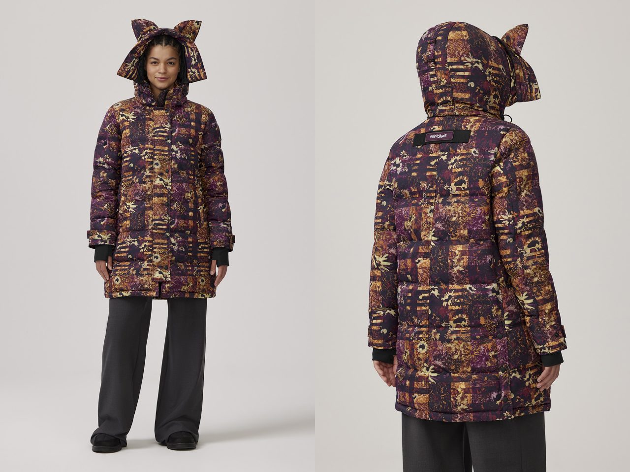 ニューヨーク出身のブランド COLLINA STRADAは、CANADA GOOSE のベストセラーアイテム「シェルバーン パーカ」をリデザイン。ブランドのテーマである環境に配慮した素材にオリジナル手描きプリントが施され、デザイナーのスピリットが反映されている。また、フード部分には猫の耳をモチーフとした「キャットイヤー フードトリム」が付けられ、フードを被ると動物のようなユニークなシルエットに。