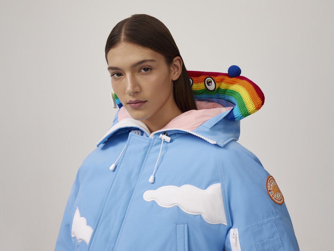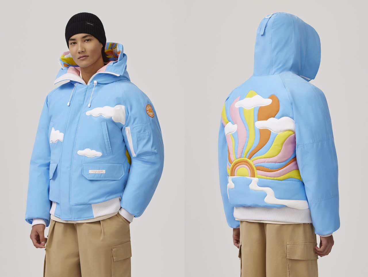 MIRA MIKATI は、CANADA GOOSE で長く愛され続ける「チリワック ボンバー」を再構築。耐久性や保温性に優れたクラシックなパーカに鮮やかなイエロー、スカイブルーをあしらい、ポップな太陽と雲のモチーフが印象的。デザイナーは「このコラボレーションは、ハッピーで、ポジティブで、カラフルで、あらゆるアドベンチャーに幸せをもたらし、人々をより笑顔に、より明るく生きられるようにデザインしています。」と語っている。