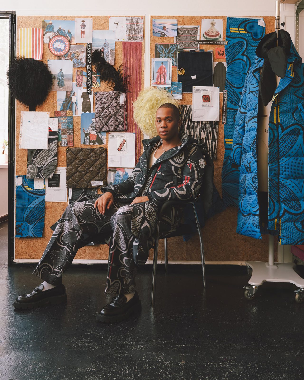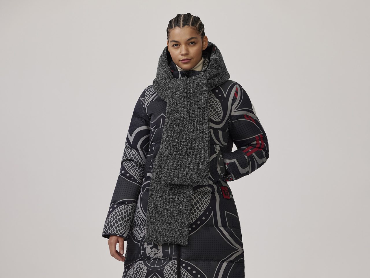 THEBE MAGUGU が手掛けたのは、ブランドのルーツであるアフリカ・レソト王国への敬意を表してデザインされた「エアルーム ミスティークパーカ」。バソト族が纏う、神秘的なモチーフが特徴のウールブランケットから着想を得た総柄は、ダウンの入ったフードトリムにもあしらわれている。足首まで覆う長い着丈のパーカでも着膨れすることなく、落ち着いたグレートーンがスタイリッシュなスタイルを叶える。