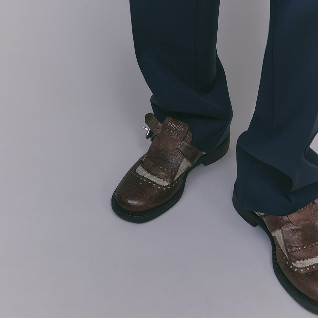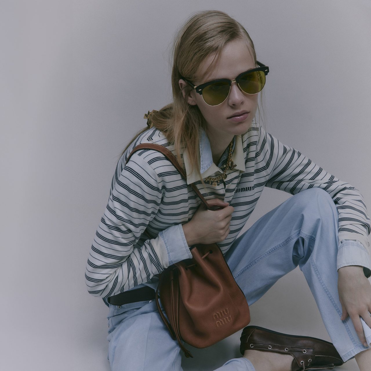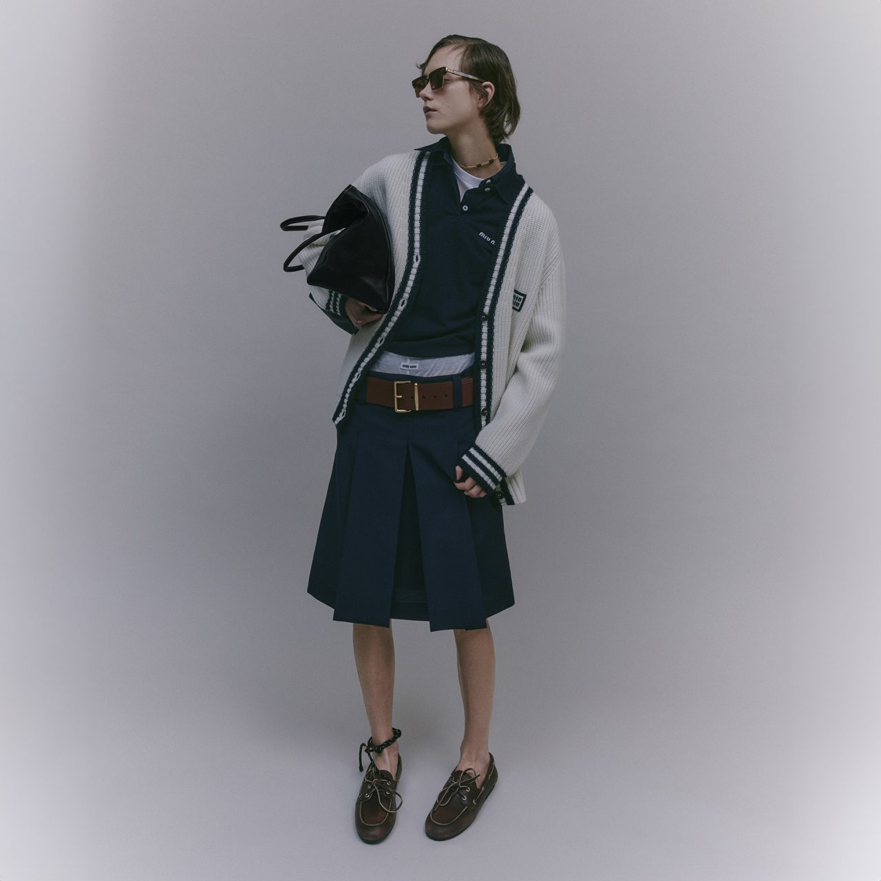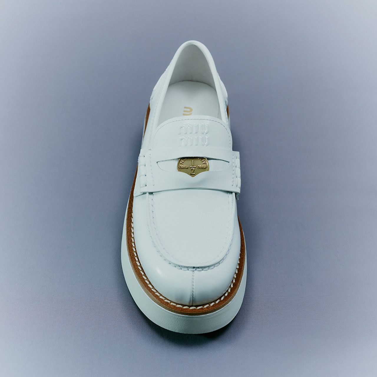 Miu Miu のポップアップストアにて披露されるのは、今年の春夏シーズンに取り入れたいマリンテイストなアイテムの数々。クラシカルなネイビー、ホワイト、ブラウン、ベージュといった海辺を連想させるカラーパレットに、ボーダーやエンブレムのモチーフを取り入れたブランドらしいヴィンテージライクなワードローブが展開される。膝丈のボックスプリーツスカートやセーラートップス、Miu Miu のロゴパッチが付いたテニスドレスなど、エレガントなシルエットが涼やかな印象を与える。さらに、2024年春夏ファッションショーで披露された「Church’s X MIU MIU」コラボレーションモデルの第二弾も店舗にて発売。エイジング加工を施したポリッシュドレザーと、キャンバスのパネルを組み合わせた異素材のミックスが、初夏のリラックスムードをイメージさせる。