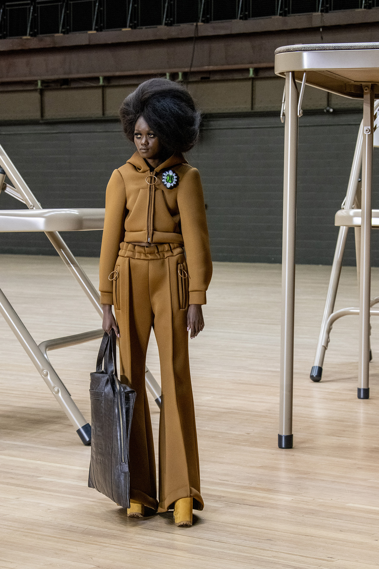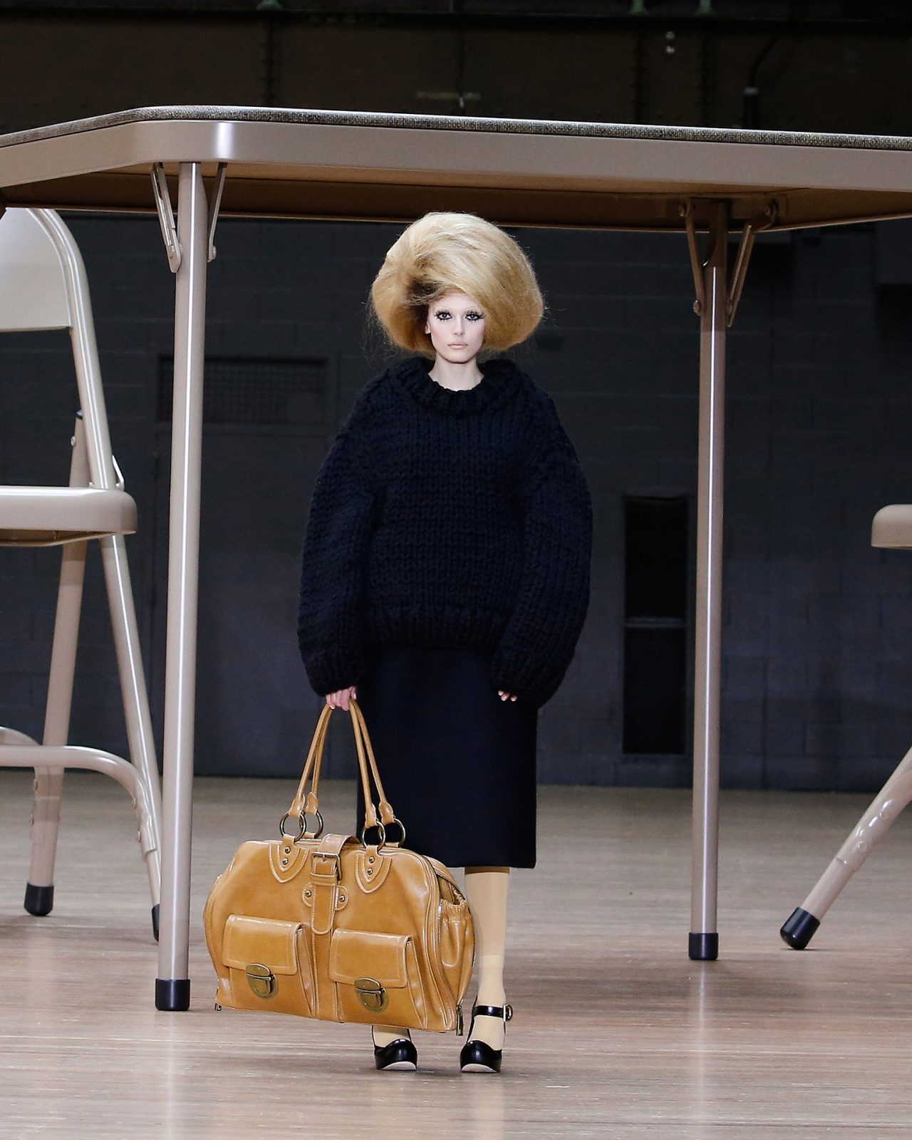 今回のコレクションではオーバーサイズのスカートやコートが象徴的で、直線的なカッティングやパターンが多くみられた。ほとんどのルックに体のラインや動きへの影響を受けないハリ感のある素材を使用し、纏っている服とモデルの間にユニークな違和感を生み出している。40年間ブランドを牽引してきたデザイナー Marc Jacobs は今回のコレクションで、日常への愛着や記憶に残るナイーブでエレガントなものを表現したかったという。大きなボストンバッグや艶やかなヒールが加わり、ブランドらしいポップさが演出された。