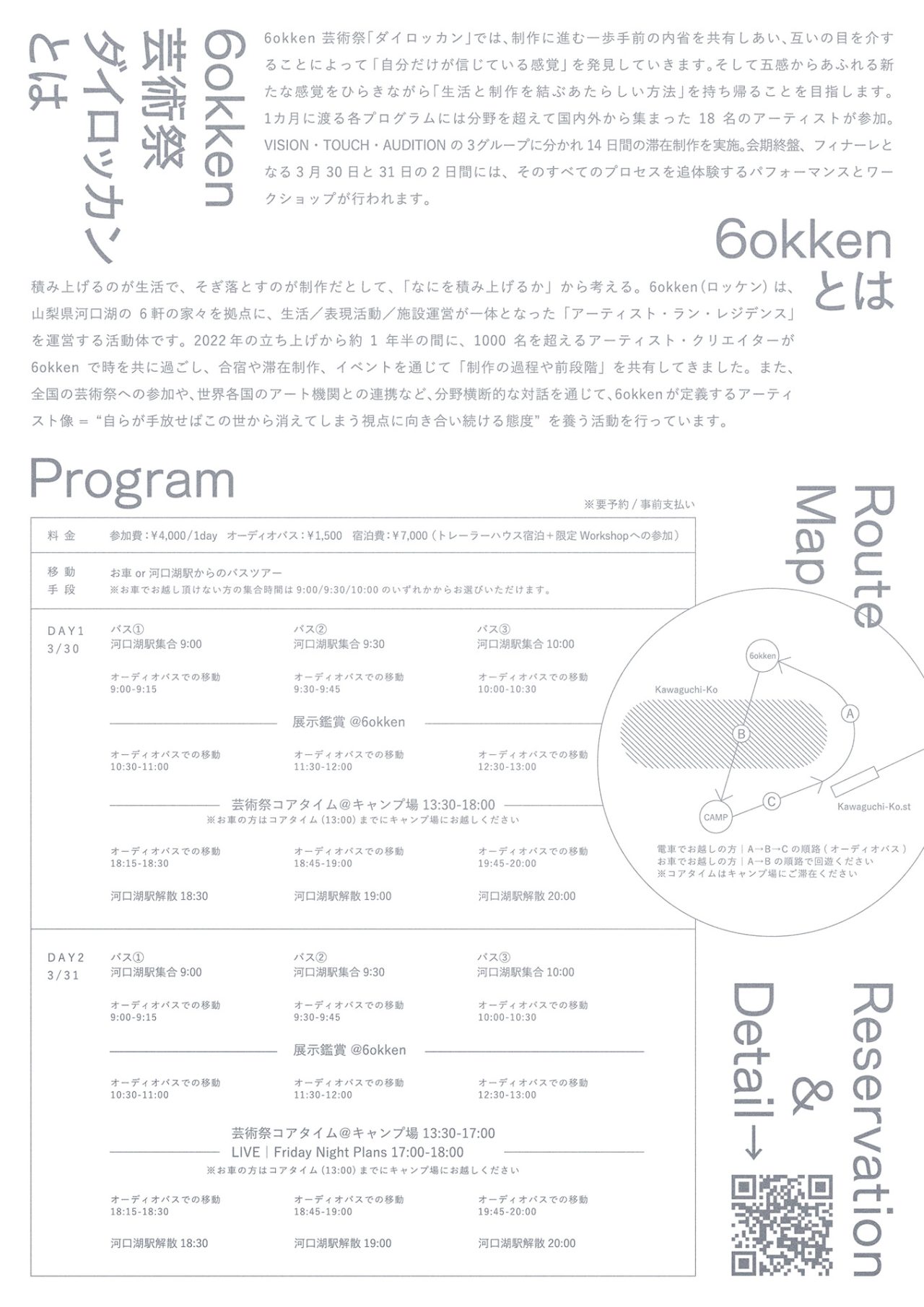 山梨県河口湖のアーティスト活動体 6okken (ロッケン) が、作品制作の前段階にフォーカスした芸術祭「ダイロッカン」を開催。国内外のアーティストが1ヶ月にわたってシンポジウムや合宿を行い、フィナーレを飾る3月30日、31日は一般の参加者に向けてアーティストの制作プロセスを追体験できるパフォーマンスとワークショップが行われる予定だ。