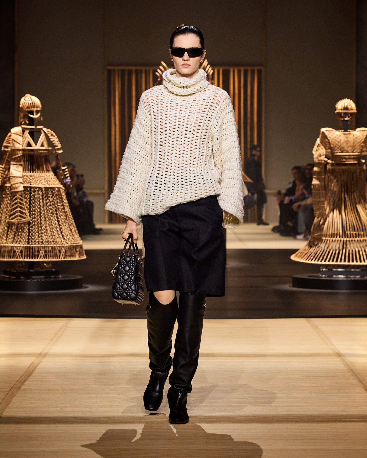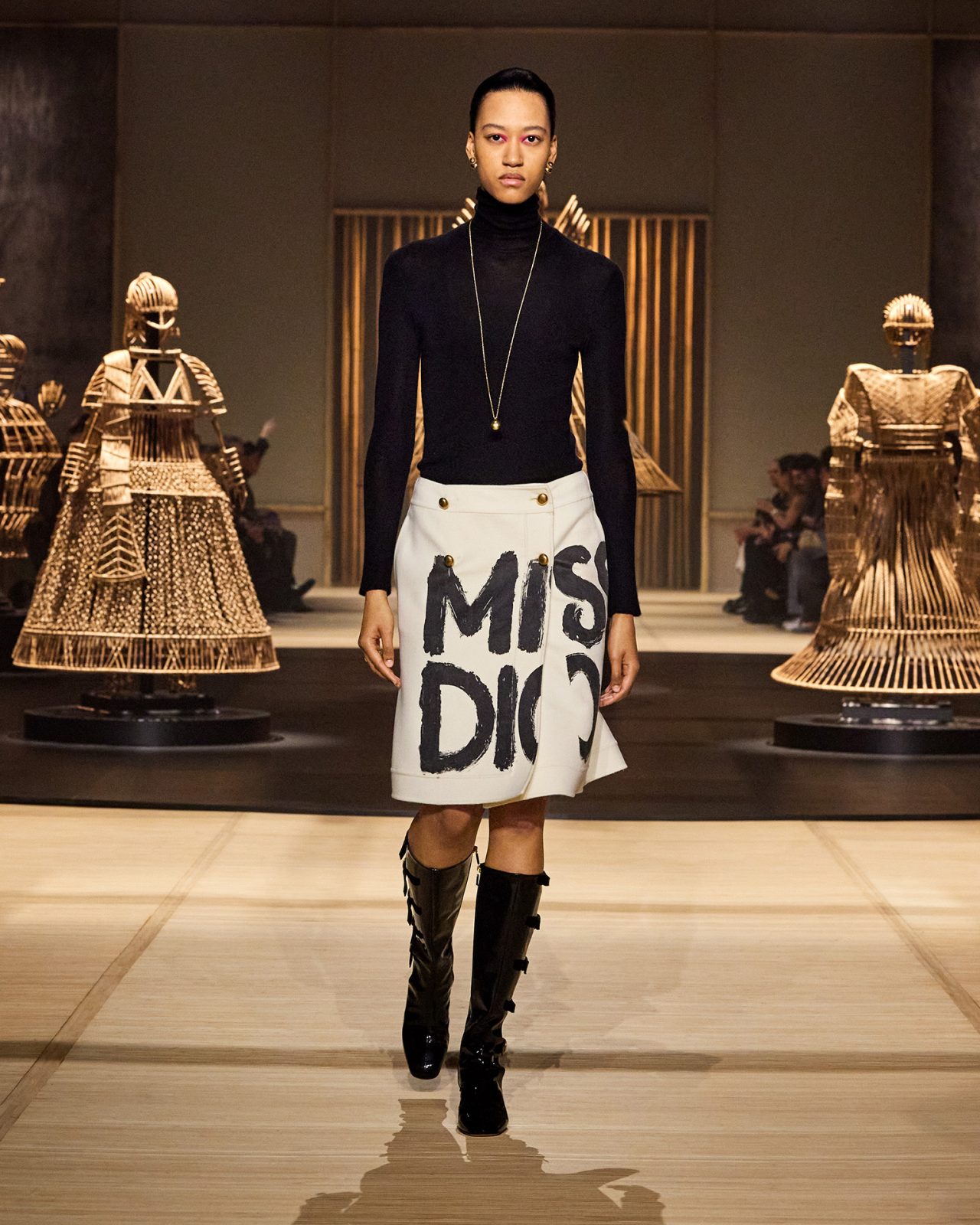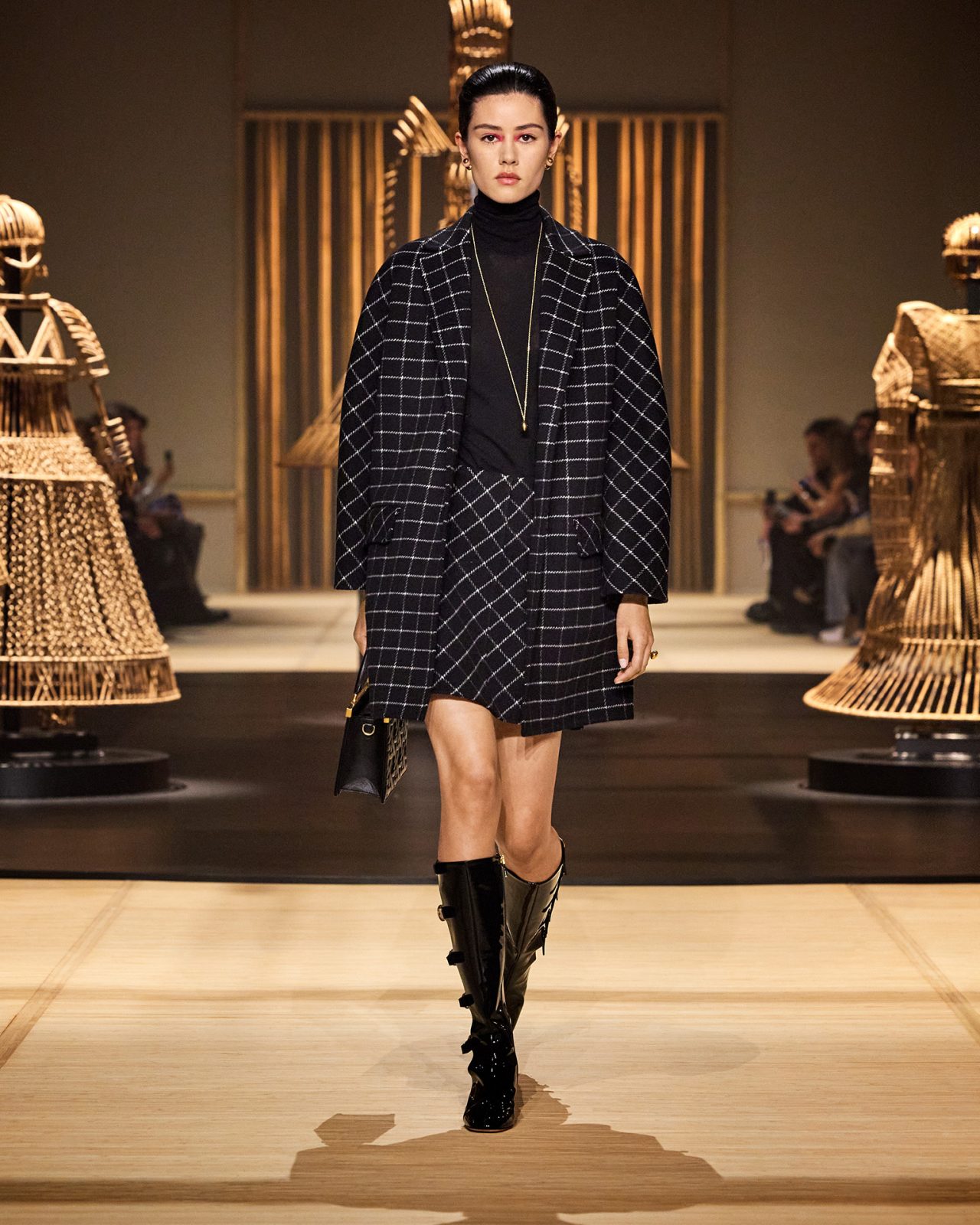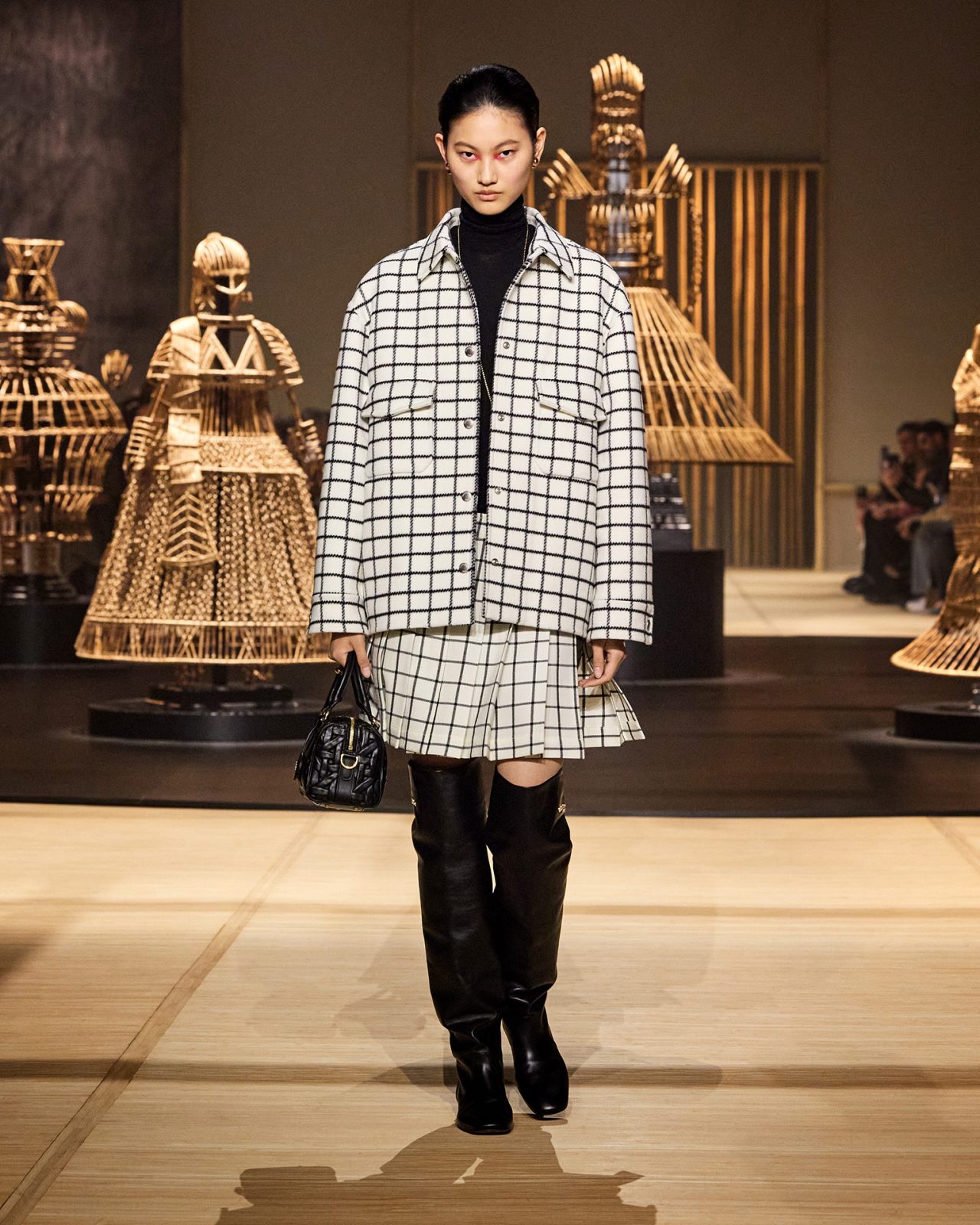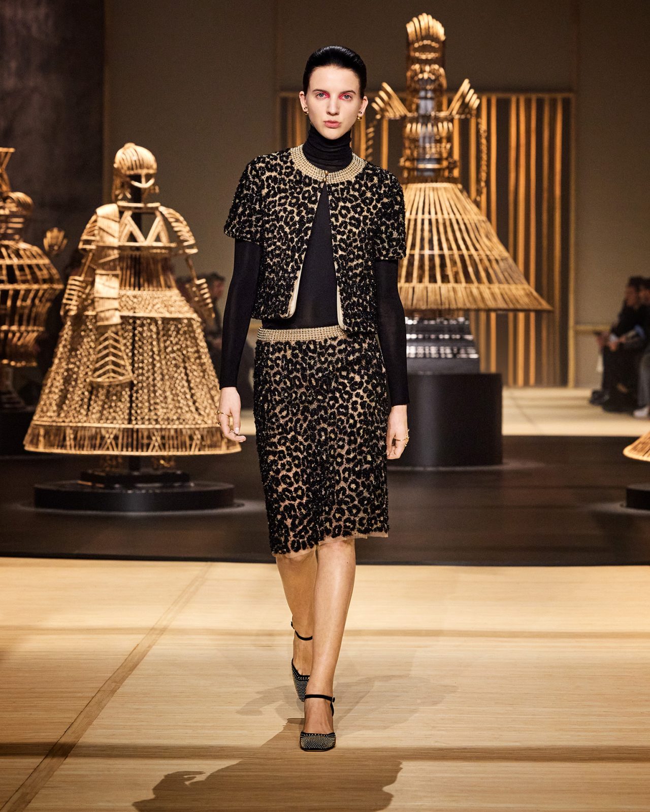 2016年の就任以来、現代を生きる女性たちに力強いメッセージを送り続ける Maria Grazia Chiuri。今回のコレクションでもその信条は変わらない。会場でまず来場者を迎えるのは、インド人アーティスト Shakuntala Kulkarni (シャクンタラ・クルカルニ) のインスタレーション作品だ。自身がデザインした籐製の甲冑を身に着けた Kulkarni の写真は、各々の「戦い」に向かう女性たちの決意を象徴するかのようだ。女性がファッションを通して自分自身を表現し始めた60年代に誕生したコレクションから着想を得ただけあって、ブラックのタートルネック、ミニスカート、レオパード柄など当時の流行をたっぷりと取り入れたランウェイとなった。