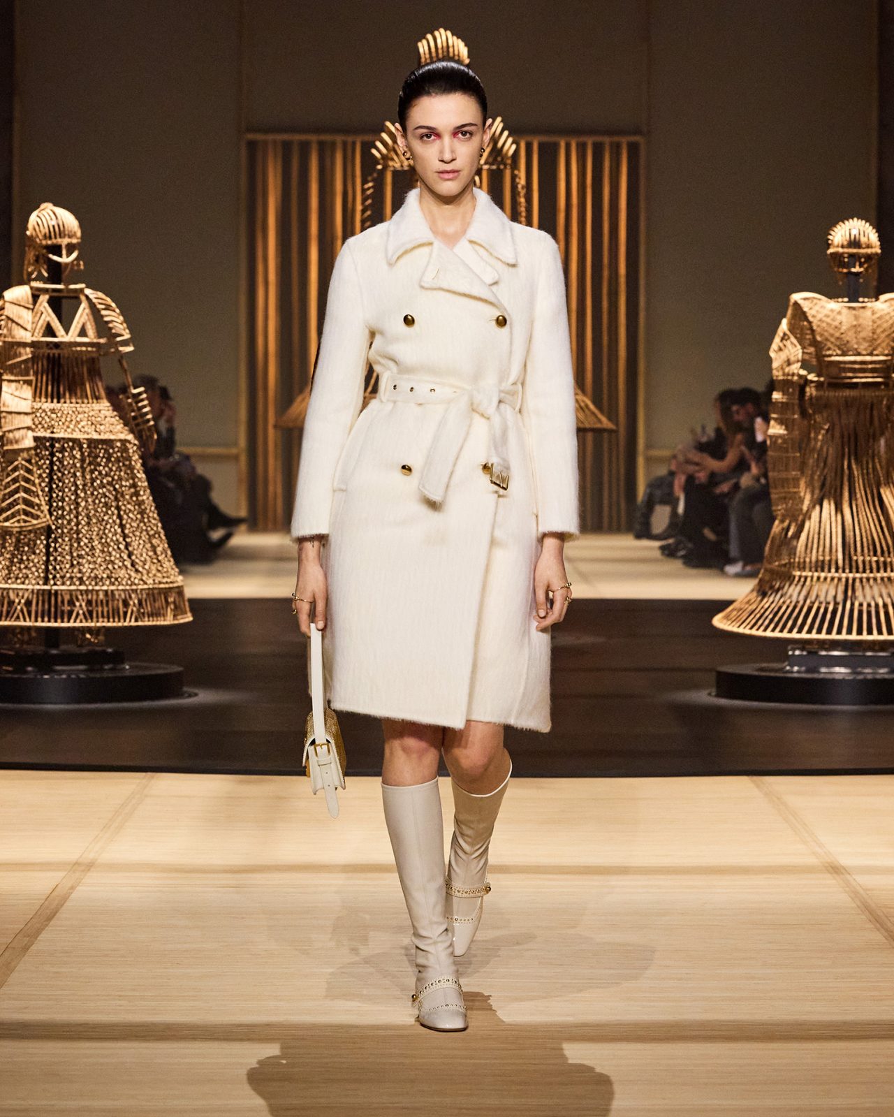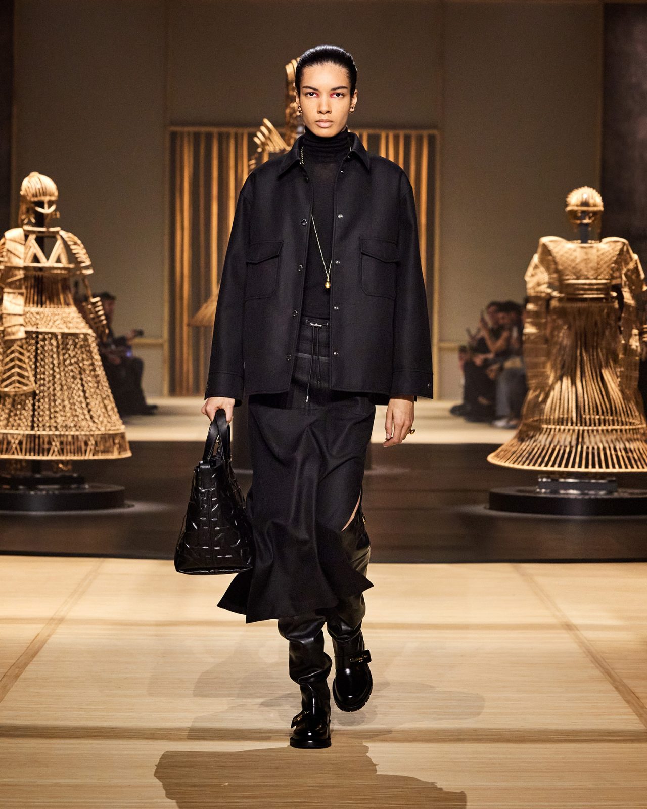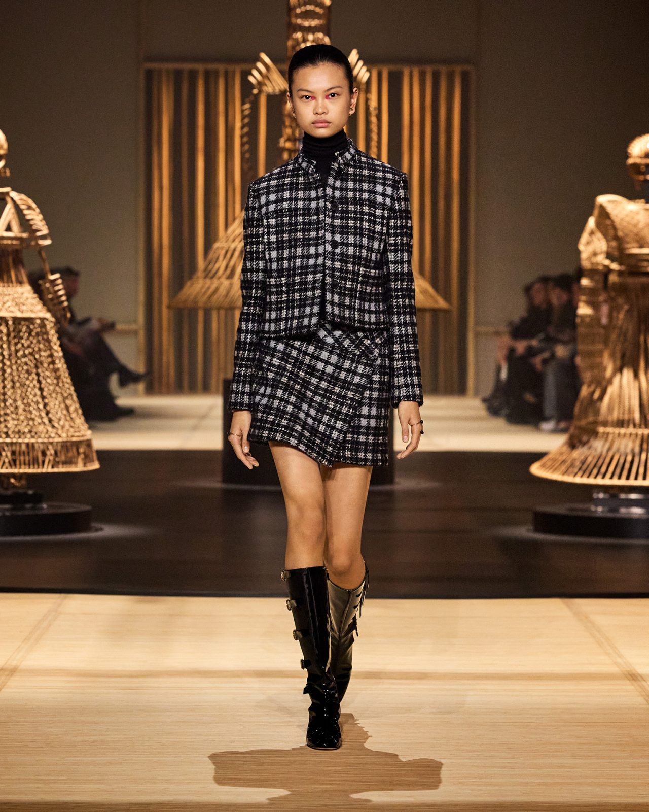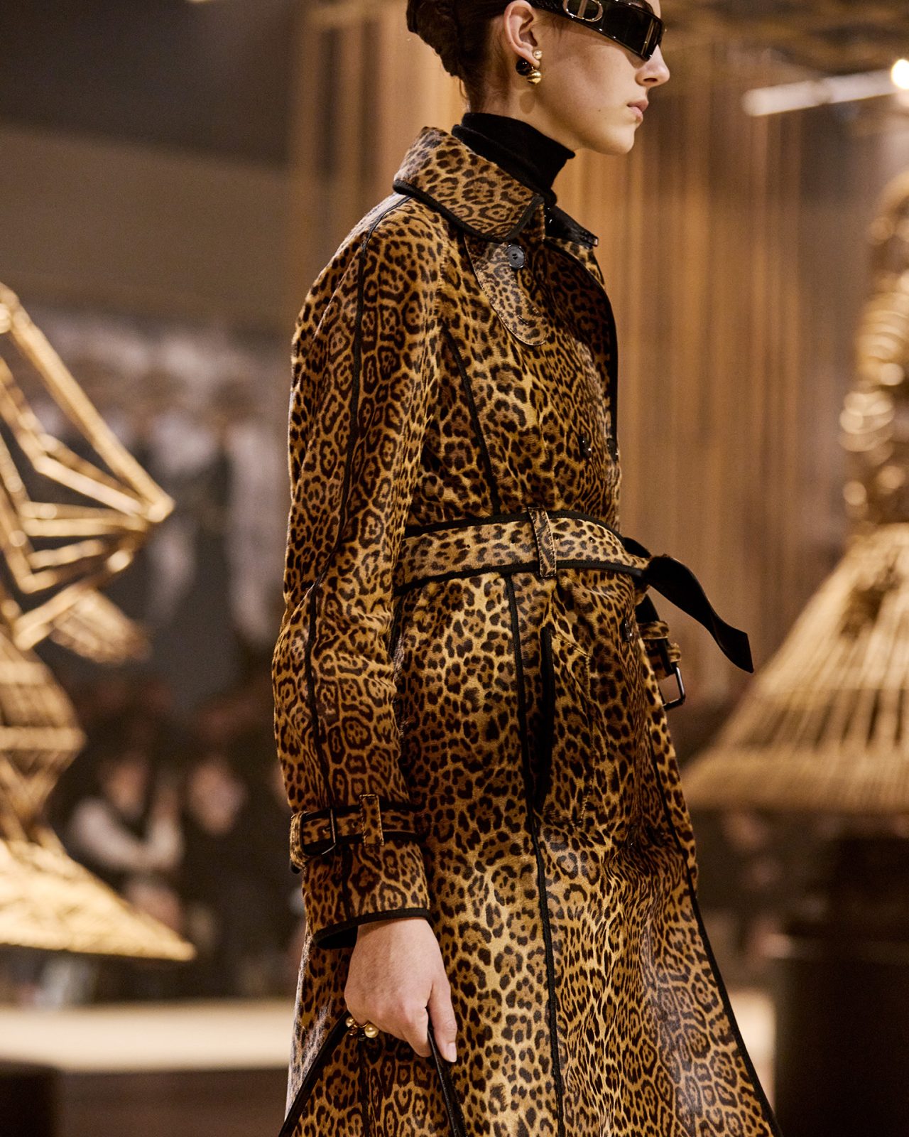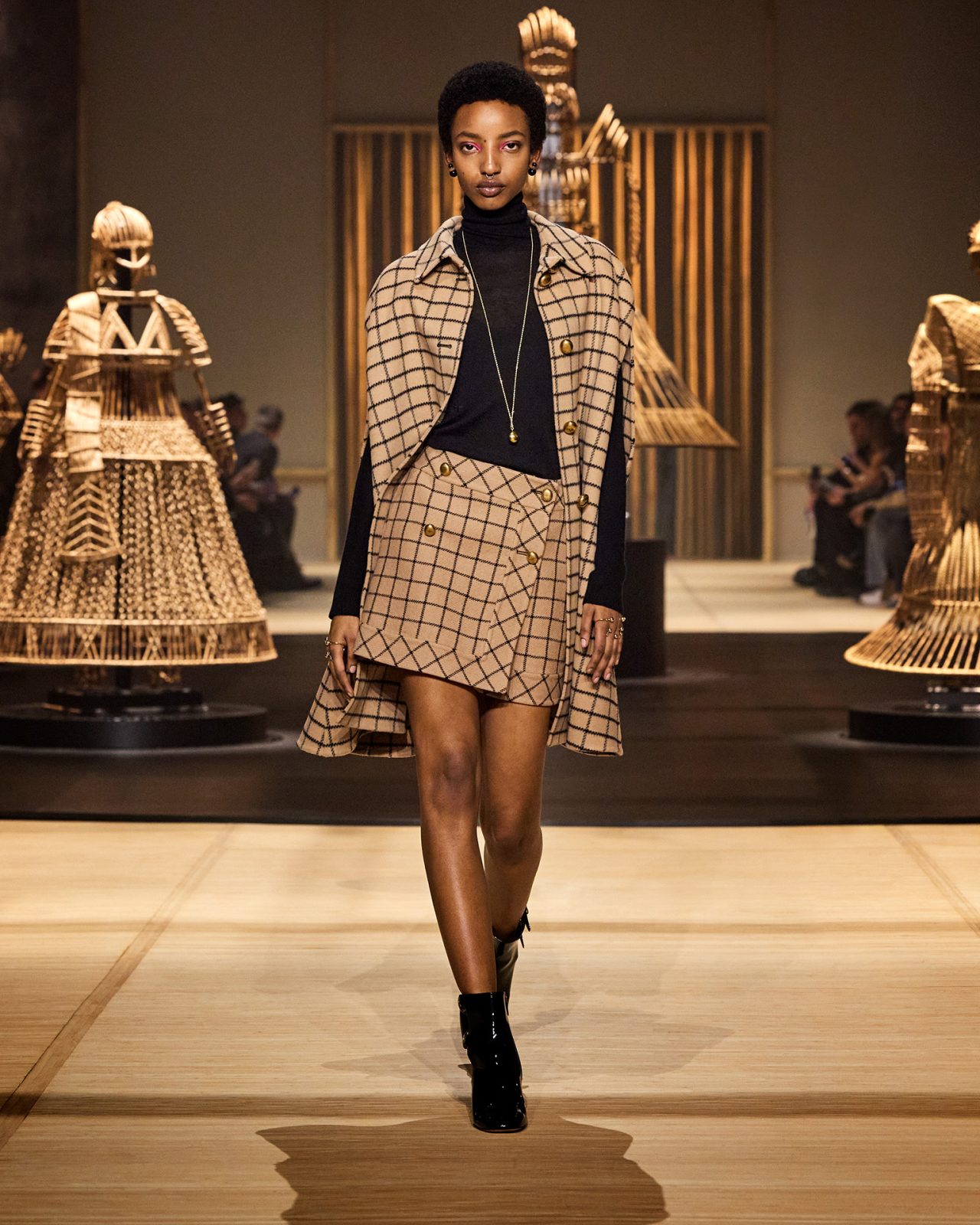 2016年の就任以来、現代を生きる女性たちに力強いメッセージを送り続ける Maria Grazia Chiuri。今回のコレクションでもその信条は変わらない。会場でまず来場者を迎えるのは、インド人アーティスト Shakuntala Kulkarni (シャクンタラ・クルカルニ) のインスタレーション作品だ。自身がデザインした籐製の甲冑を身に着けた Kulkarni の写真は、各々の「戦い」に向かう女性たちの決意を象徴するかのようだ。女性がファッションを通して自分自身を表現し始めた60年代に誕生したコレクションから着想を得ただけあって、ブラックのタートルネック、ミニスカート、レオパード柄など当時の流行をたっぷりと取り入れたランウェイとなった。