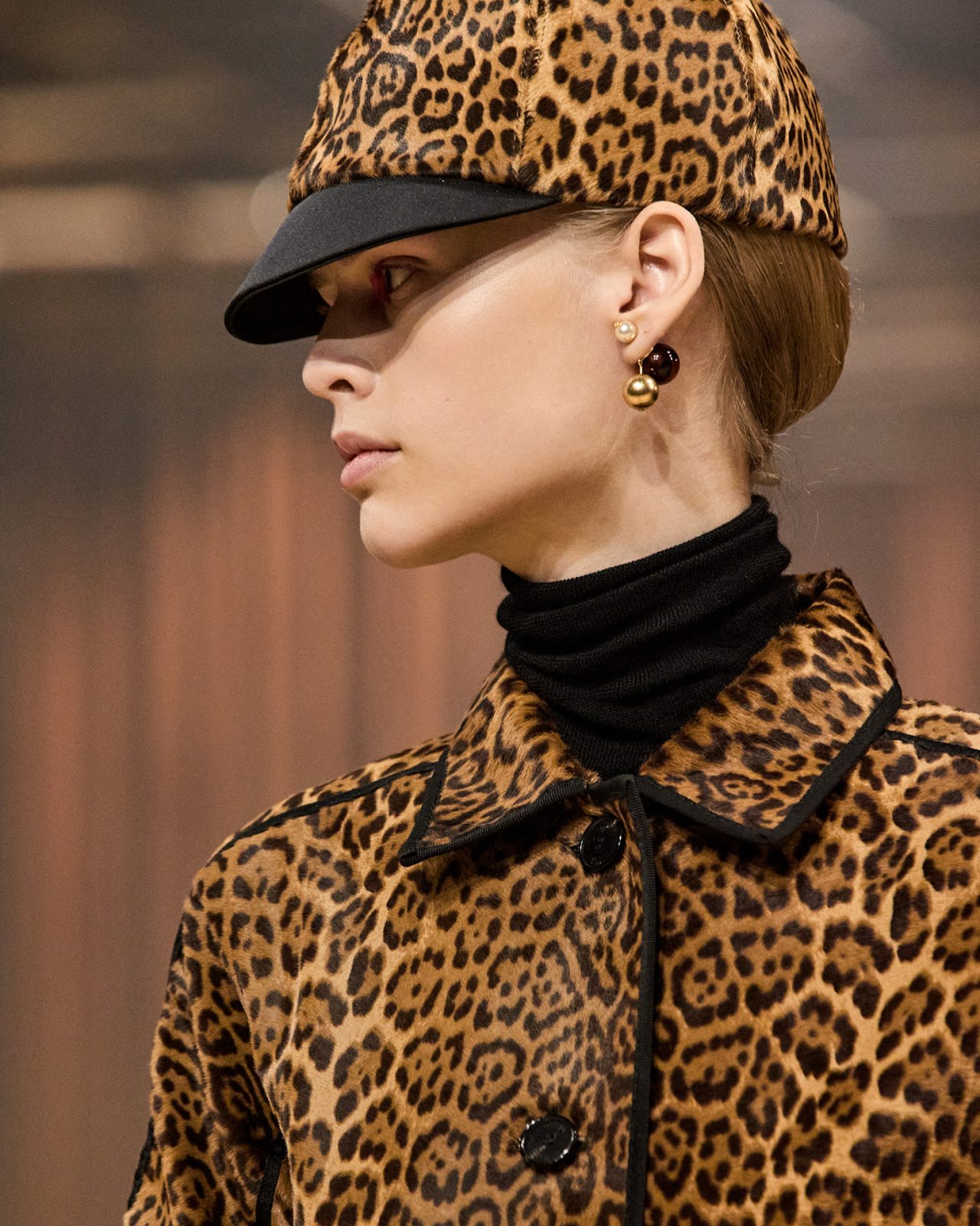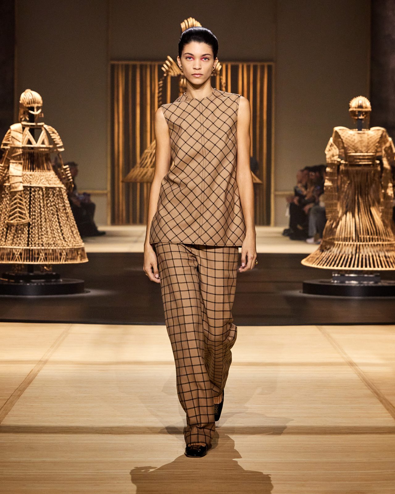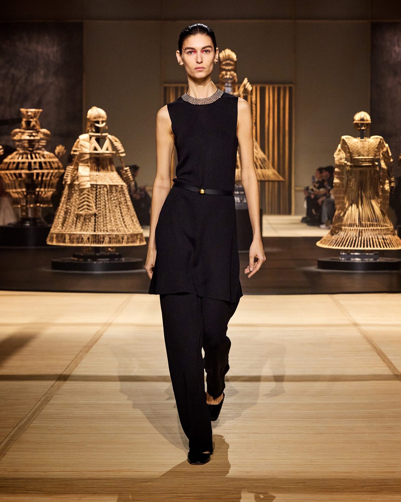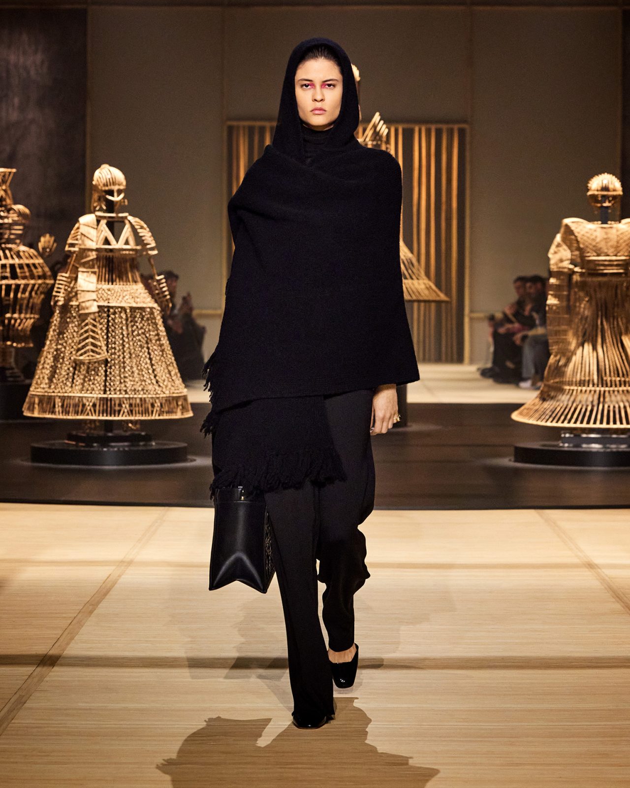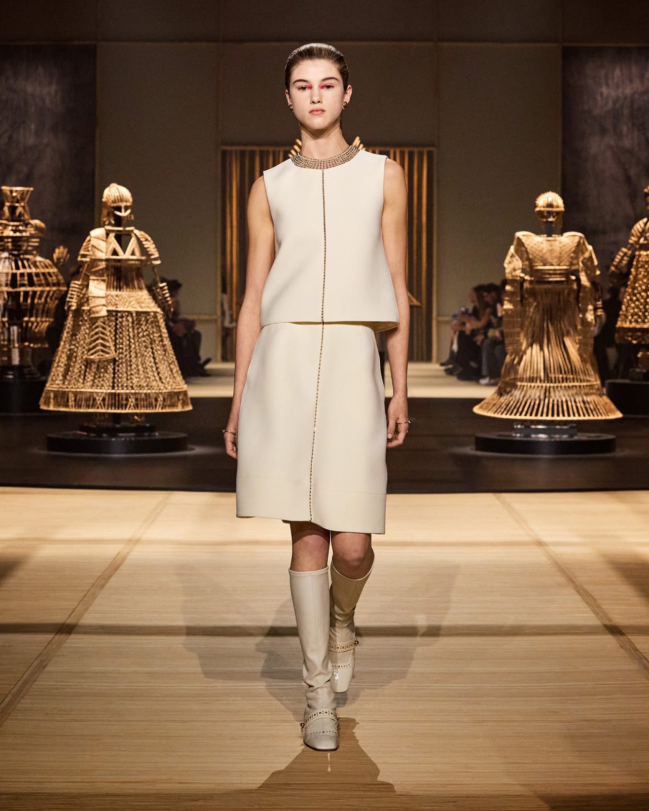 2016年の就任以来、現代を生きる女性たちに力強いメッセージを送り続ける Maria Grazia Chiuri。今回のコレクションでもその信条は変わらない。会場でまず来場者を迎えるのは、インド人アーティスト Shakuntala Kulkarni (シャクンタラ・クルカルニ) のインスタレーション作品だ。自身がデザインした籐製の甲冑を身に着けた Kulkarni の写真は、各々の「戦い」に向かう女性たちの決意を象徴するかのようだ。女性がファッションを通して自分自身を表現し始めた60年代に誕生したコレクションから着想を得ただけあって、ブラックのタートルネック、ミニスカート、レオパード柄など当時の流行をたっぷりと取り入れたランウェイとなった。