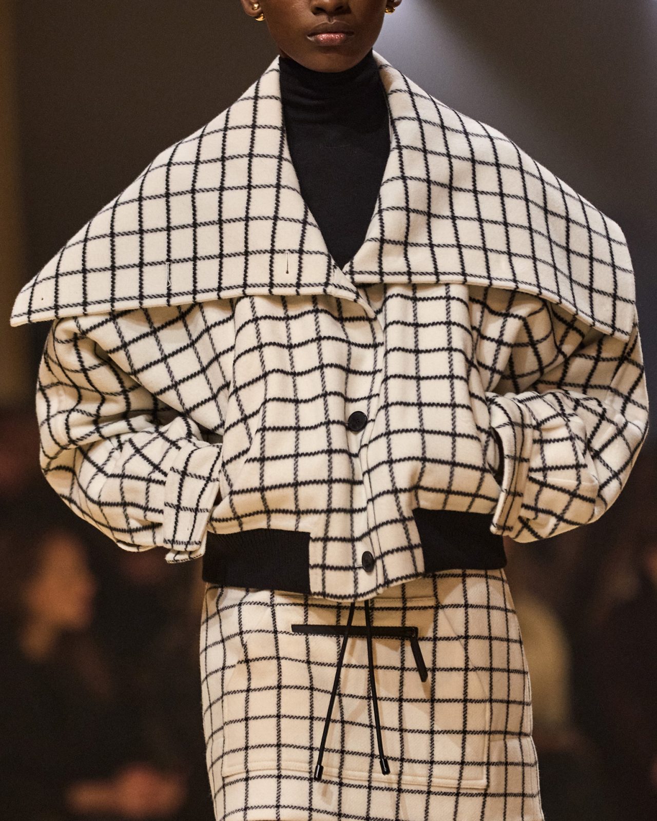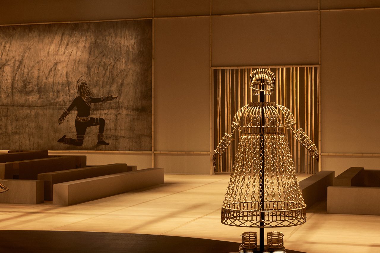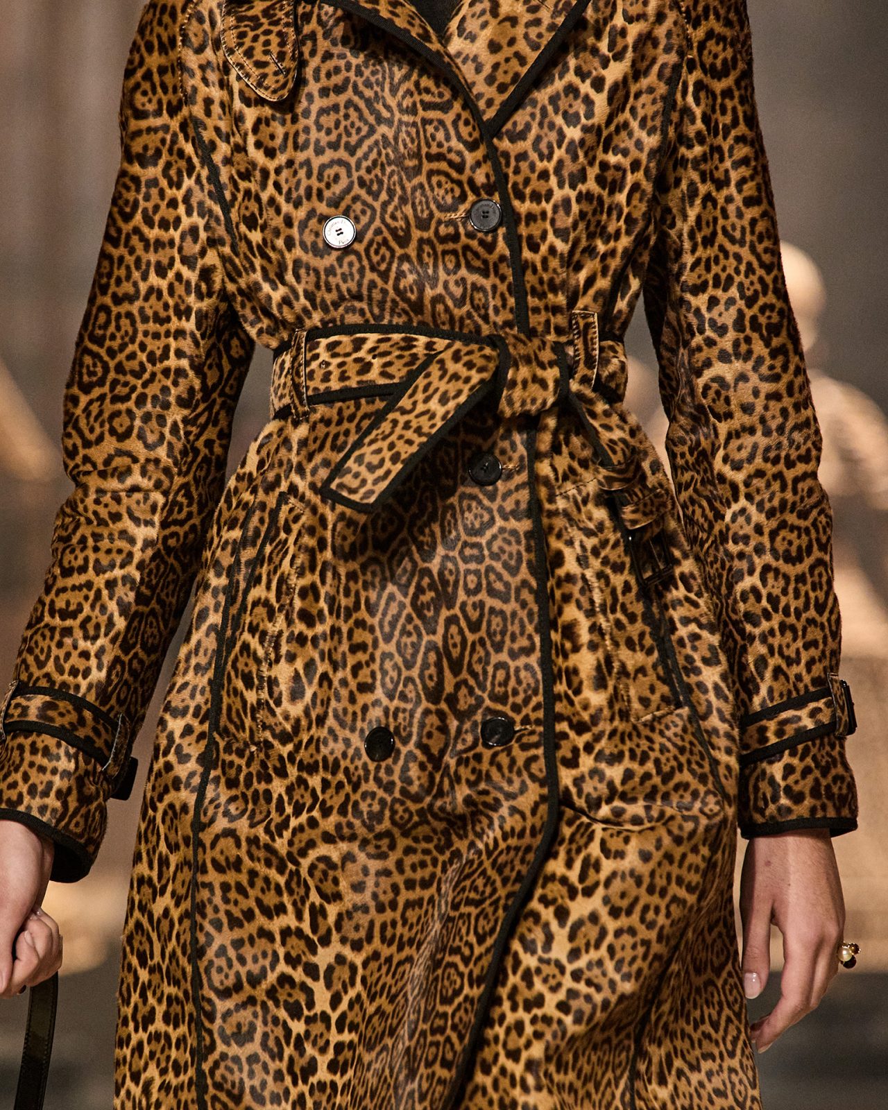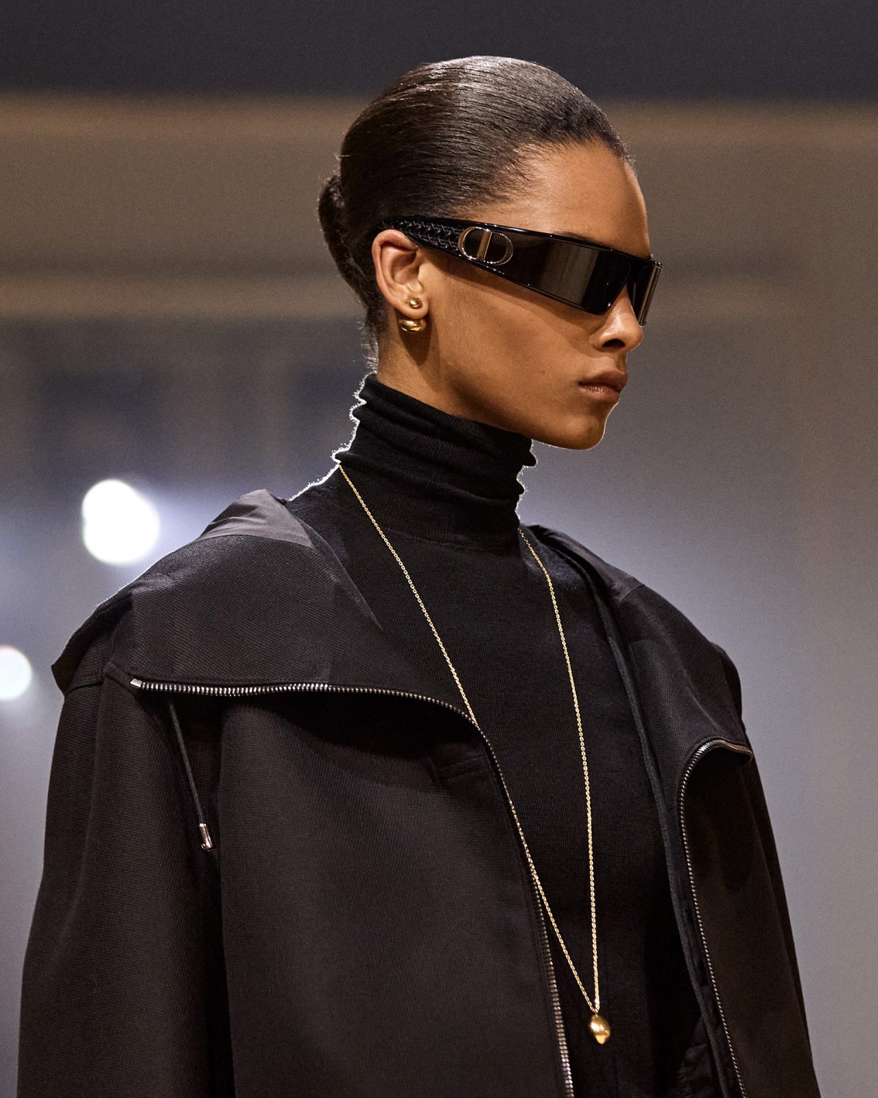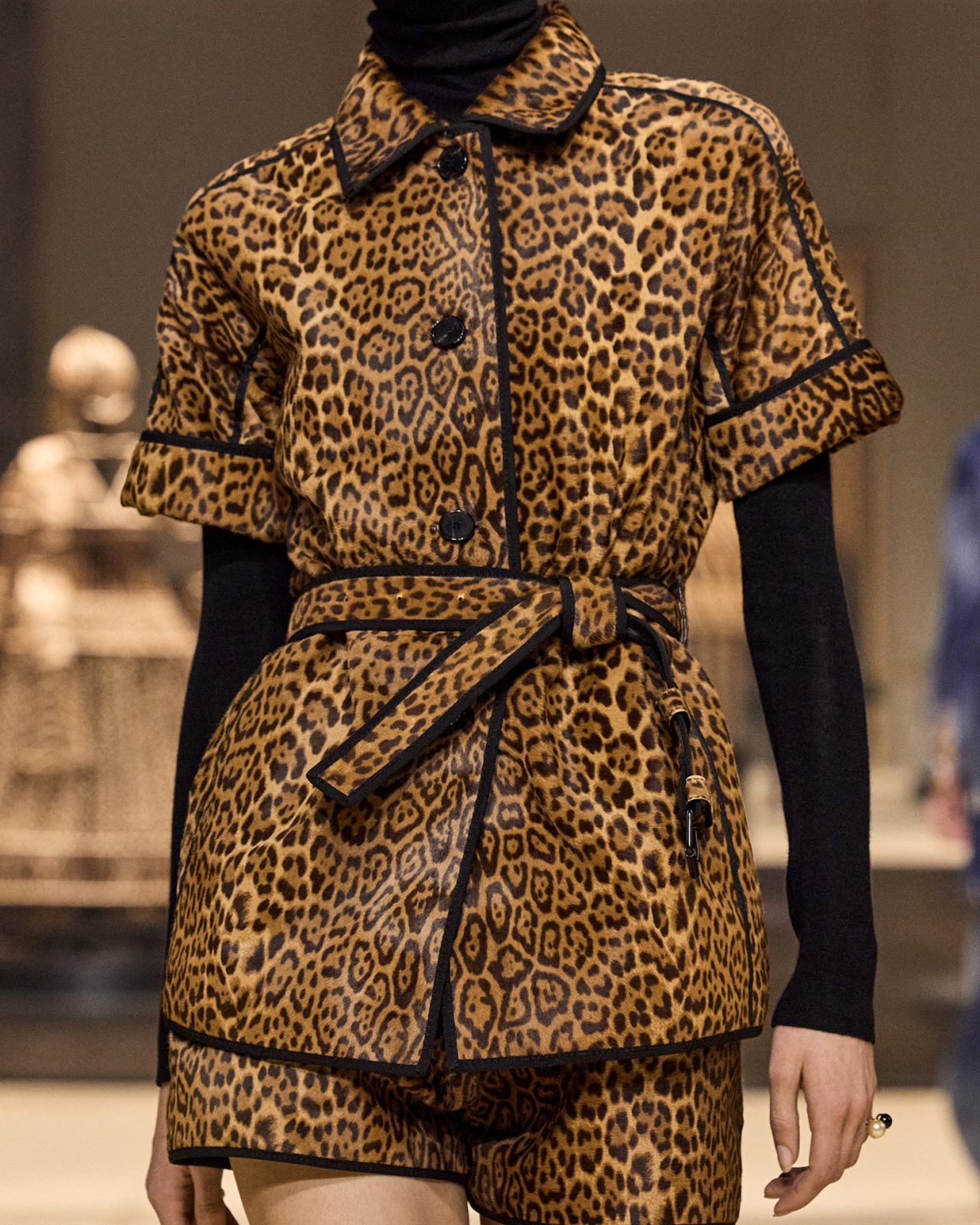 2016年の就任以来、現代を生きる女性たちに力強いメッセージを送り続ける Maria Grazia Chiuri。今回のコレクションでもその信条は変わらない。会場でまず来場者を迎えるのは、インド人アーティスト Shakuntala Kulkarni (シャクンタラ・クルカルニ) のインスタレーション作品だ。自身がデザインした籐製の甲冑を身に着けた Kulkarni の写真は、各々の「戦い」に向かう女性たちの決意を象徴するかのようだ。女性がファッションを通して自分自身を表現し始めた60年代に誕生したコレクションから着想を得ただけあって、ブラックのタートルネック、ミニスカート、レオパード柄など当時の流行をたっぷりと取り入れたランウェイとなった。