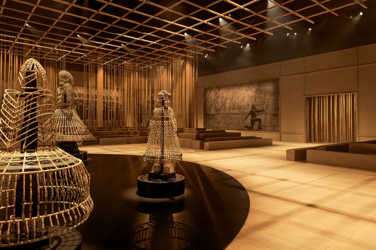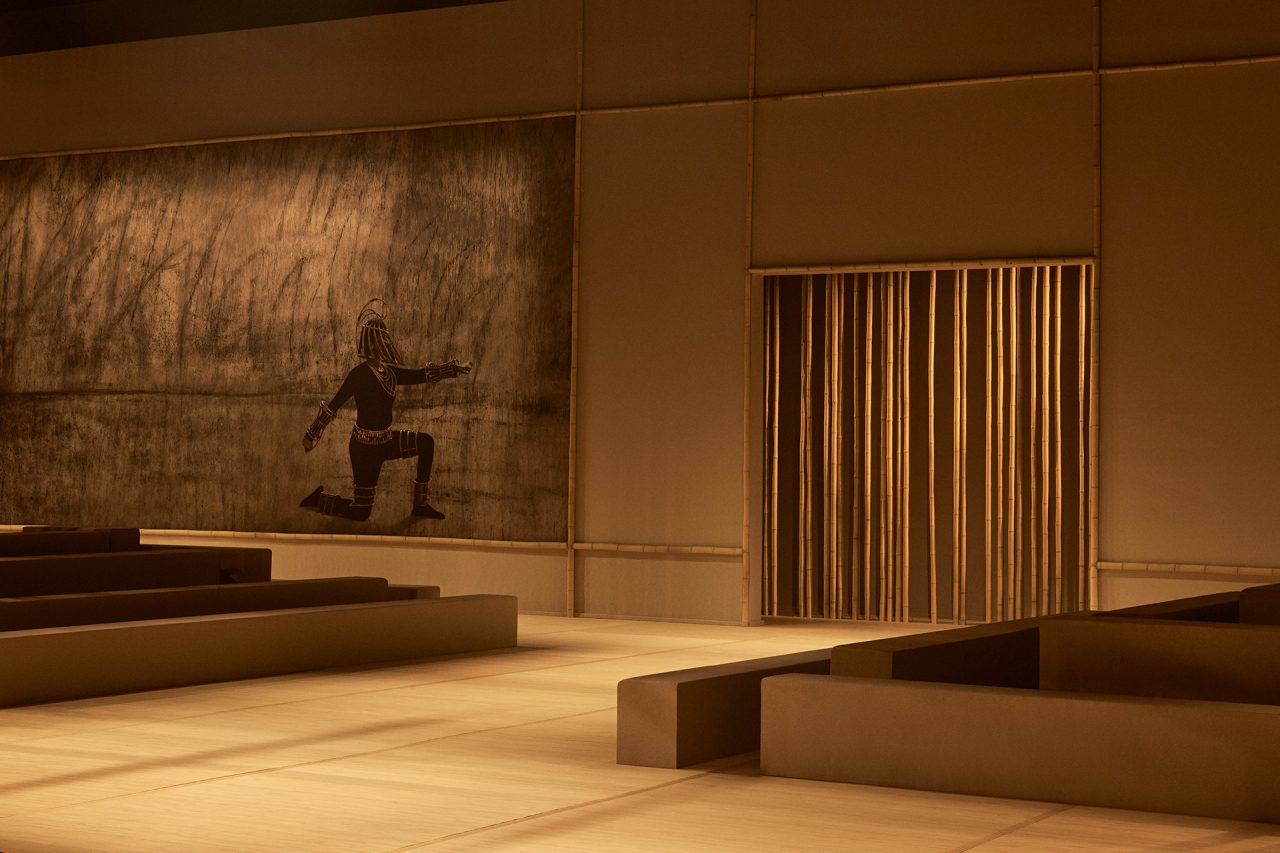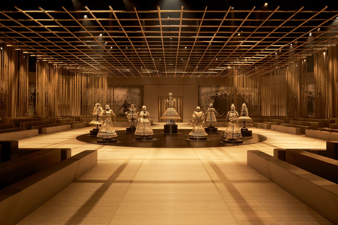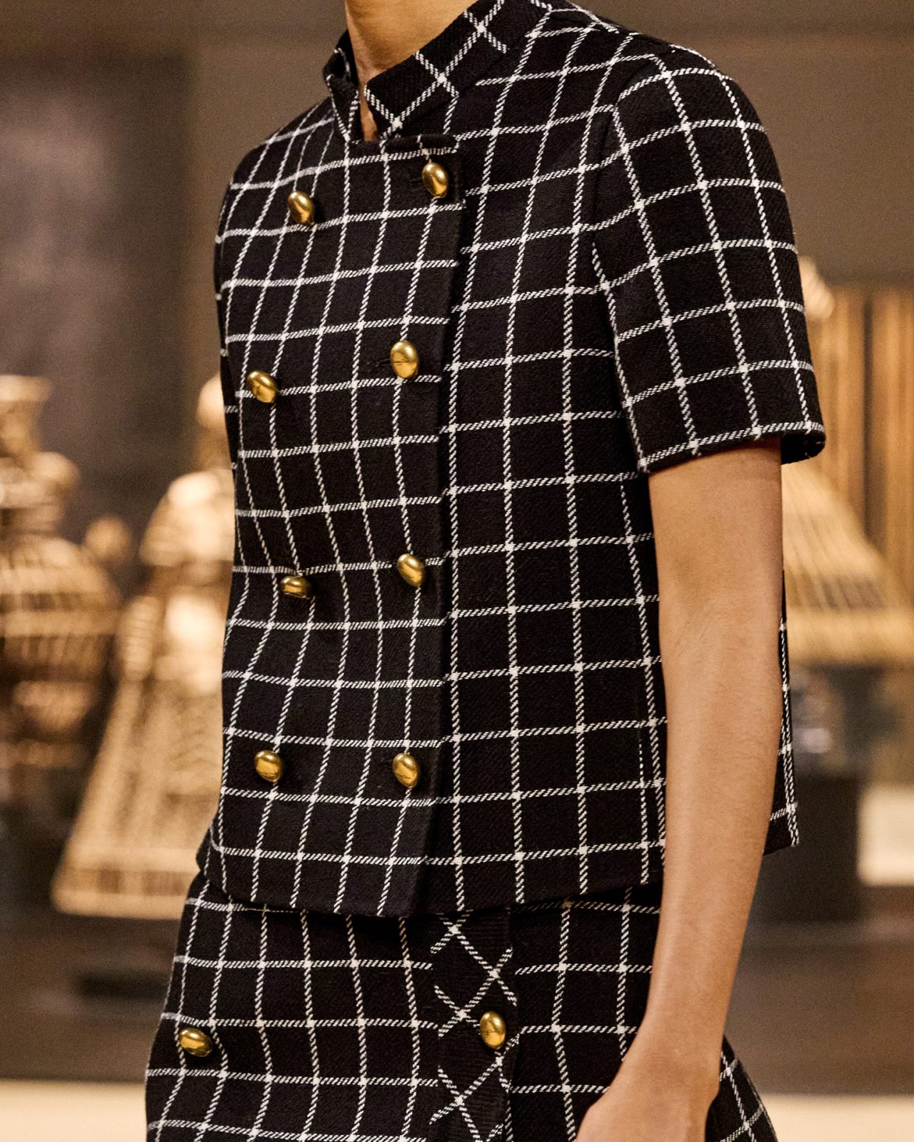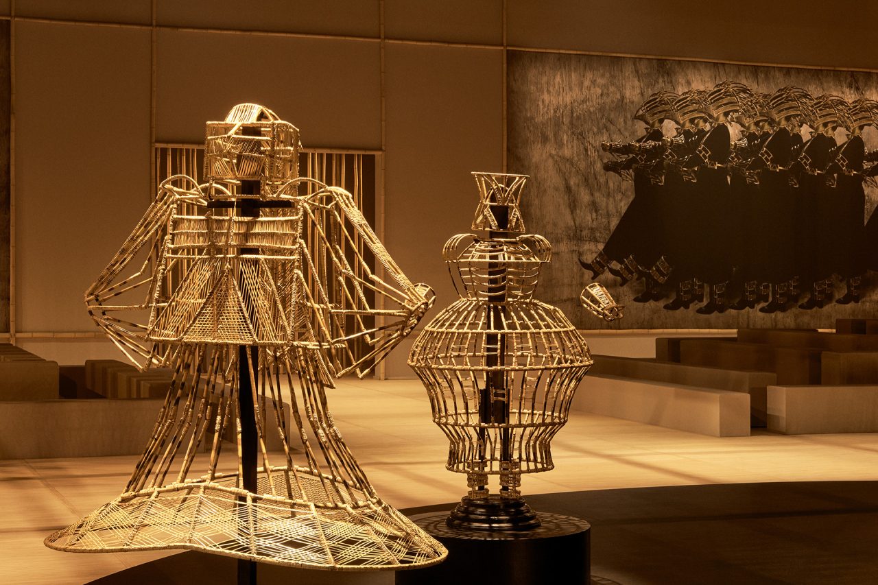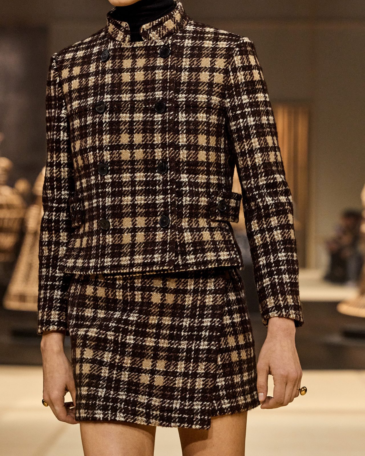 2016年の就任以来、現代を生きる女性たちに力強いメッセージを送り続ける Maria Grazia Chiuri。今回のコレクションでもその信条は変わらない。会場でまず来場者を迎えるのは、インド人アーティスト Shakuntala Kulkarni (シャクンタラ・クルカルニ) のインスタレーション作品だ。自身がデザインした籐製の甲冑を身に着けた Kulkarni の写真は、各々の「戦い」に向かう女性たちの決意を象徴するかのようだ。女性がファッションを通して自分自身を表現し始めた60年代に誕生したコレクションから着想を得ただけあって、ブラックのタートルネック、ミニスカート、レオパード柄など当時の流行をたっぷりと取り入れたランウェイとなった。